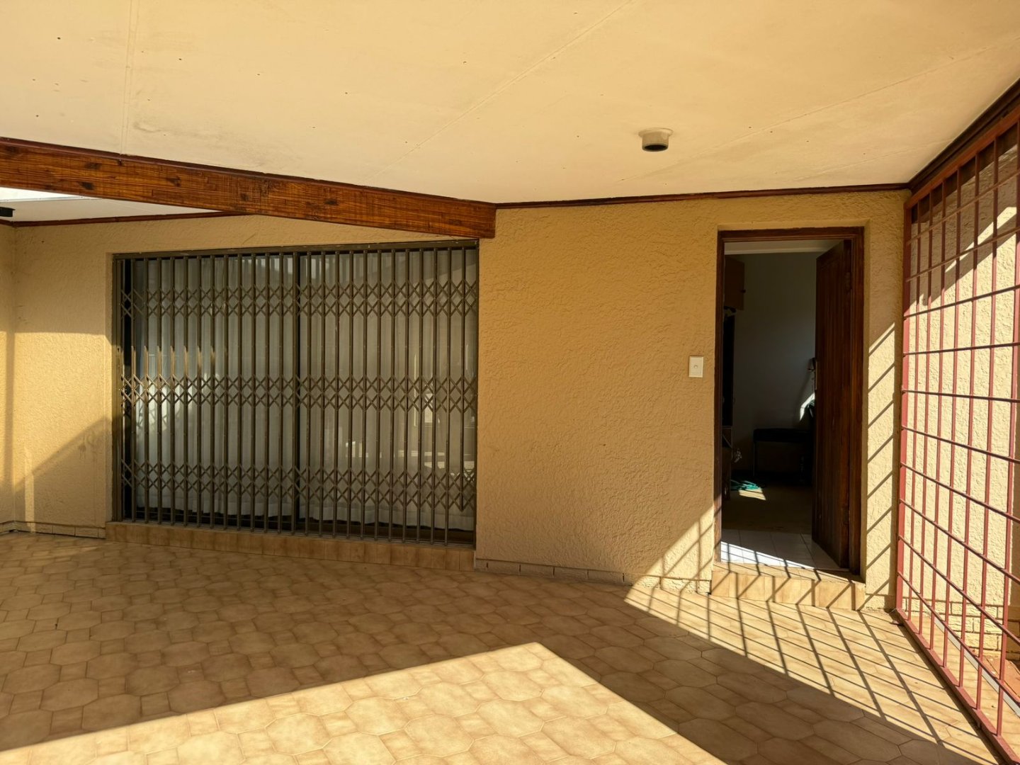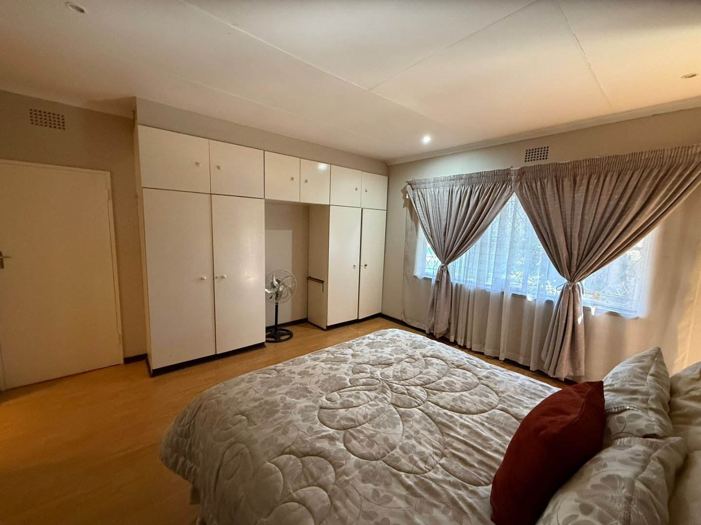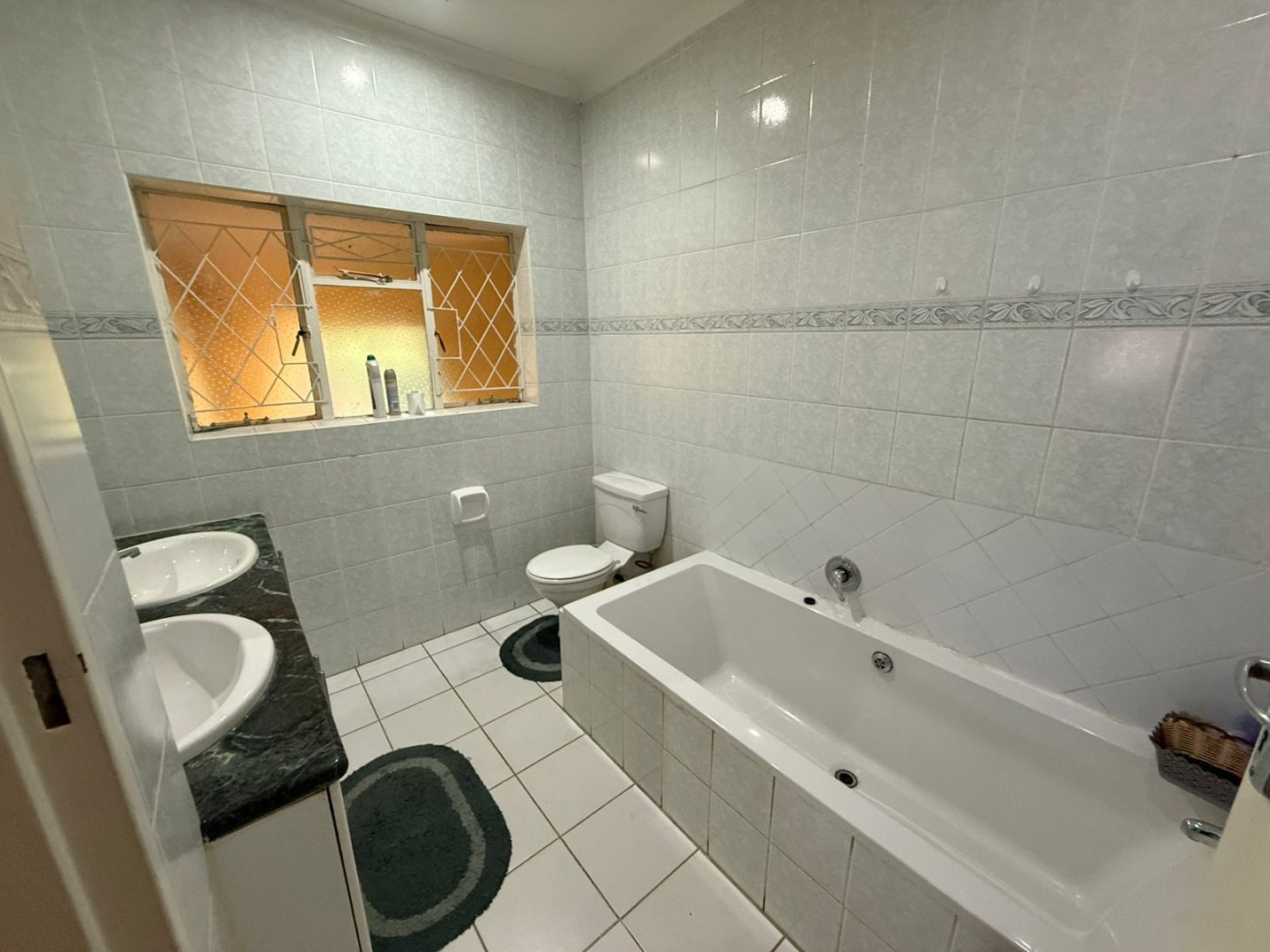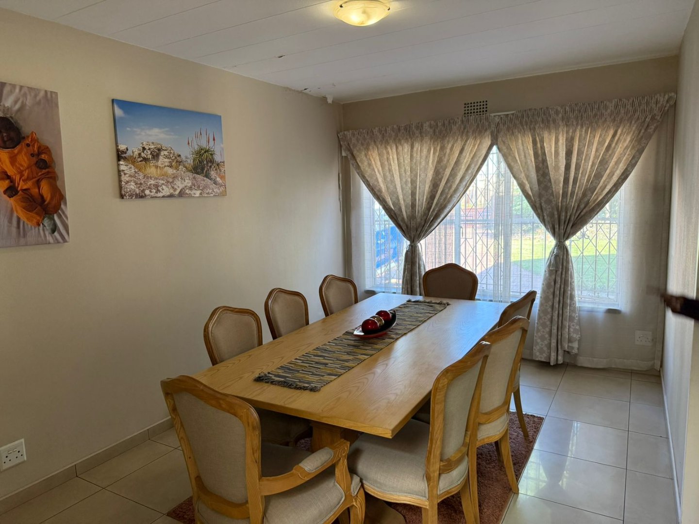 A spacious lounge and separate dining room, kitchen with scullery and independent laundry room, four well-proportioned bedrooms with laminated flooring and built-in cupboards, two full bathrooms including a main en suite with its own private lounge retreat, plus a roomy study with fitted shelving and cupboards—perfect for a home office.