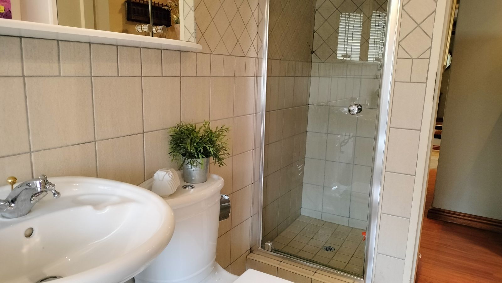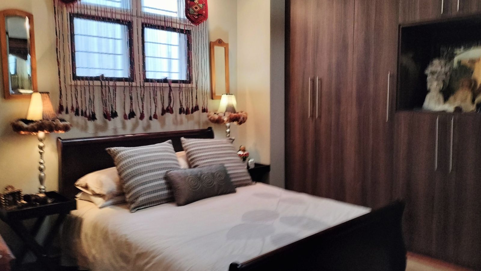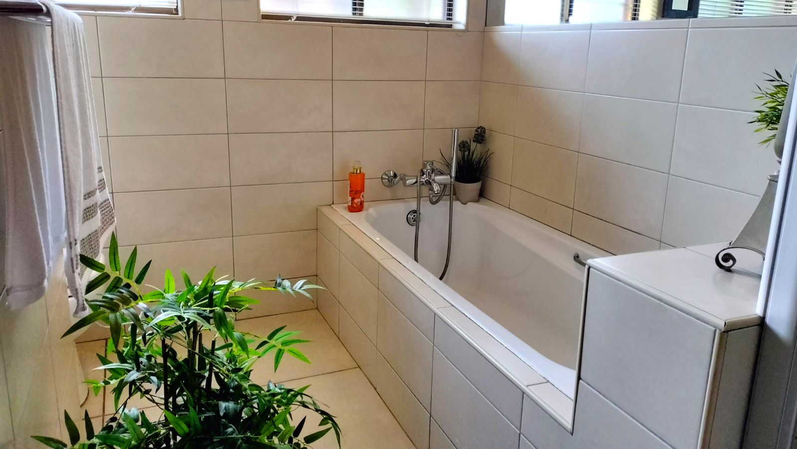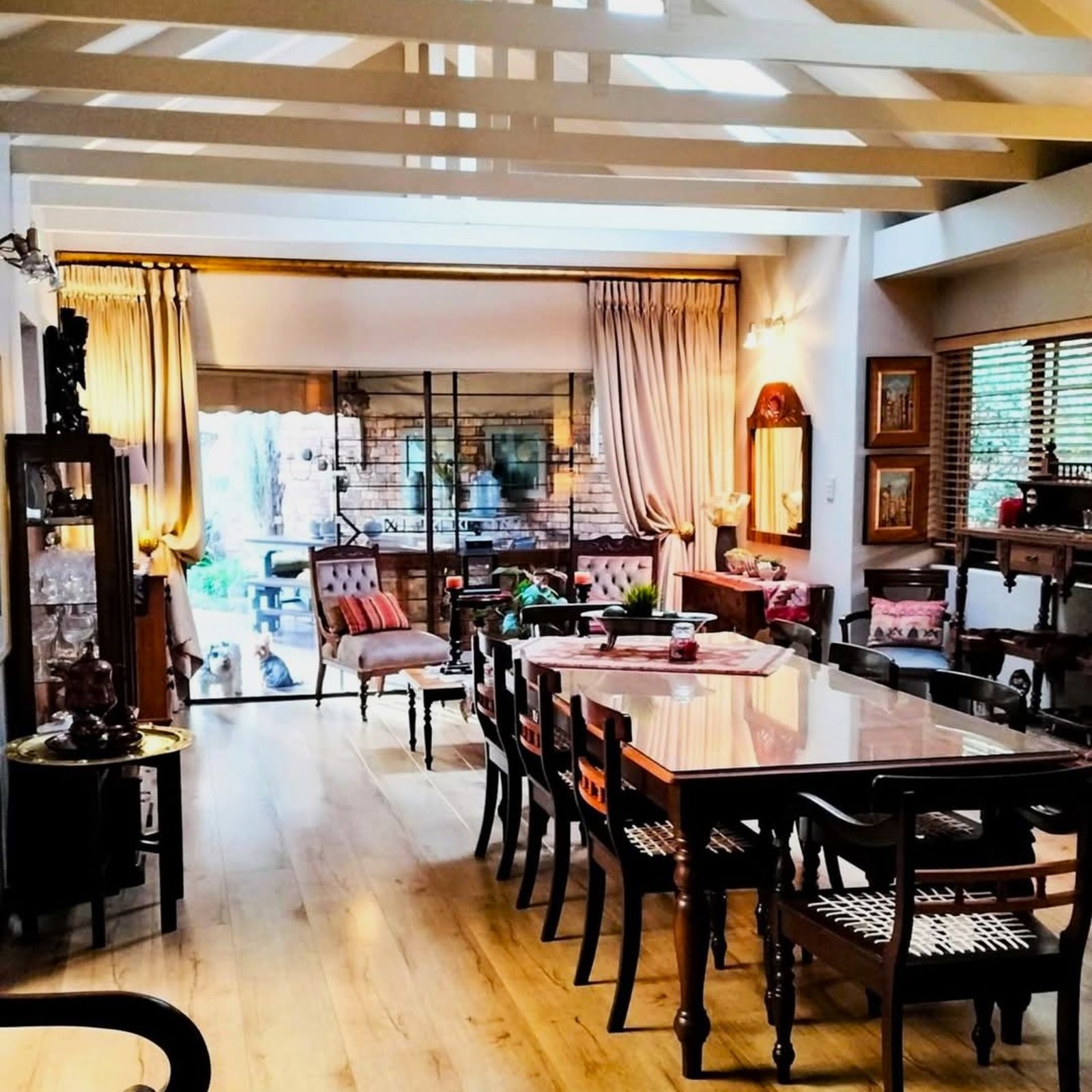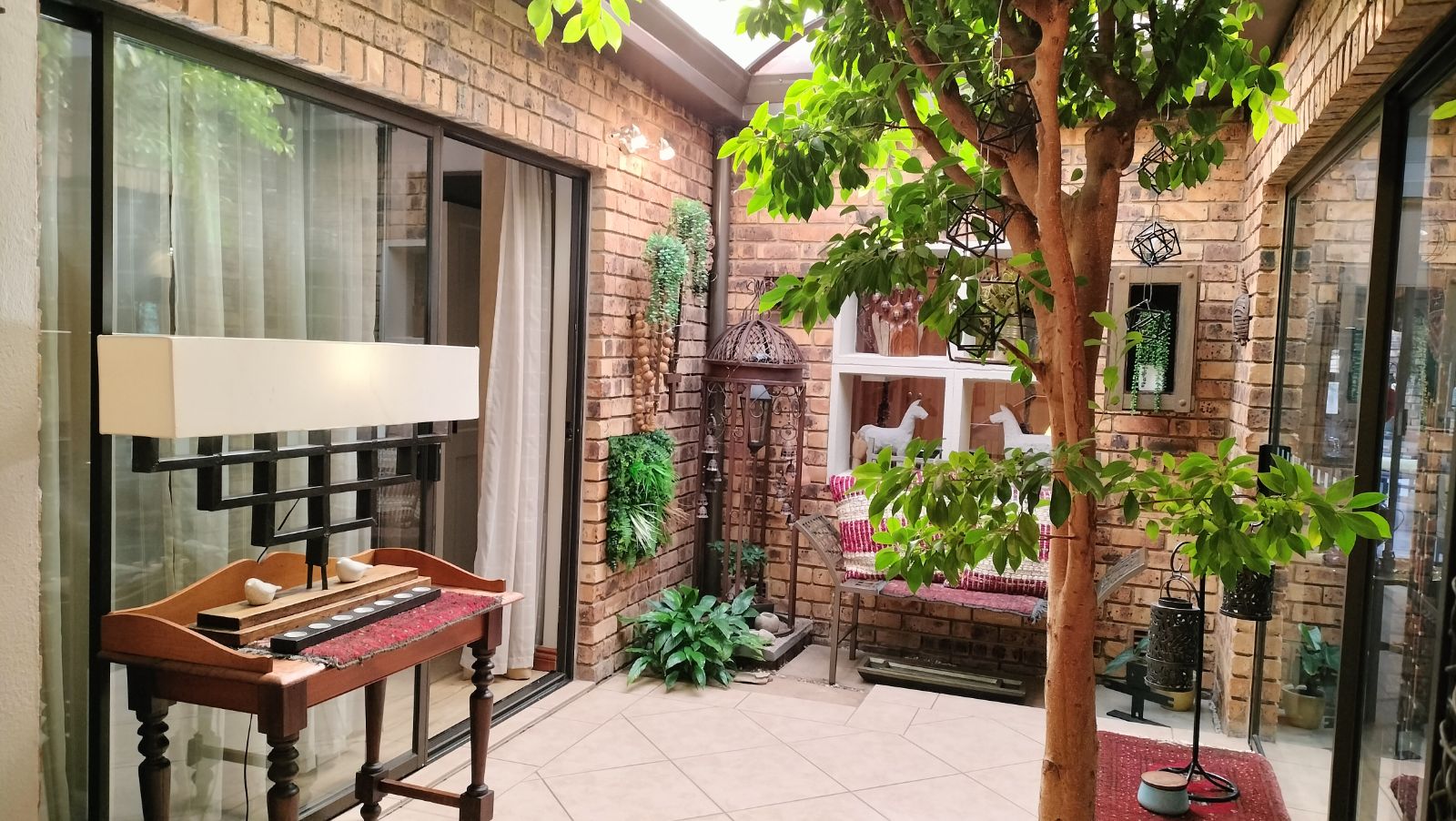 The home features both a formal lounge and an additional TV room, with the latter also offering underfloor heating. The expansive dining and entertainment area is a standout feature, complete with air conditioning and elegant trusses, that also features in the three bedrooms t add a sense of grandeur. This space flows effortlessly into a serene atrium, which then connects to the second bedroom. This bedroom is finished with laminated flooring, built-in cupboards, and a modern en-suite bathroom with a shower, vanity, and toilet.