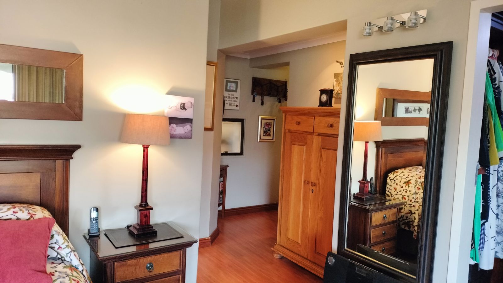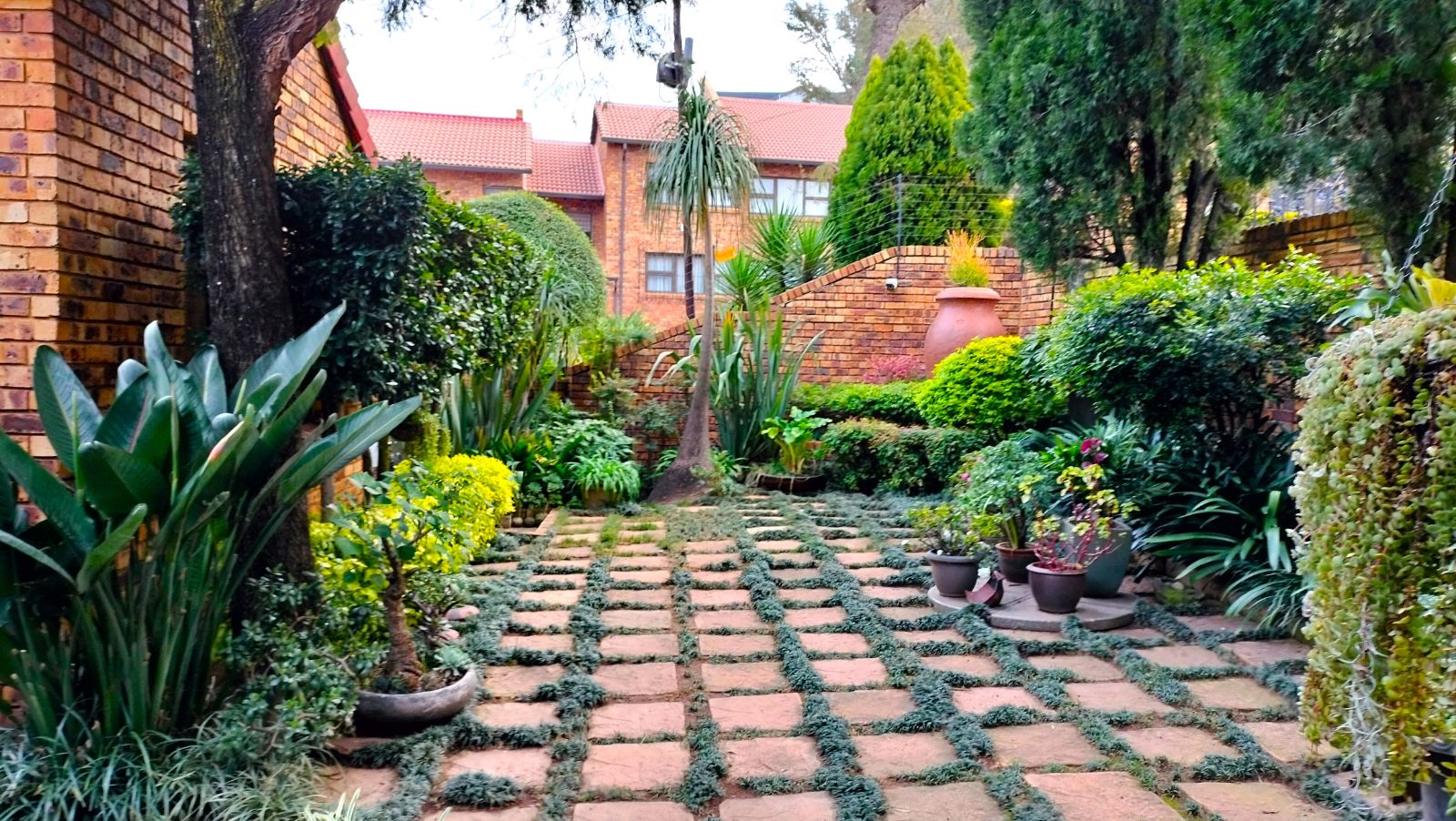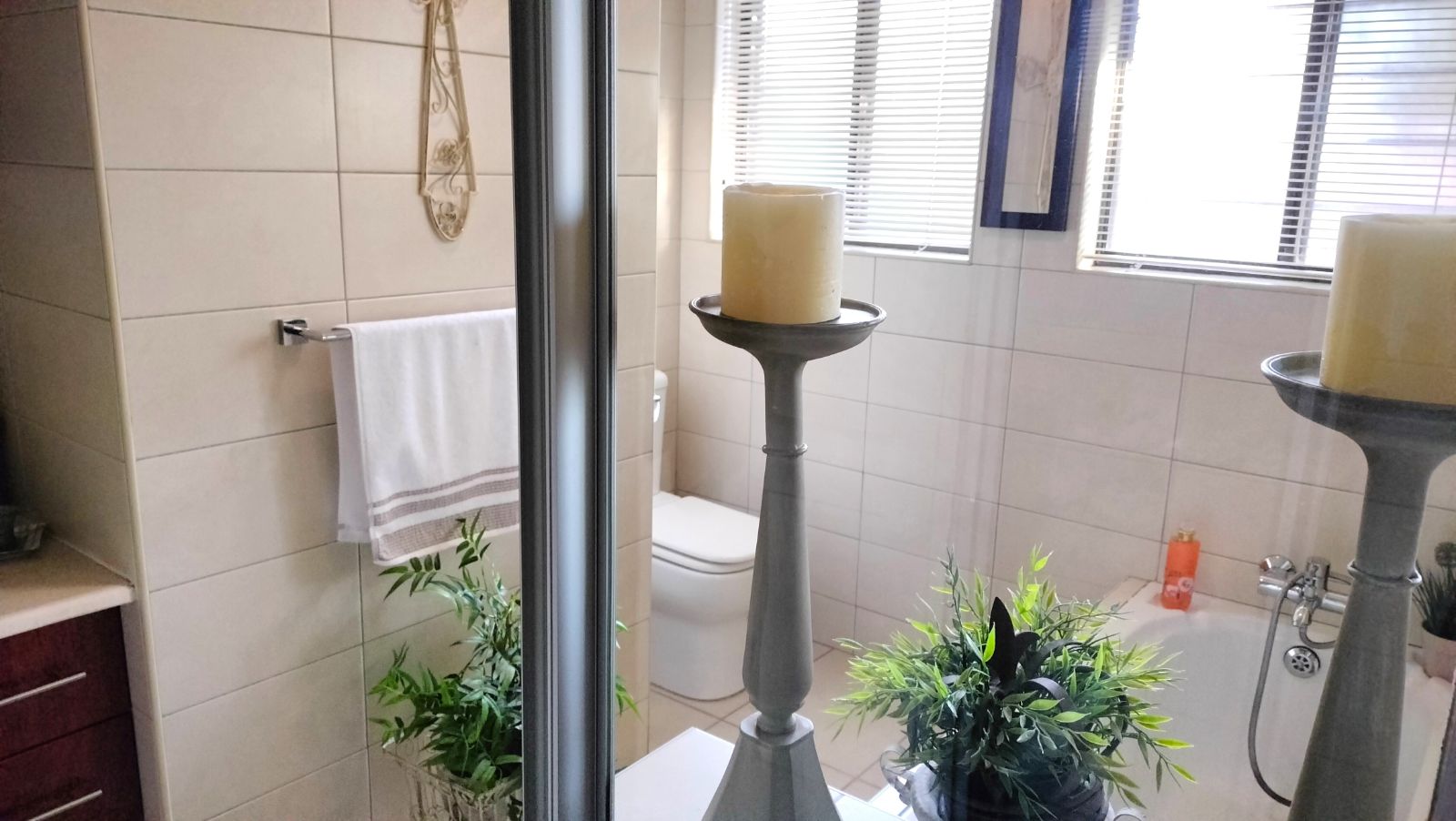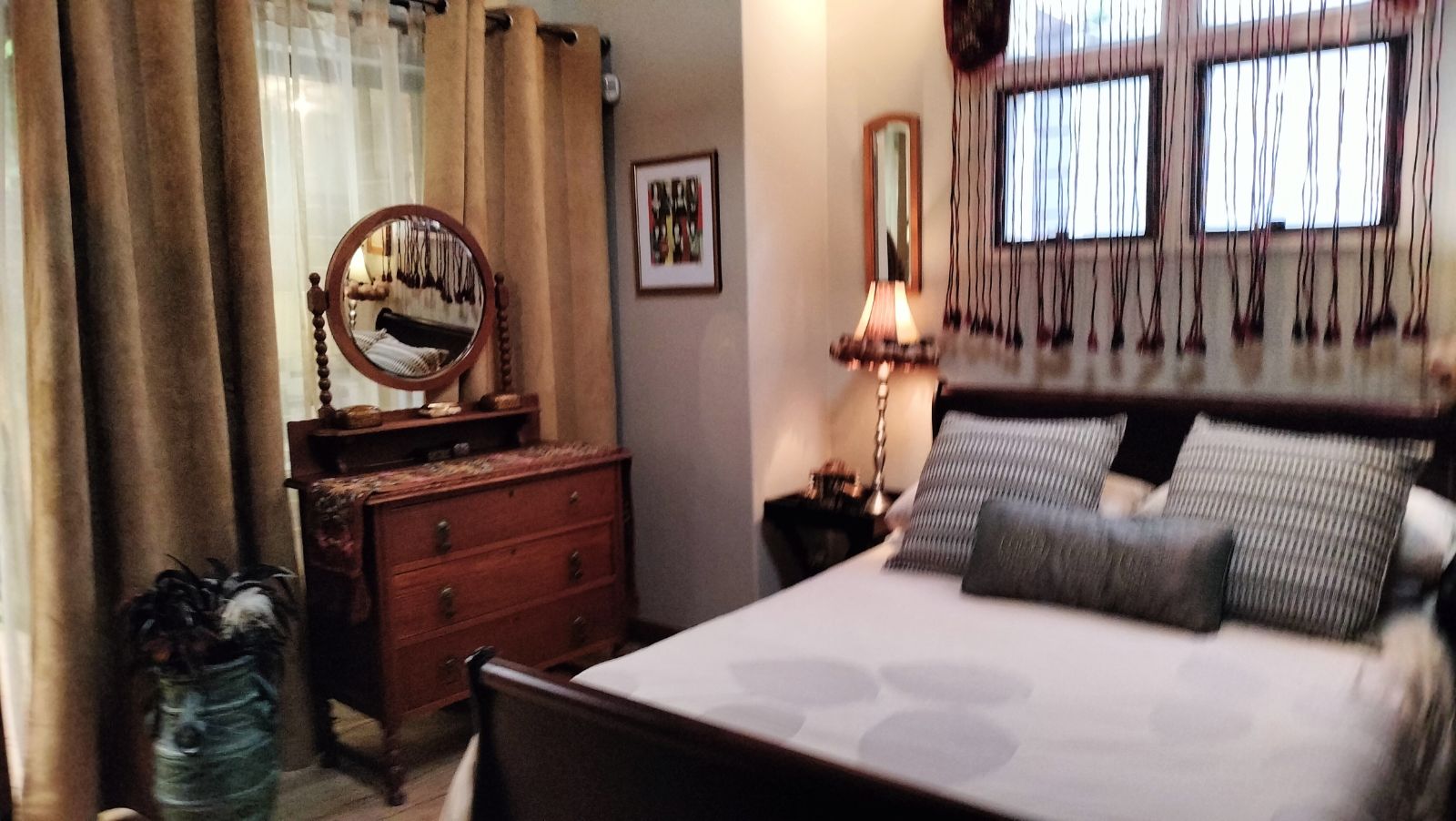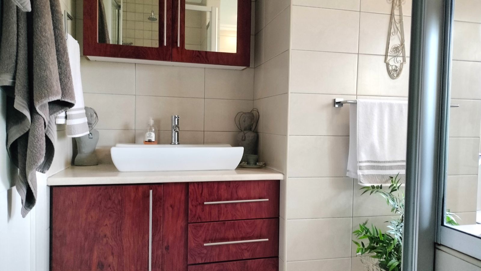 The home features both a formal lounge and an additional TV room, with the latter also offering underfloor heating. The expansive dining and entertainment area is a standout feature, complete with air conditioning and elegant trusses, that also features in the three bedrooms t add a sense of grandeur. This space flows effortlessly into a serene atrium, which then connects to the second bedroom. This bedroom is finished with laminated flooring, built-in cupboards, and a modern en-suite bathroom with a shower, vanity, and toilet.
