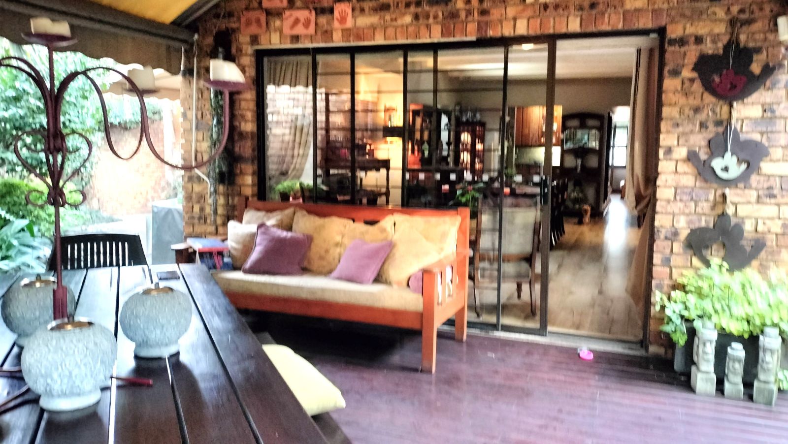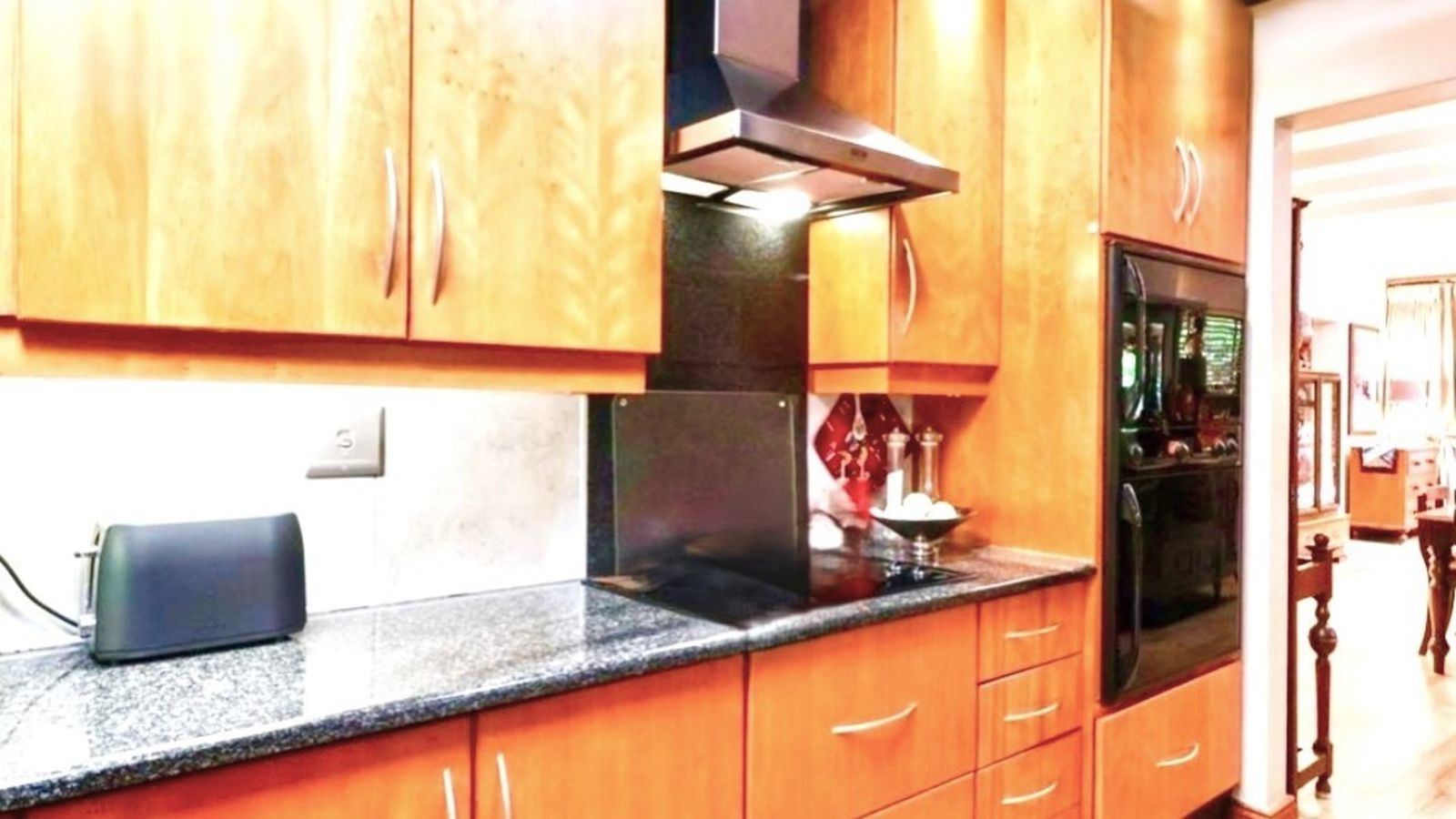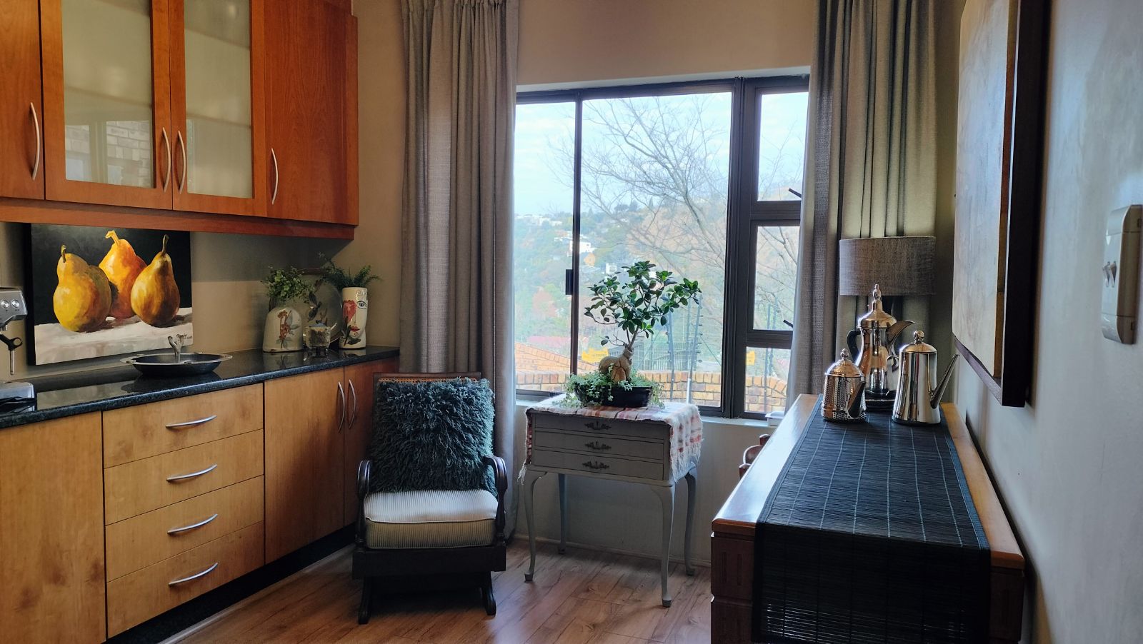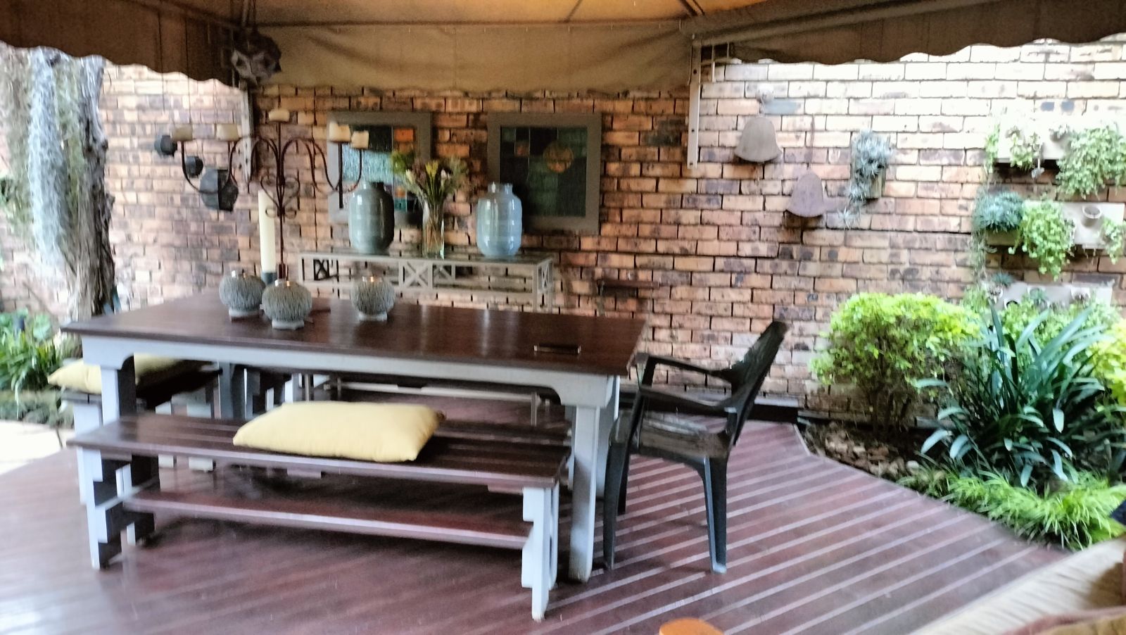 The dining area opens onto a covered deck with canvas blinds, creating a peaceful outdoor retreat where you can enjoy the immaculate garden year-round. The modern kitchen is fitted with granite countertops, vinyl flooring, and a separate scullery and laundry area, along with an inviting breakfast room to enjoy your morning coffee.