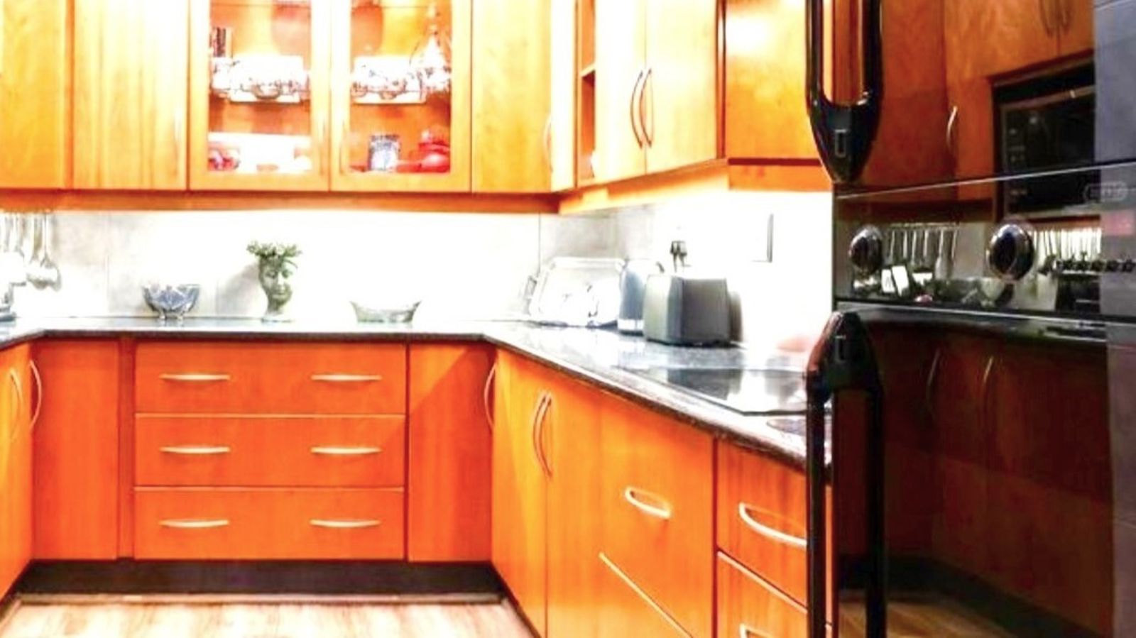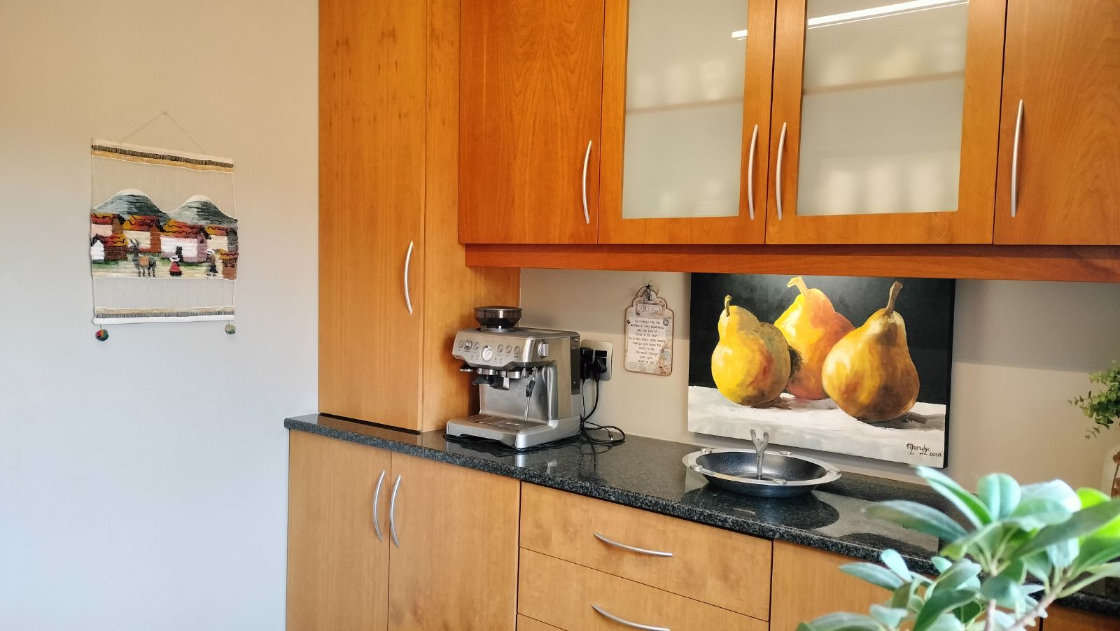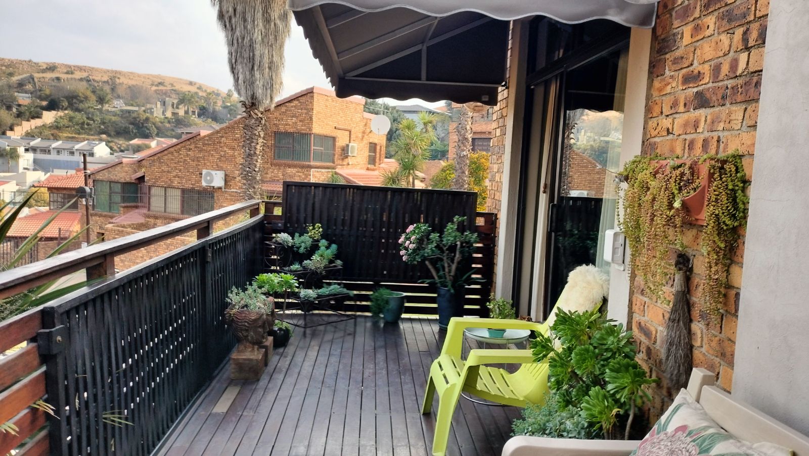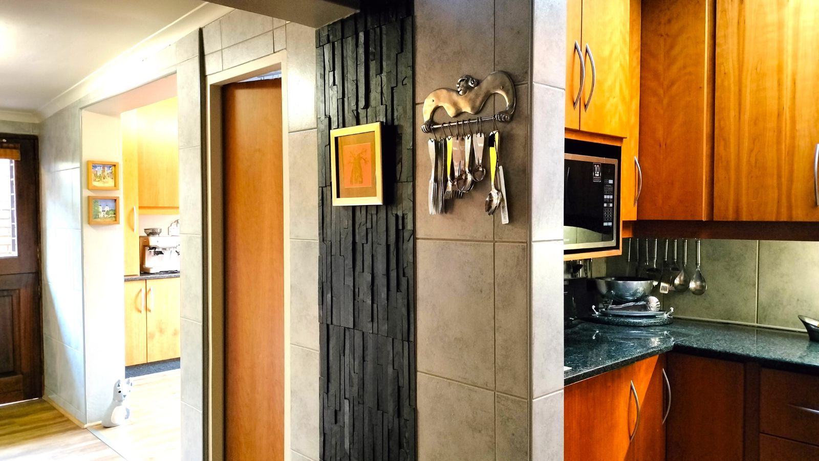 The dining area opens onto a covered deck with canvas blinds, creating a peaceful outdoor retreat where you can enjoy the immaculate garden year-round. The modern kitchen is fitted with granite countertops, vinyl flooring, and a separate scullery and laundry area, along with an inviting breakfast room to enjoy your morning coffee.