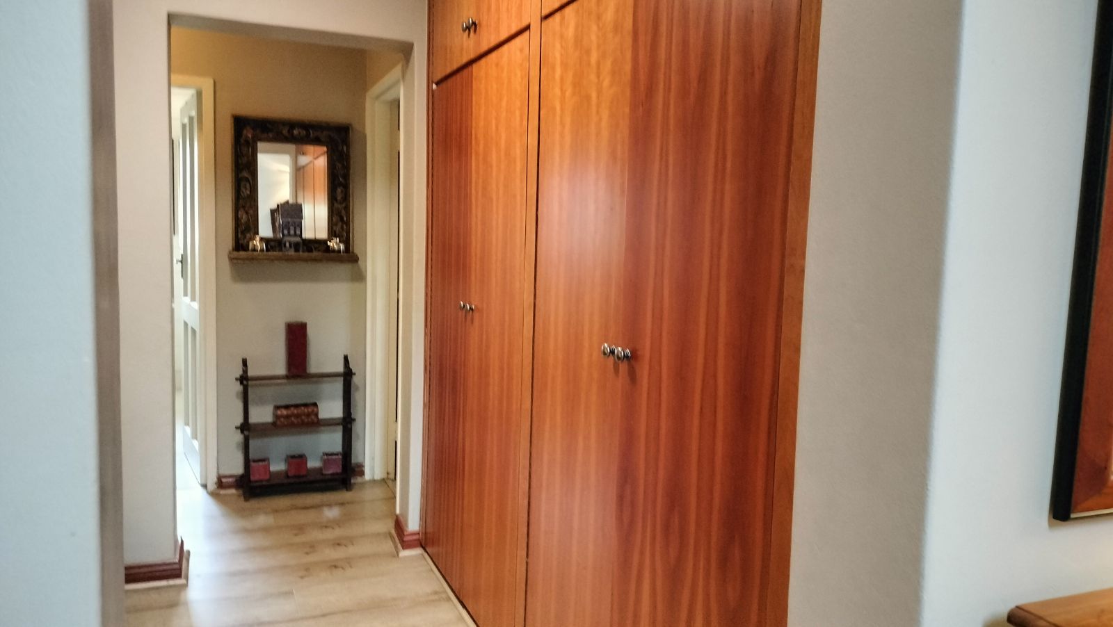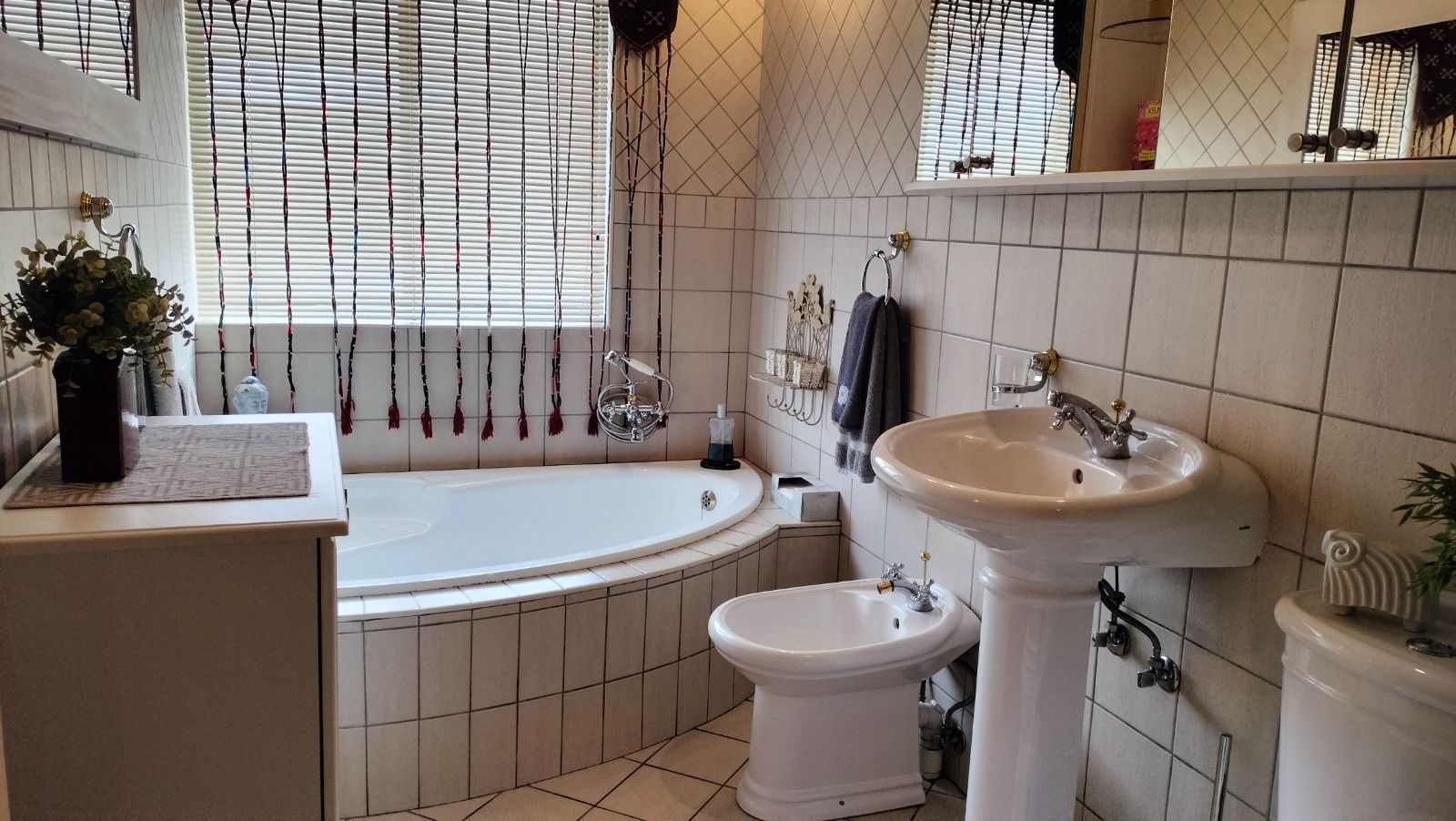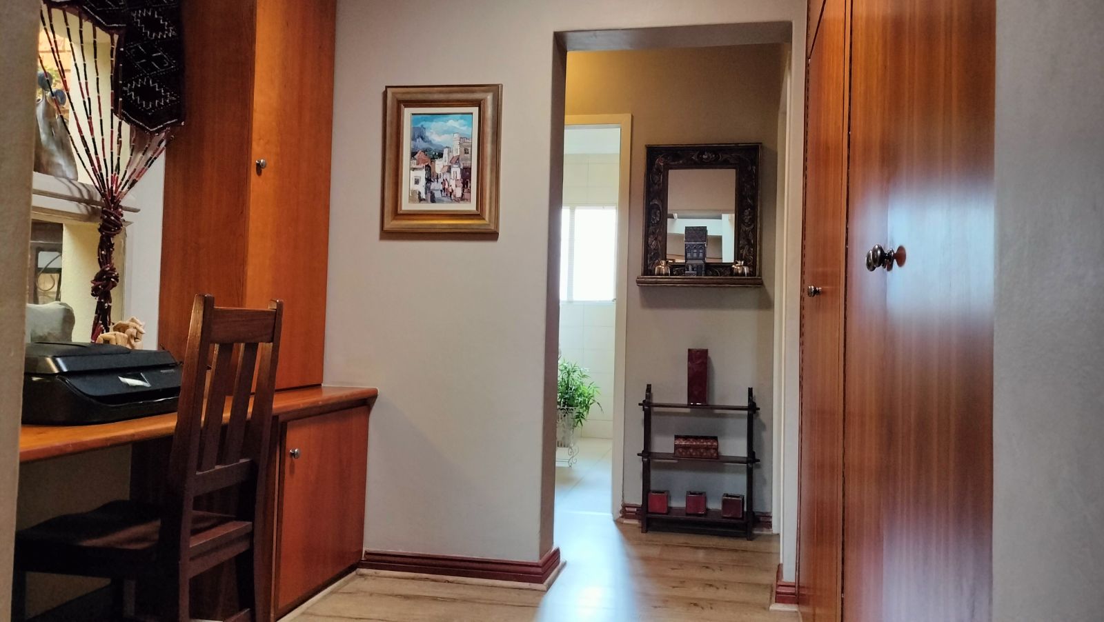 A passage leads to the third bedroom, beautifully appointed with unique panelled built-in cupboards. A stylish third bathroom featuring a bath, shower, vanity, and toilet. A walk-through study with ample built-in cupboards brings you full circle, connecting back to the heart of the open-plan living area.