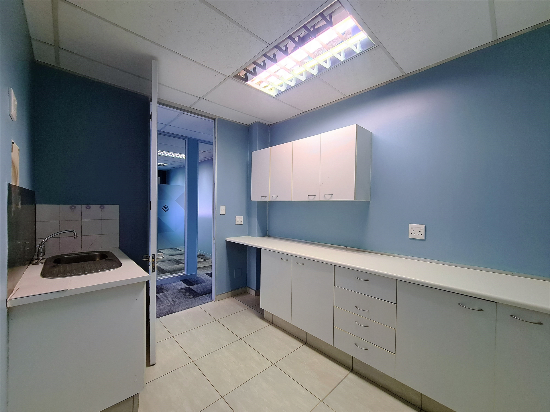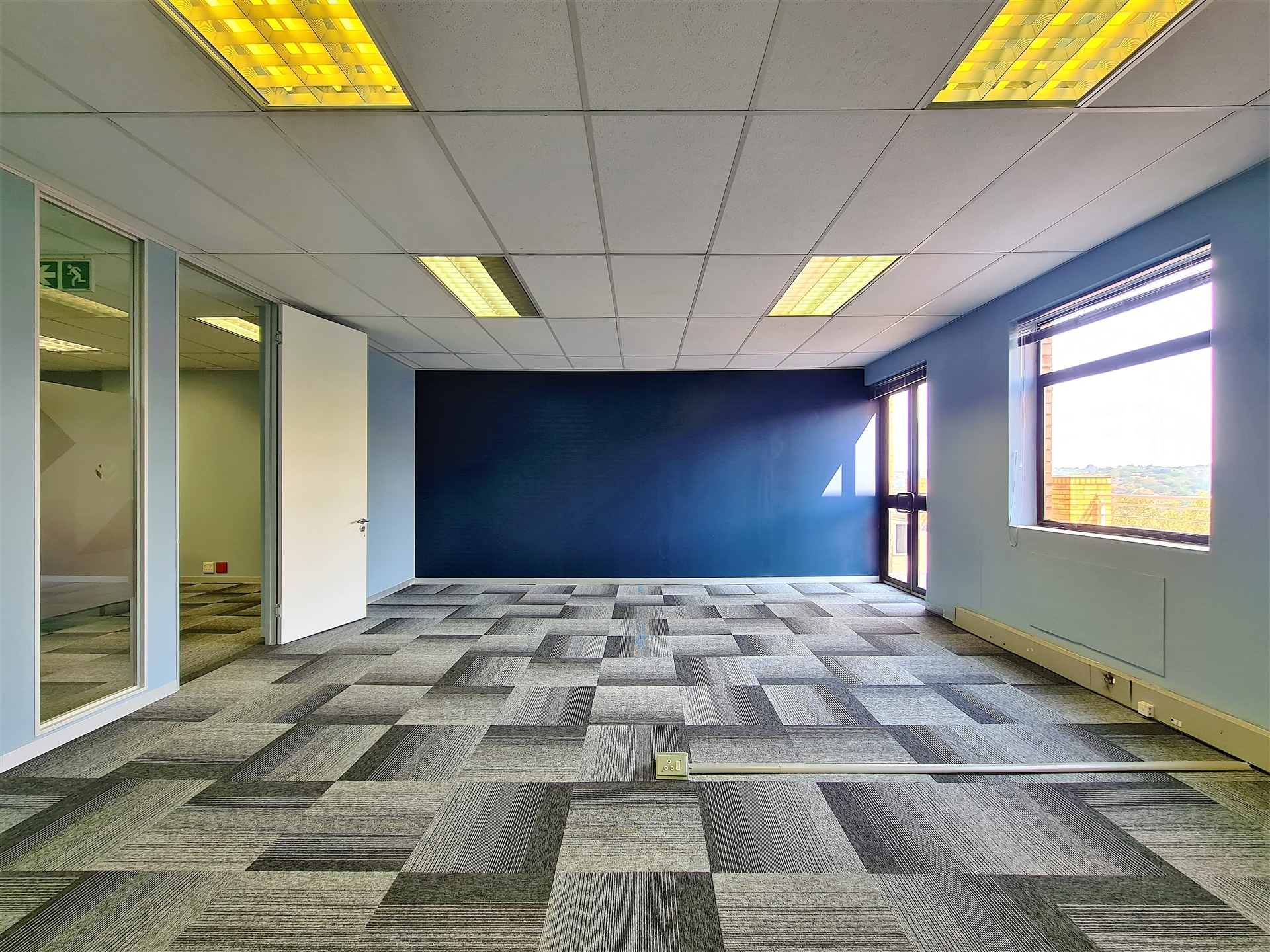 This modern office to let in Constantia Ridge Office Park welcomes you with a modern reception area followed by a spacious boardroom with direct access to a private dedicated balcony overlooking Constantia Kloof. A passage further leads you to 3 individual offices, a private dedicated kitchen and a natural light filled open plan office. The open plan office has access to 2 storerooms, 1 other spacious individual office and a private dedicated balcony. The office enjoys 2 main entrance doors. Carpeted throughout and the building is supported by a backup generator.