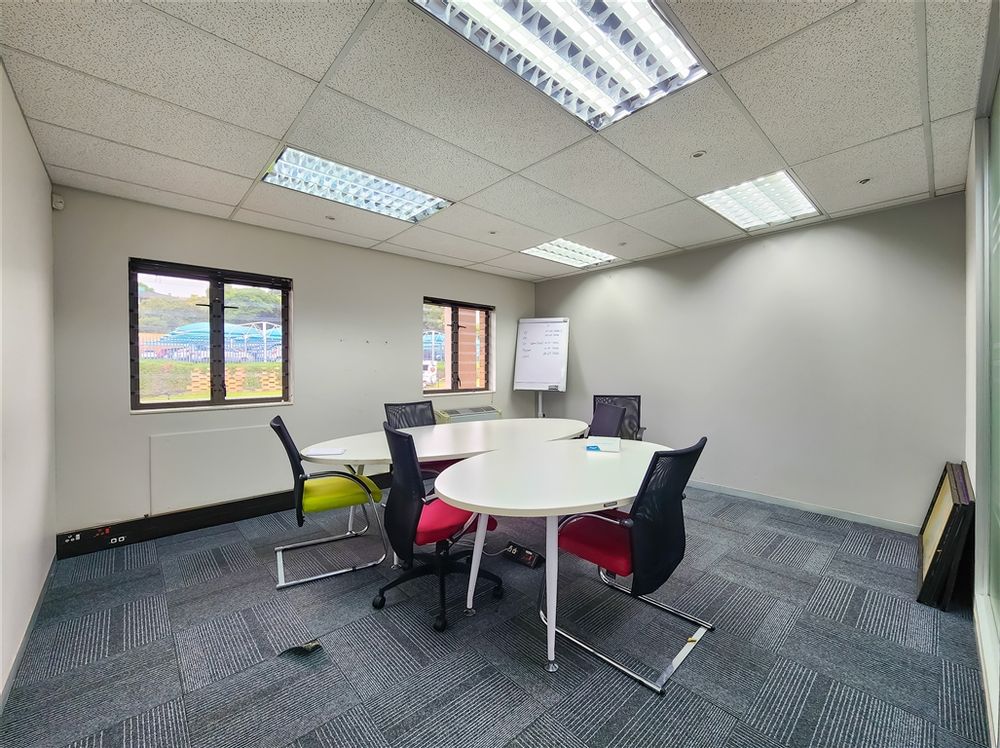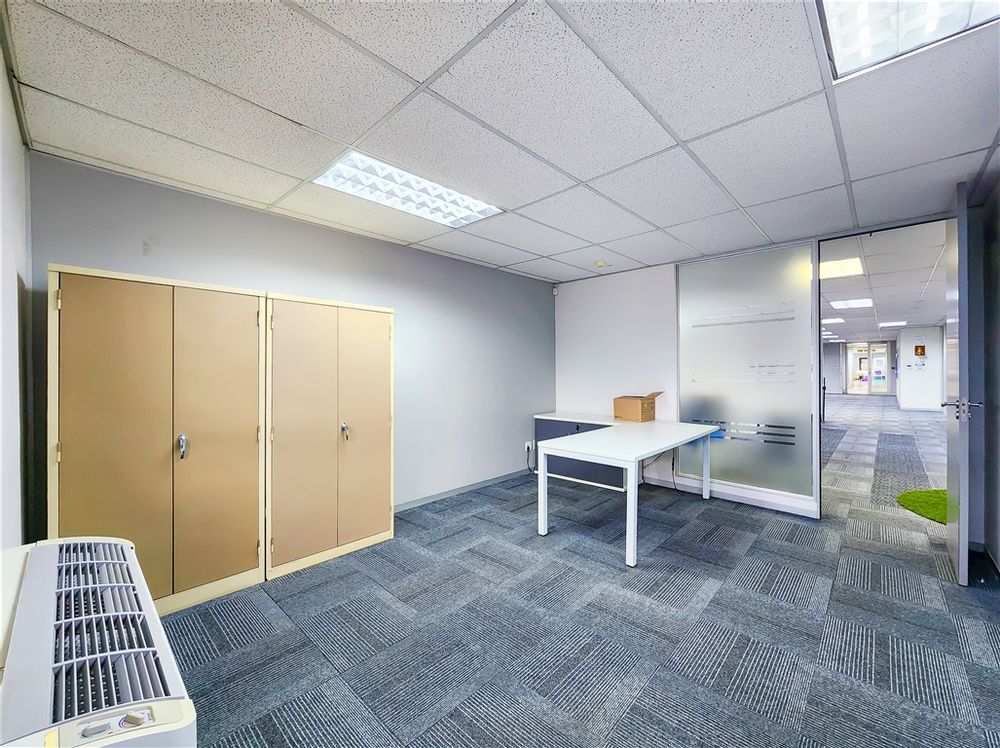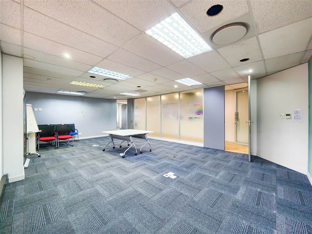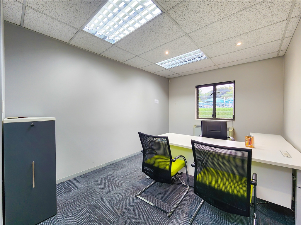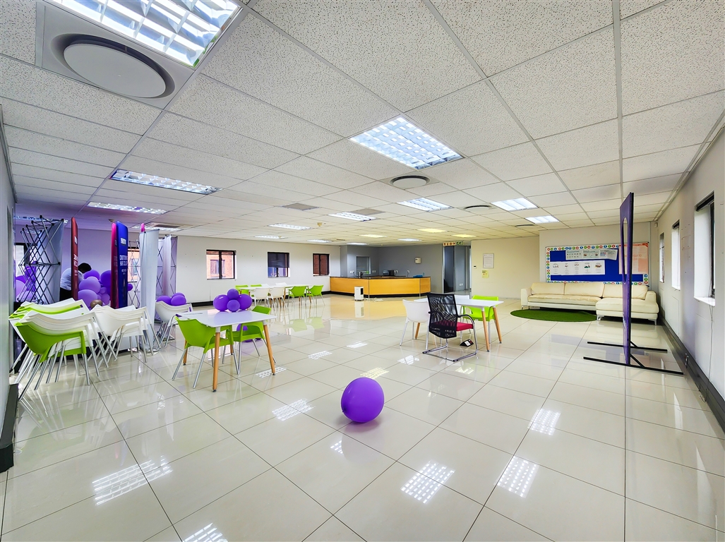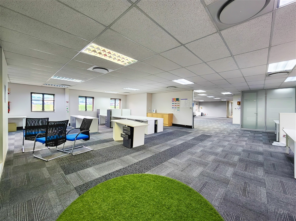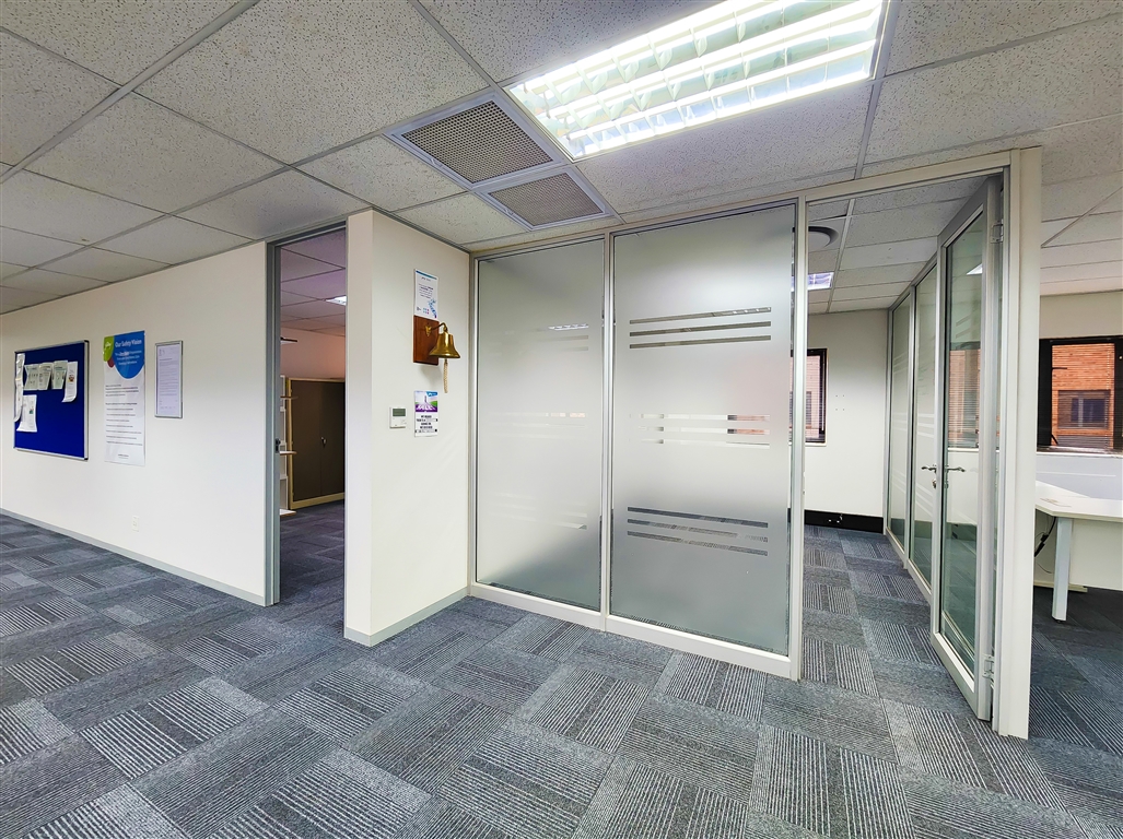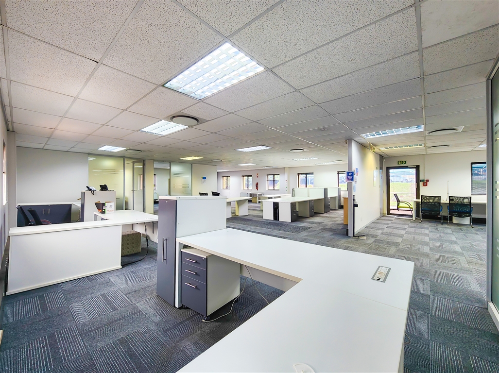 This modern first-floor office space for rent in Valley View Office Park features a spacious reception area followed by a boardroom that comfortably accommodate a 16-seater. A passage further leads to an open-plan workspace, a storeroom, and several glass-enclosed private offices. The office includes exclusive access to a canteen and a spacious kitchen. The flooring is a combination of vinyl and well-maintained carpets, while large ample windows fill the office space with natural light. Additional conveniences include a backup generator, backup water supply, fiber ready, and full air conditioning.