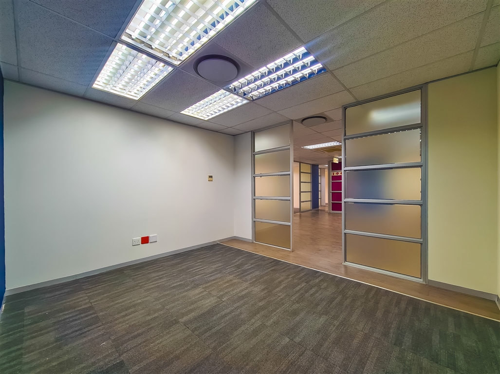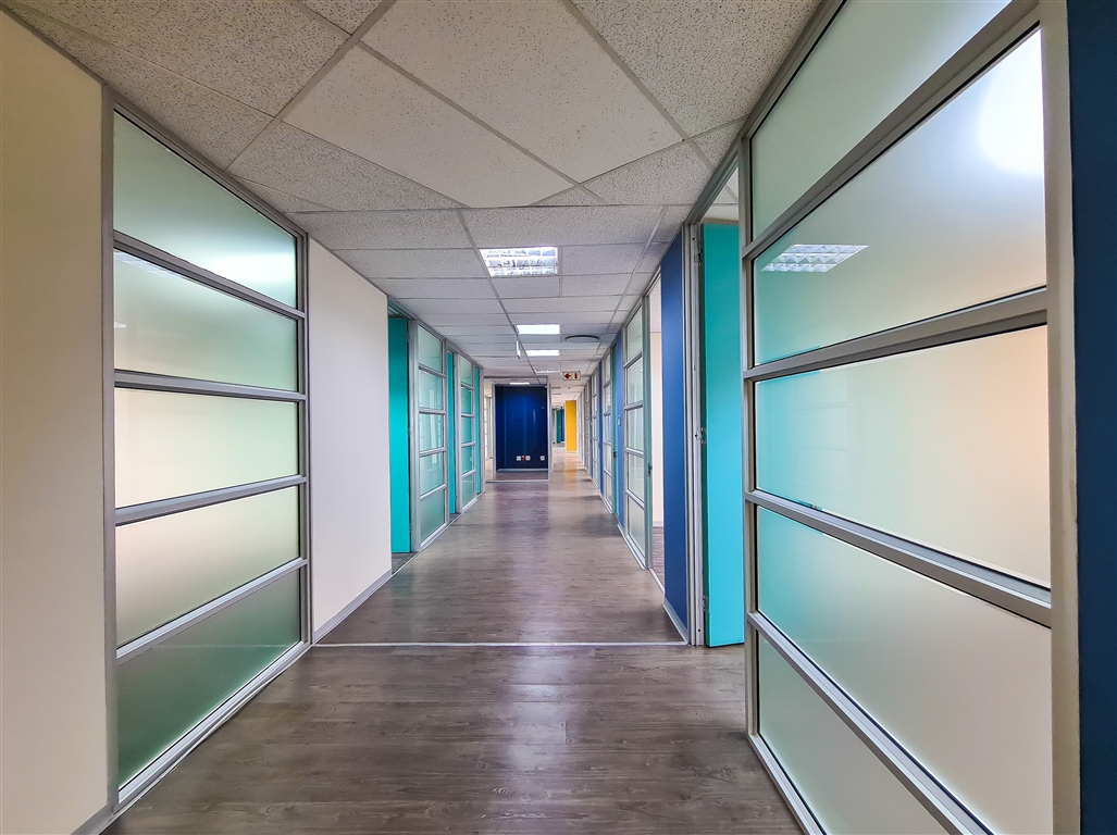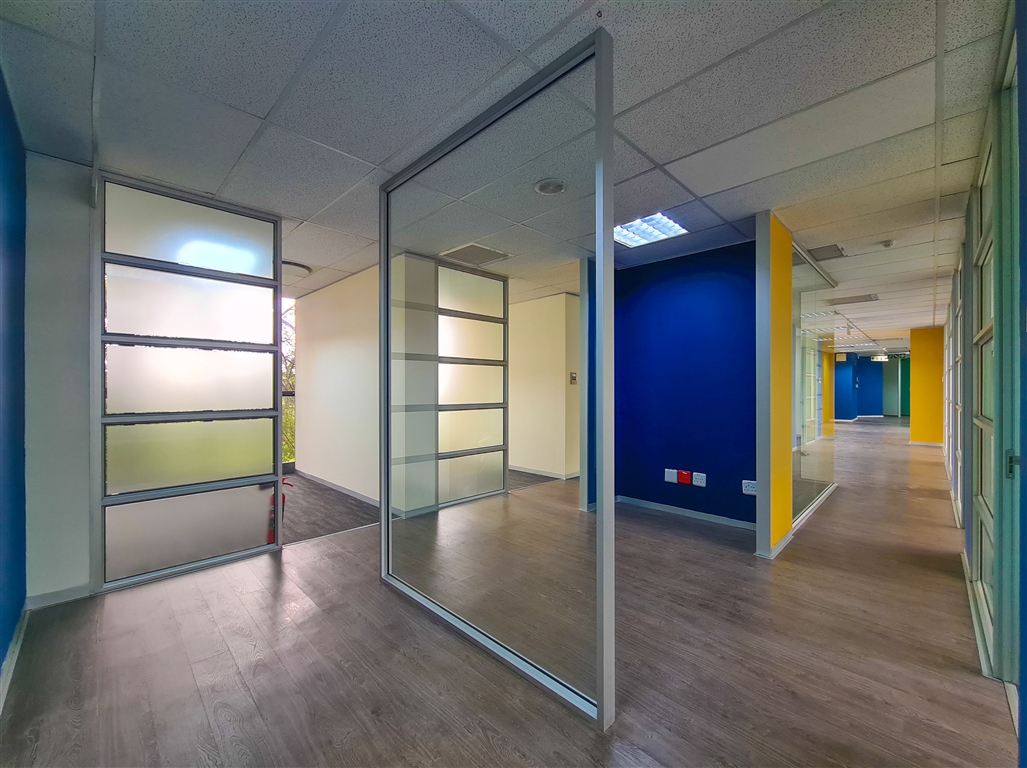 This modern office to Let in Constantia Kloof is located on the 1s floor and welcomes you with a small reception area followed by 2 spacious glass encased boardrooms and 2 smaller meeting rooms. A passage further leads you past multiple semi-private offices and an open plan workspace. The office features large windows that allow abundant natural light and private dedicated ladies and gents restrooms. The floor is vinyl throughout and the building is fibre ready.