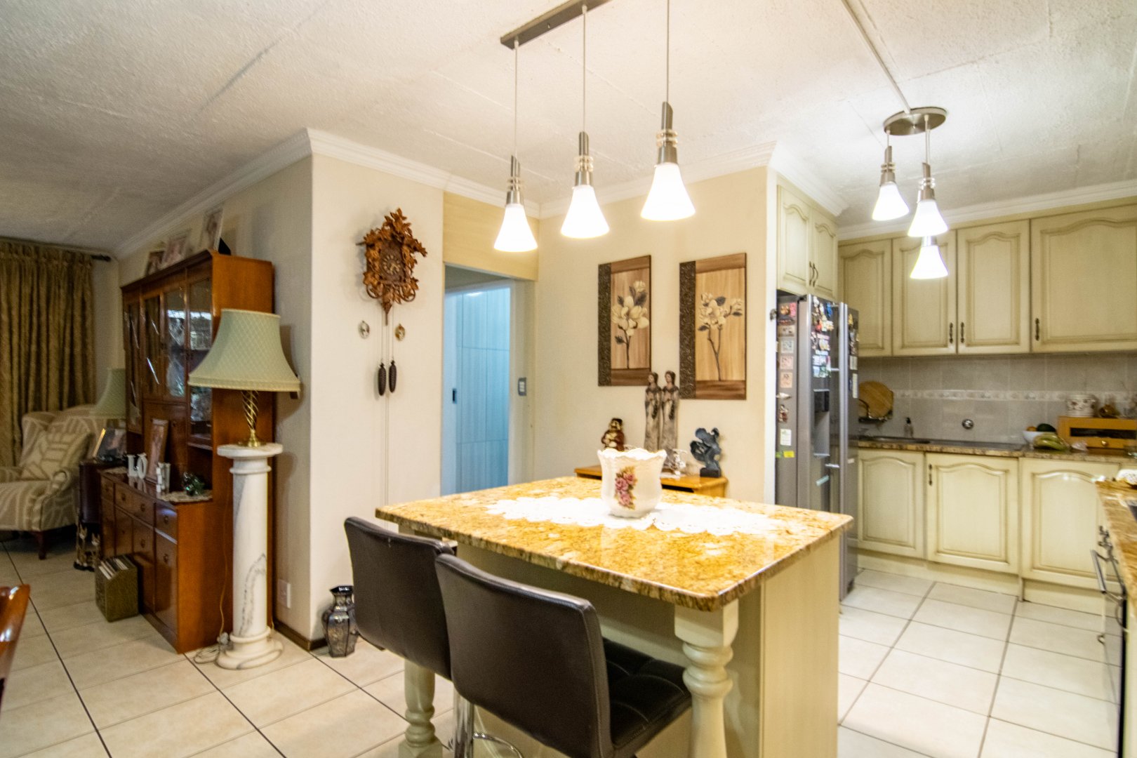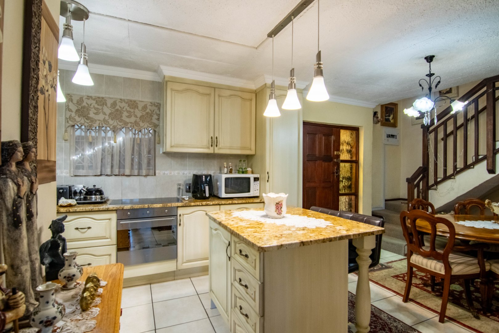 Charming Kitchen: A modern yet homely kitchen with granite countertops, abundant cupboards, and a separate outdoor laundry area.