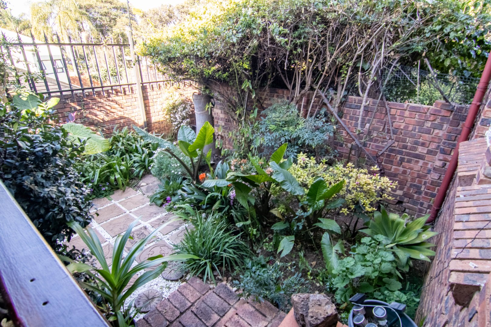 Enclosed courtyard with backup water tank.