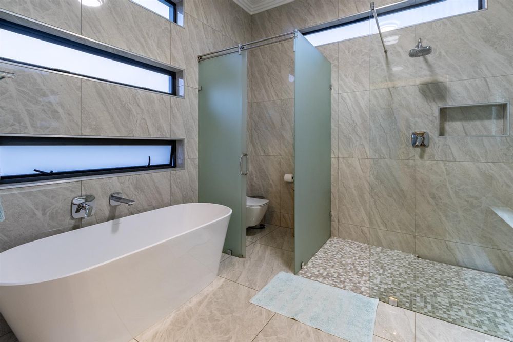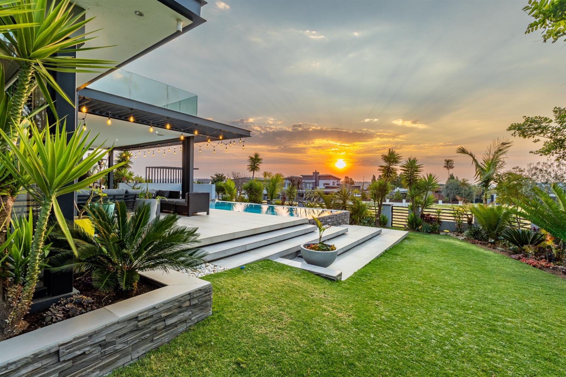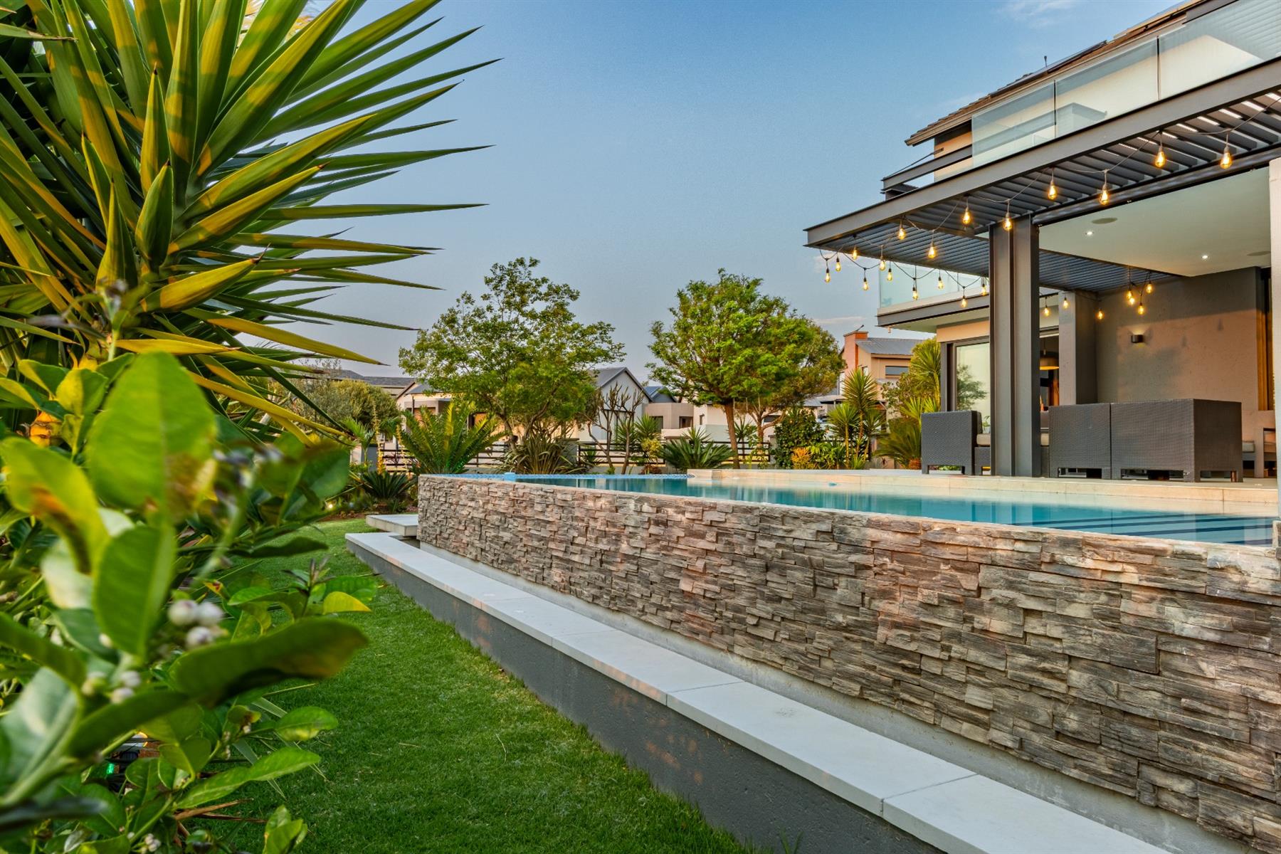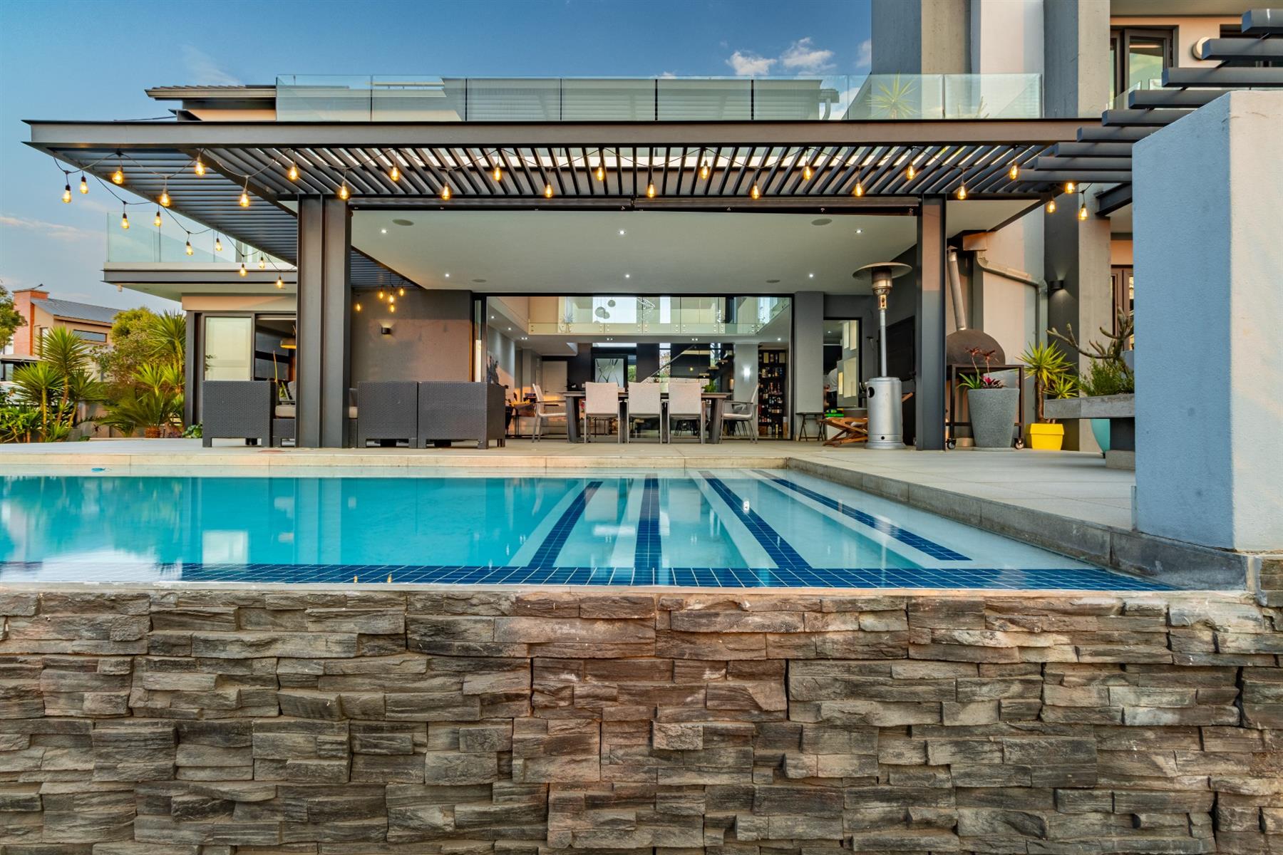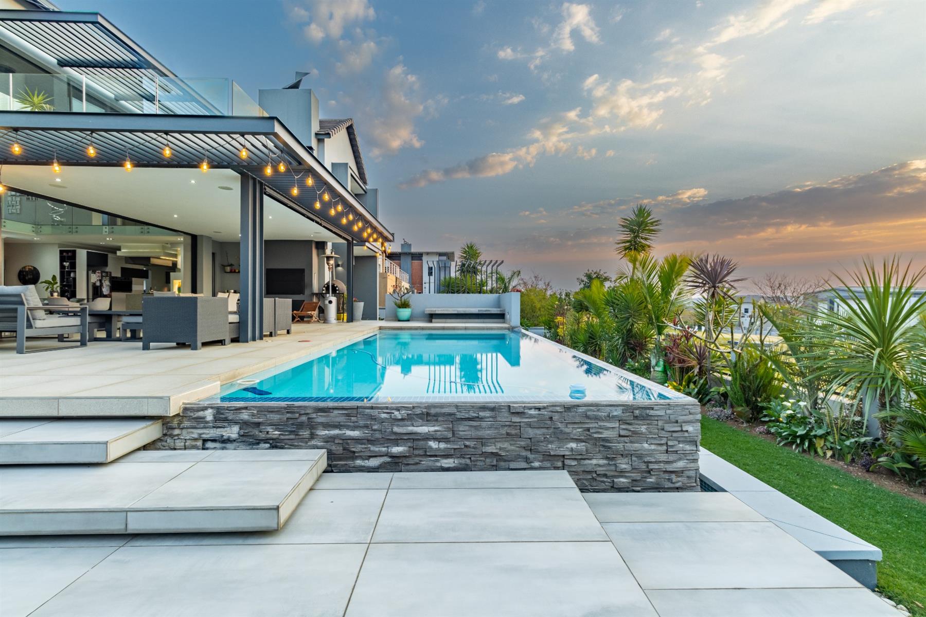 An infinity-edge pool offers seamless beauty and functionality, supported by separate pumps and filters housed discreetly in a dedicated pump room. Independent solar geysers with monitoring systems, an Alpha ESS Smile5 solar system, and back-up water tanks ensures uninterrupted comfort and efficiency.