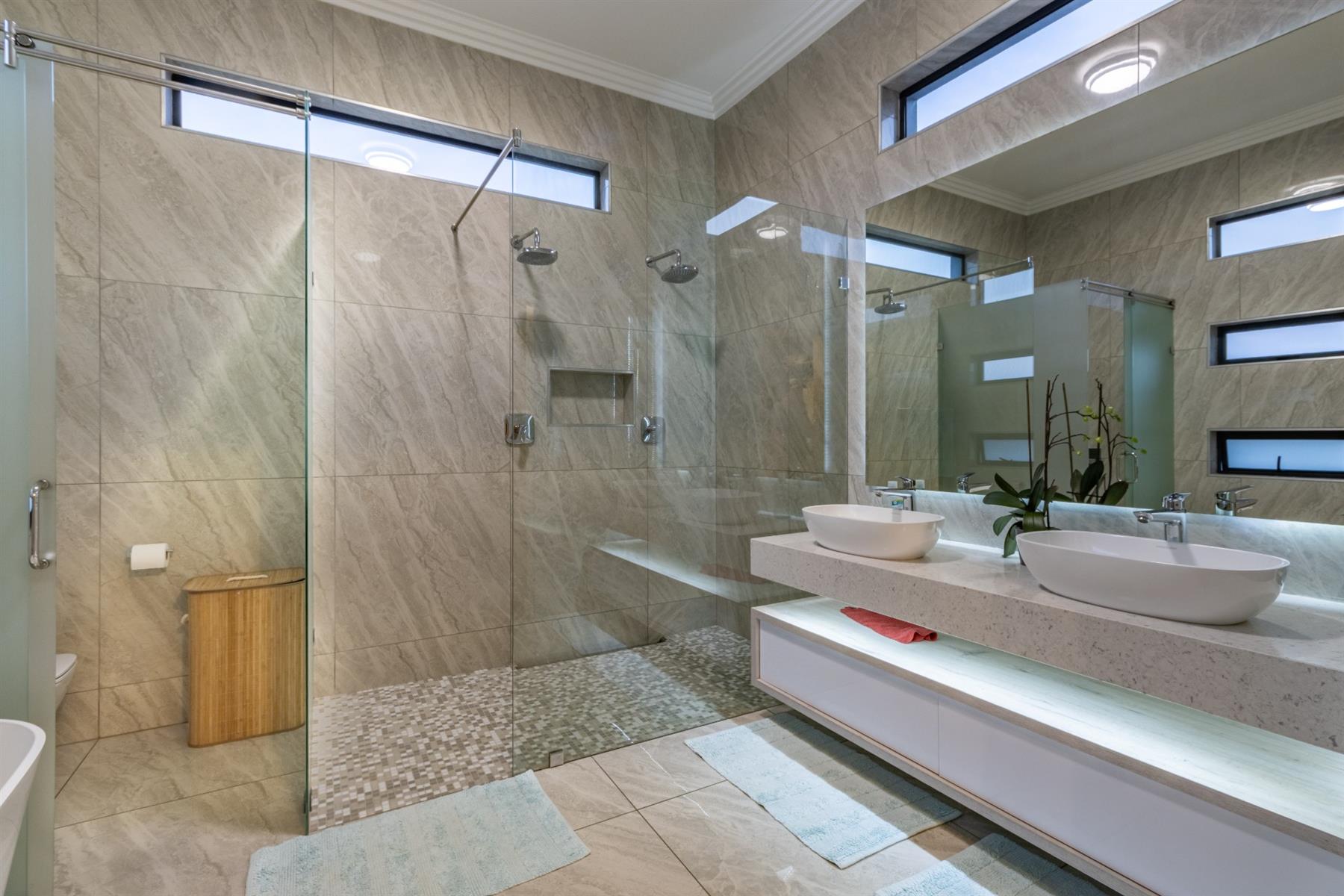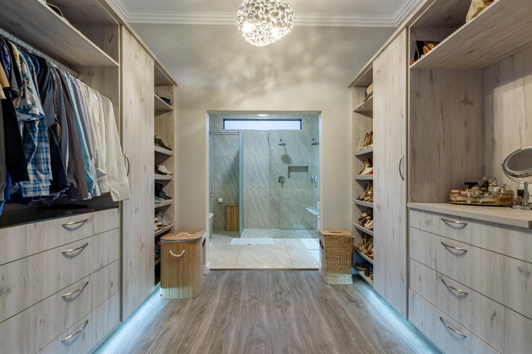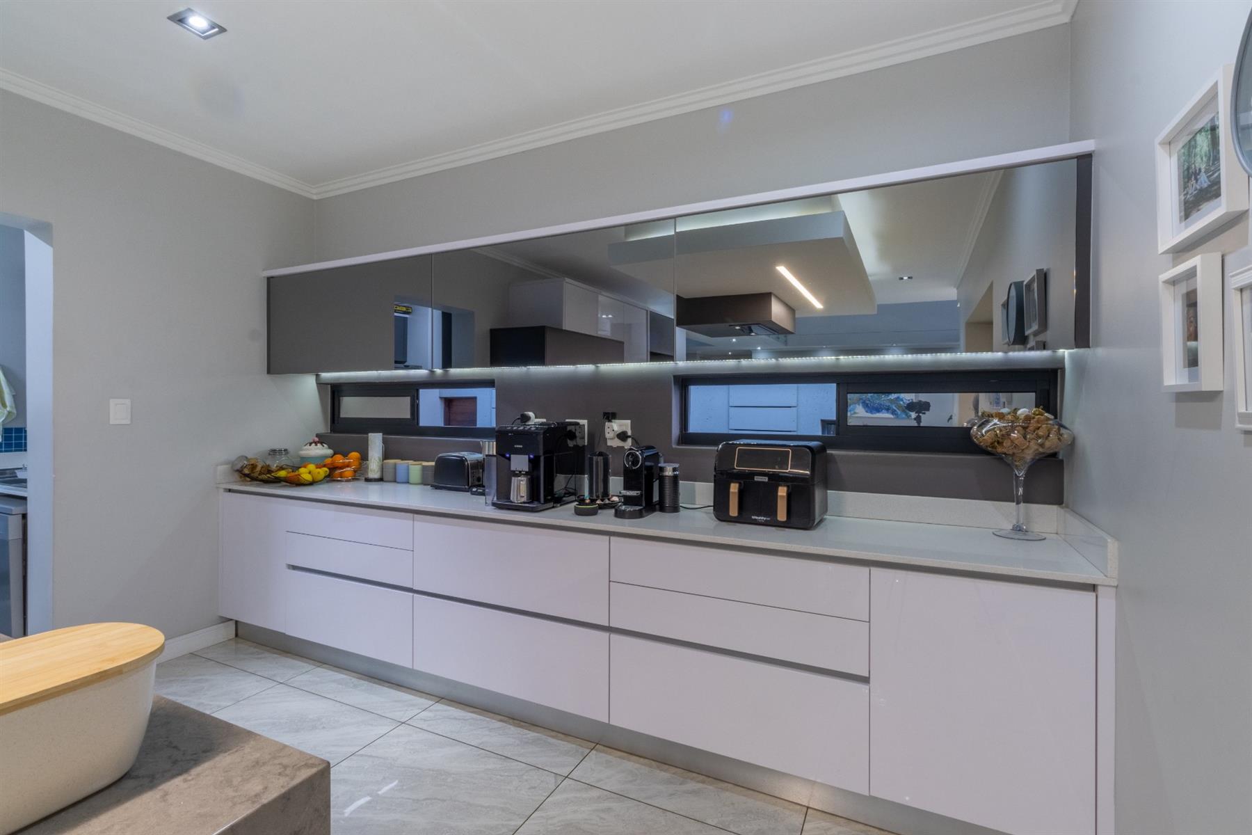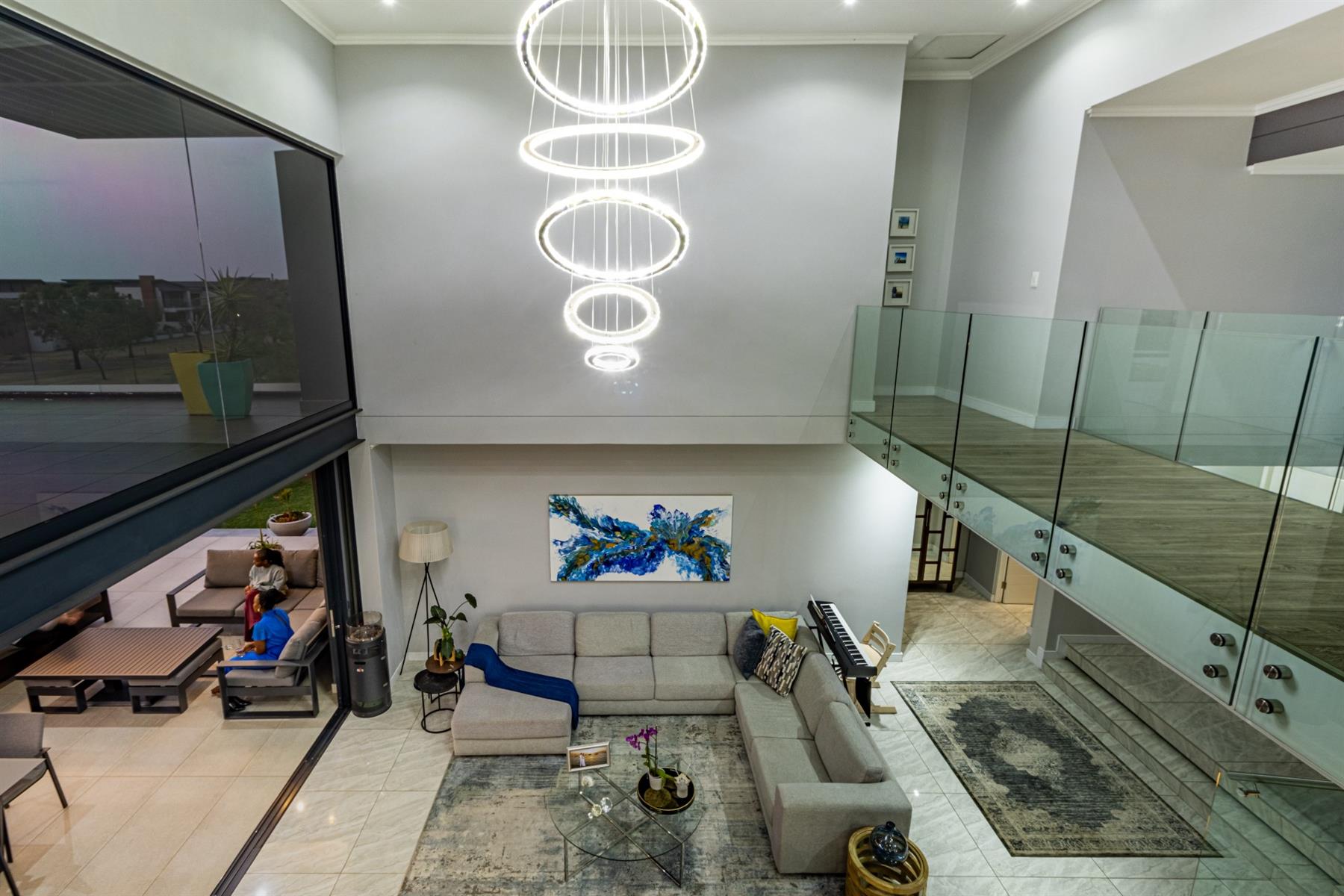 An infinity-edge pool offers seamless beauty and functionality, supported by separate pumps and filters housed discreetly in a dedicated pump room. Independent solar geysers with monitoring systems, an Alpha ESS Smile5 solar system, and back-up water tanks ensures uninterrupted comfort and efficiency.