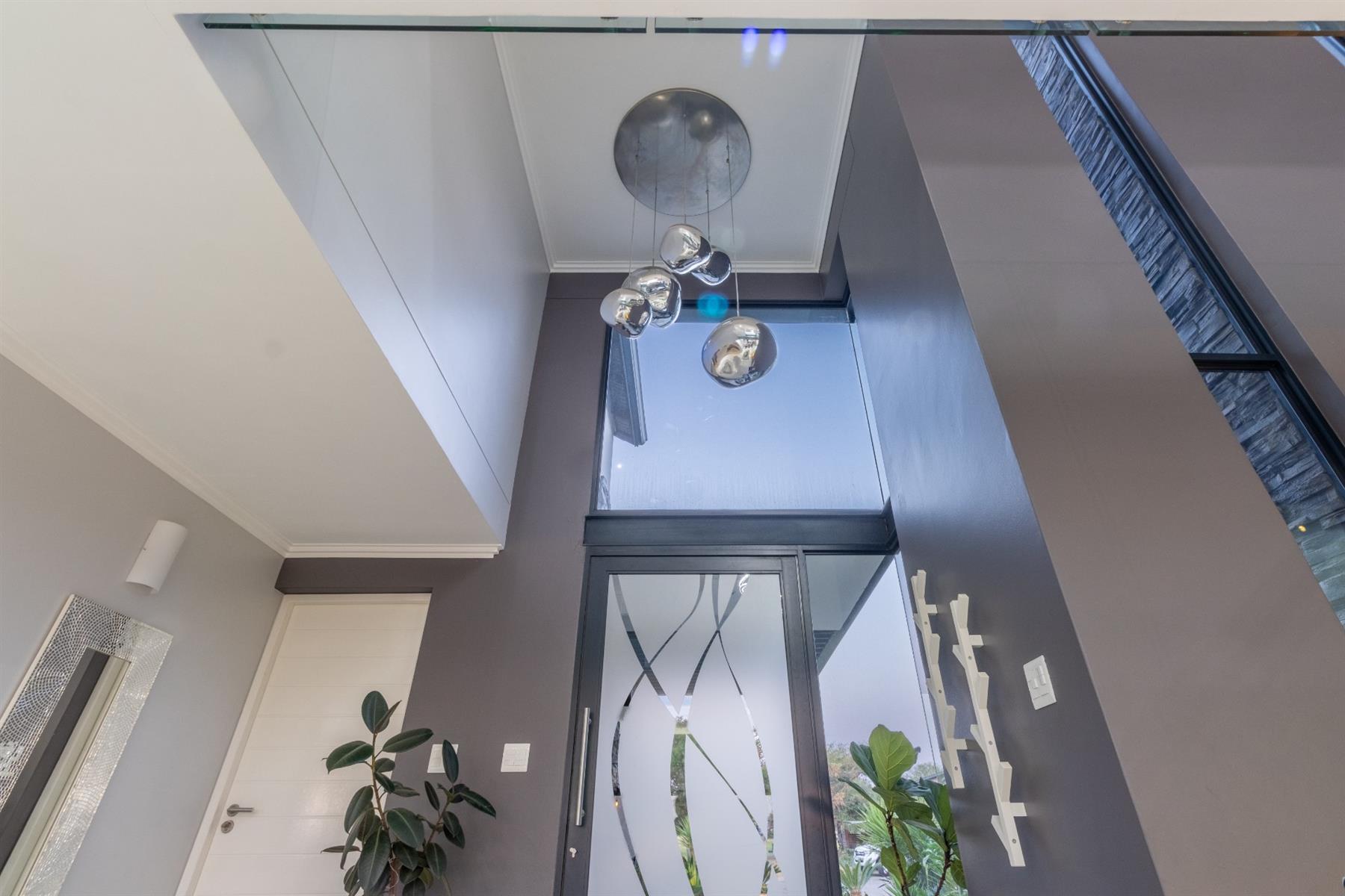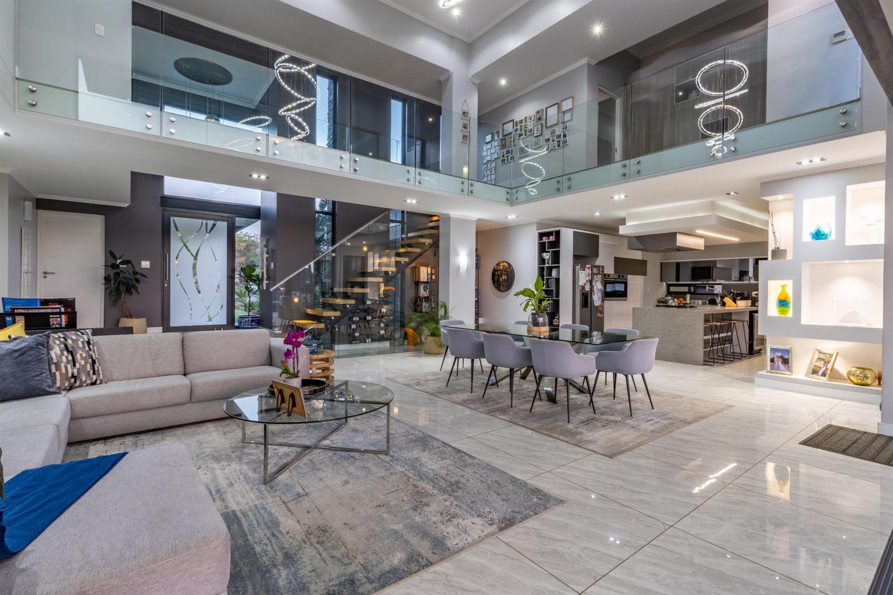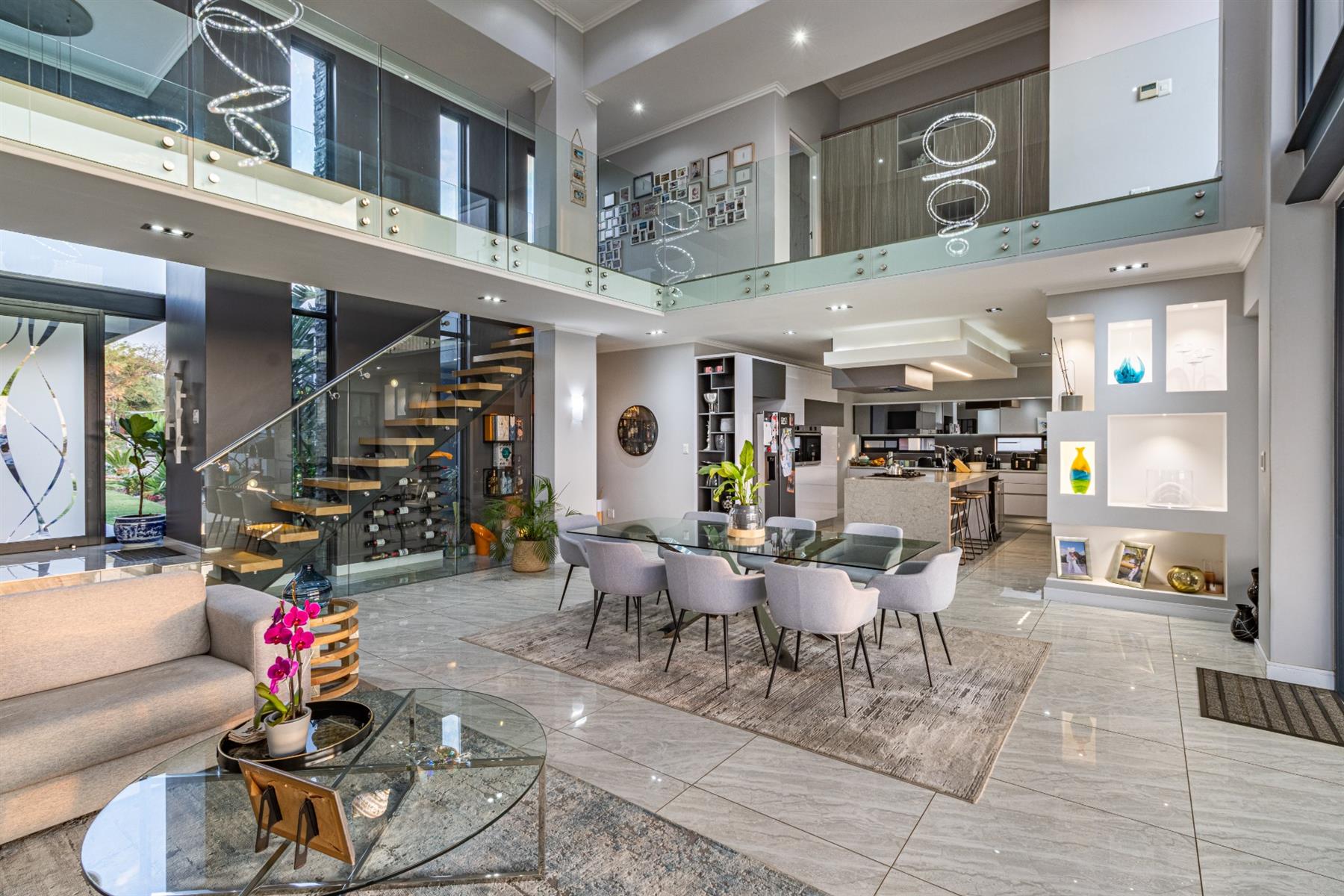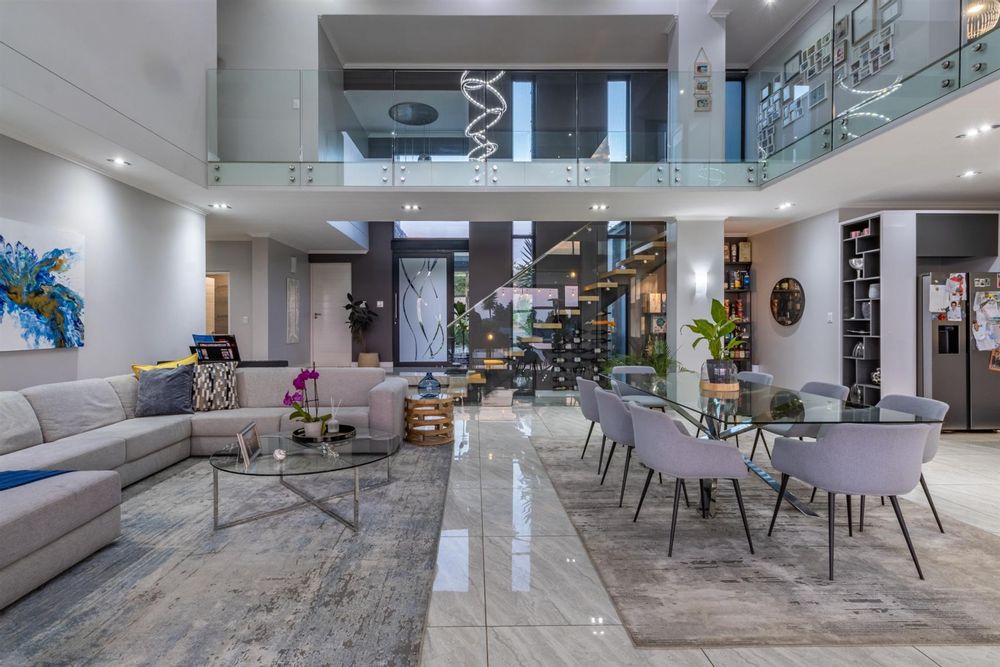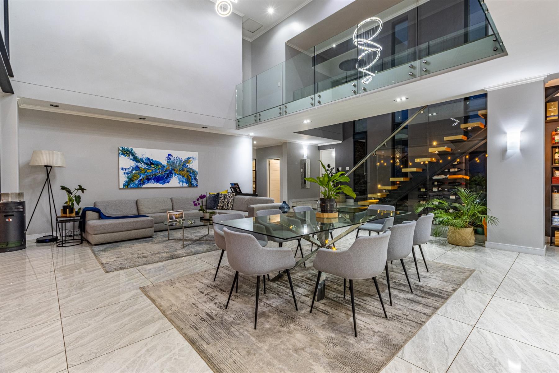 Step into a grand double-volume entrance that flows into elegant open-plan kitchen, living room and lounge areas, illuminated by a striking crystal ring chandelier. Architectural highlights include a skywalk connecting the home’s wings and stylish wine racks beneath the staircase.