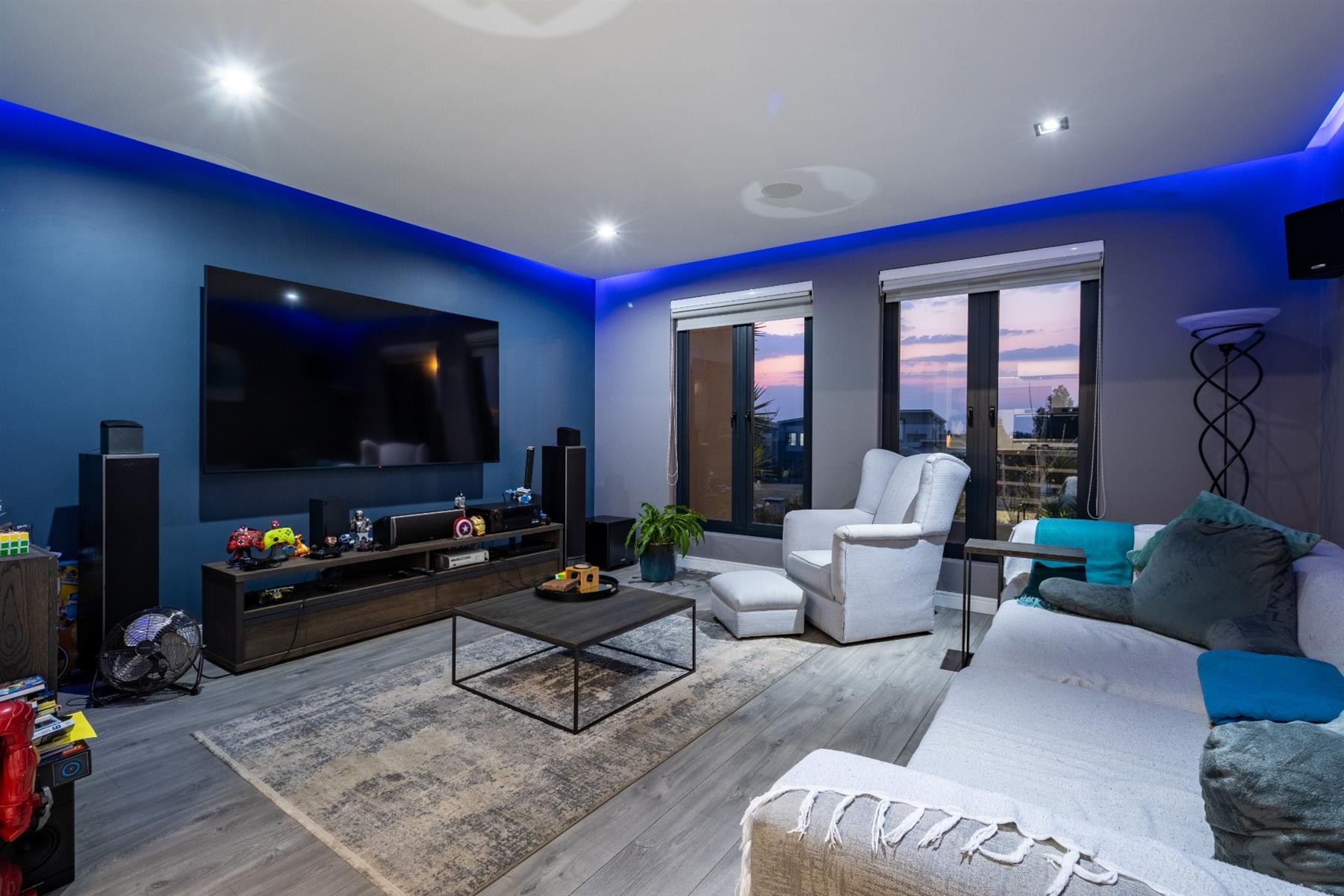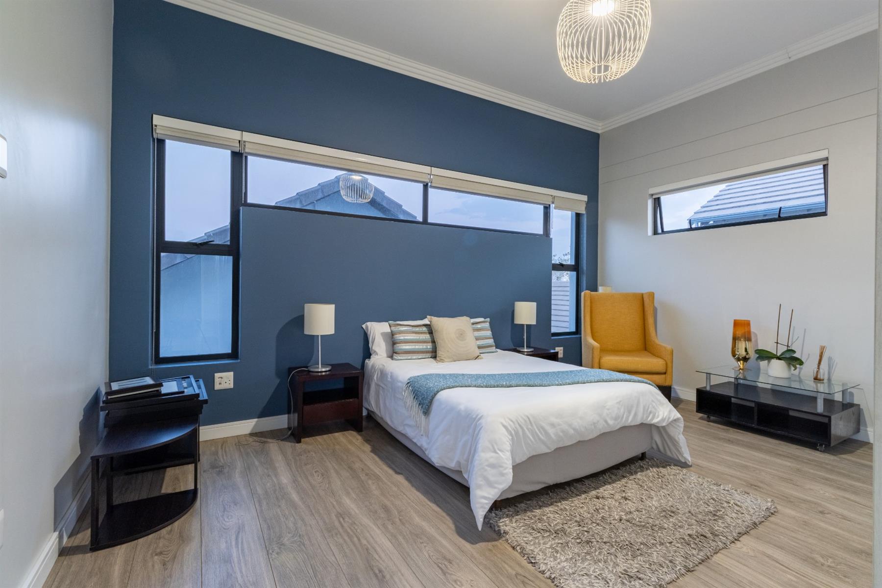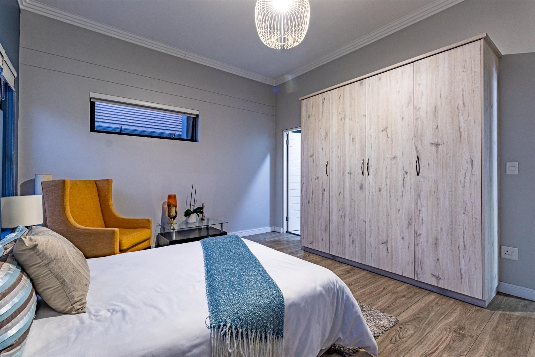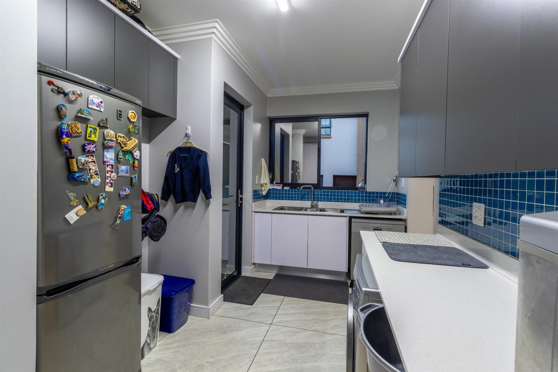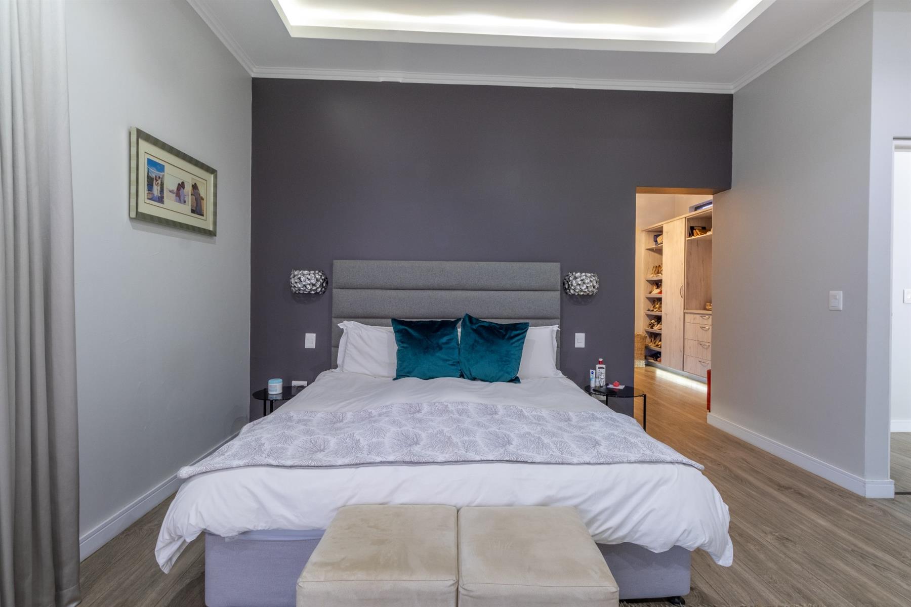 The home is designed for hosting, with a built-in 1.2m braai, a sunken boma with seating, retractable patio blinds, ceiling-mounted speakers, and a beautifully landscaped garden with automated irrigation.