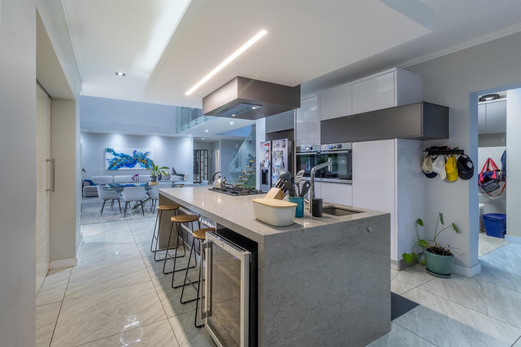 The sleek modern kitchen is fitted with Bosch appliances, mirrored cabinets with LED backlighting, and a Caesarstone island with dual-sided storage and space for a bar fridge.