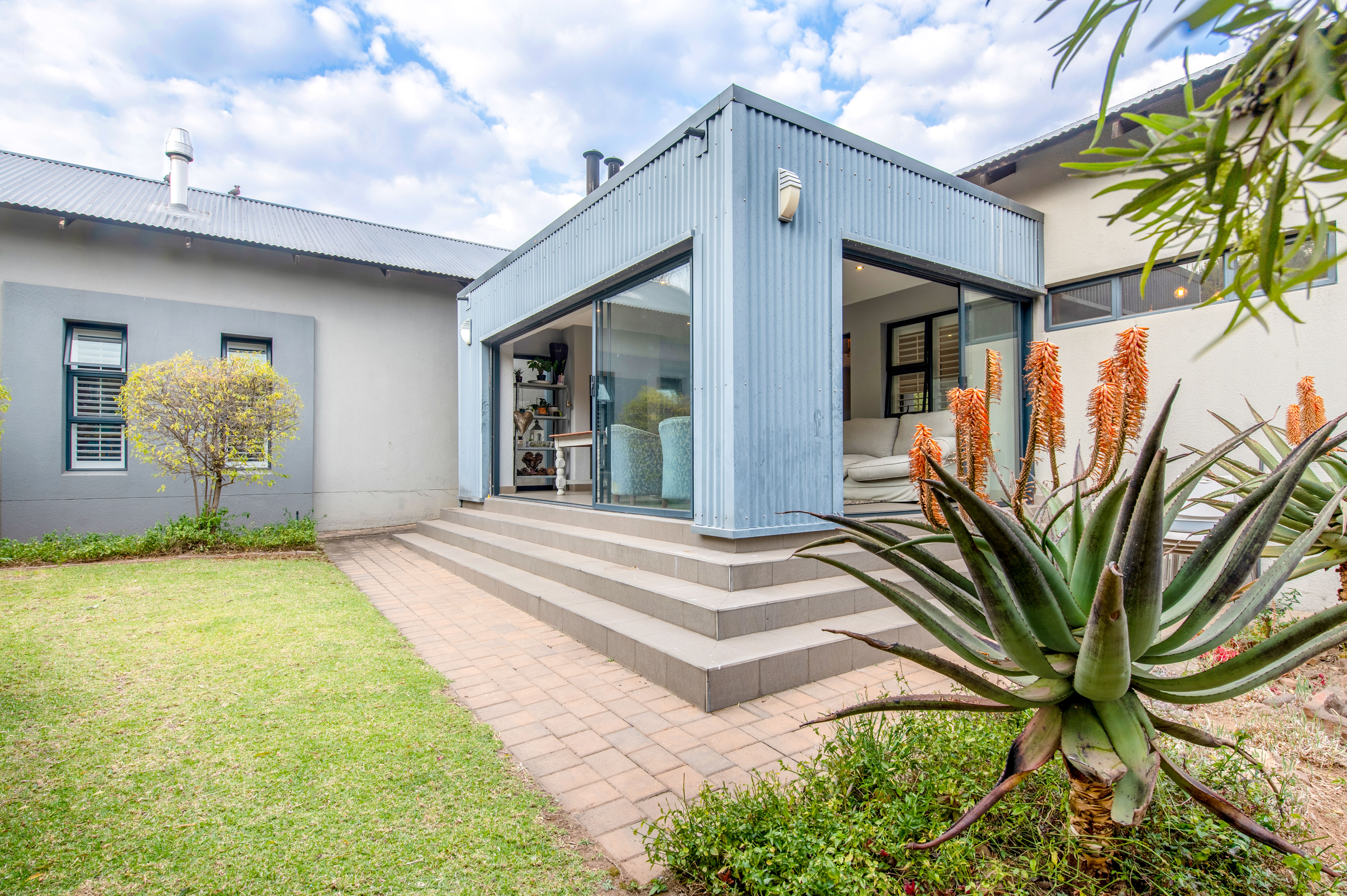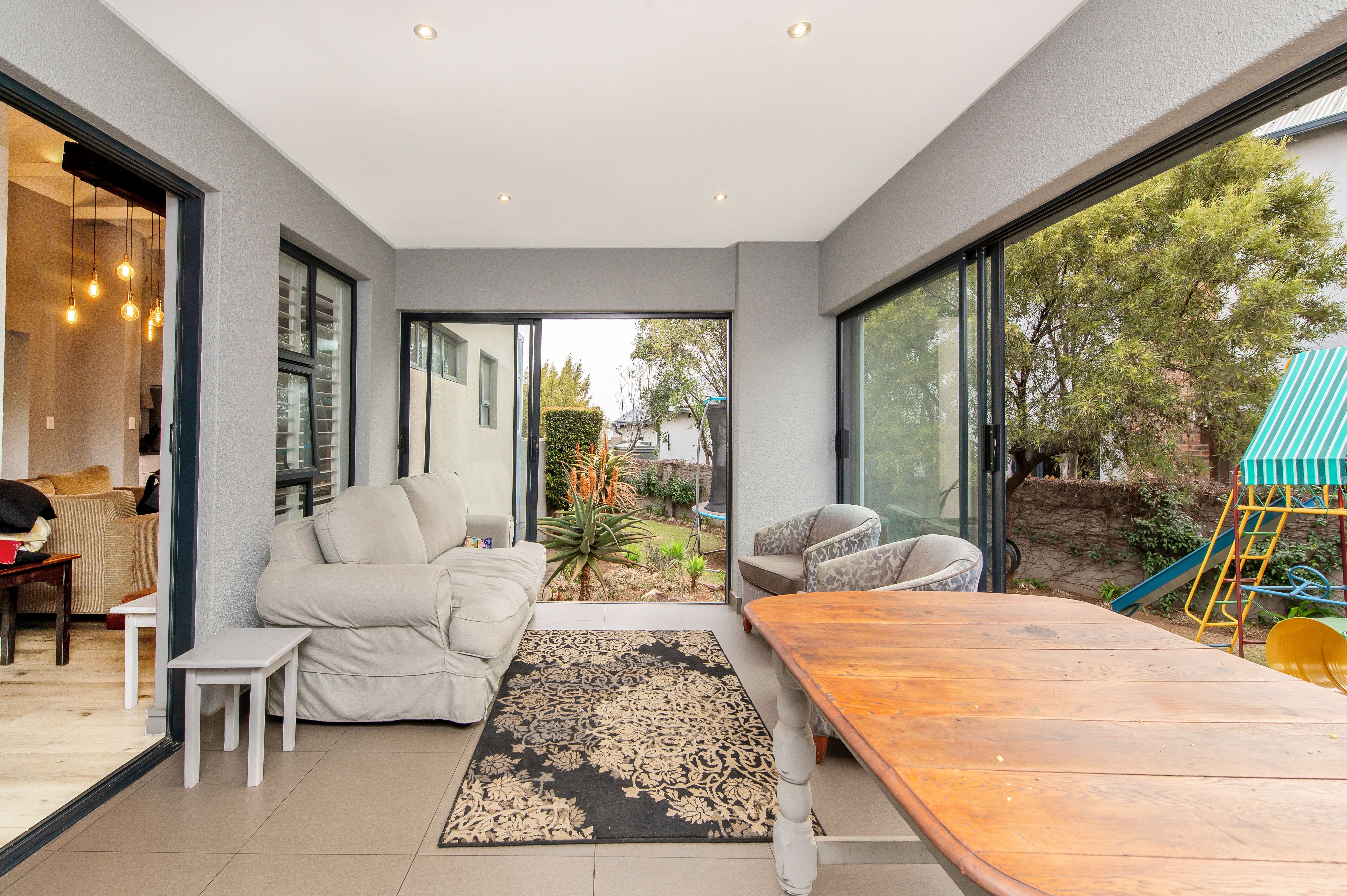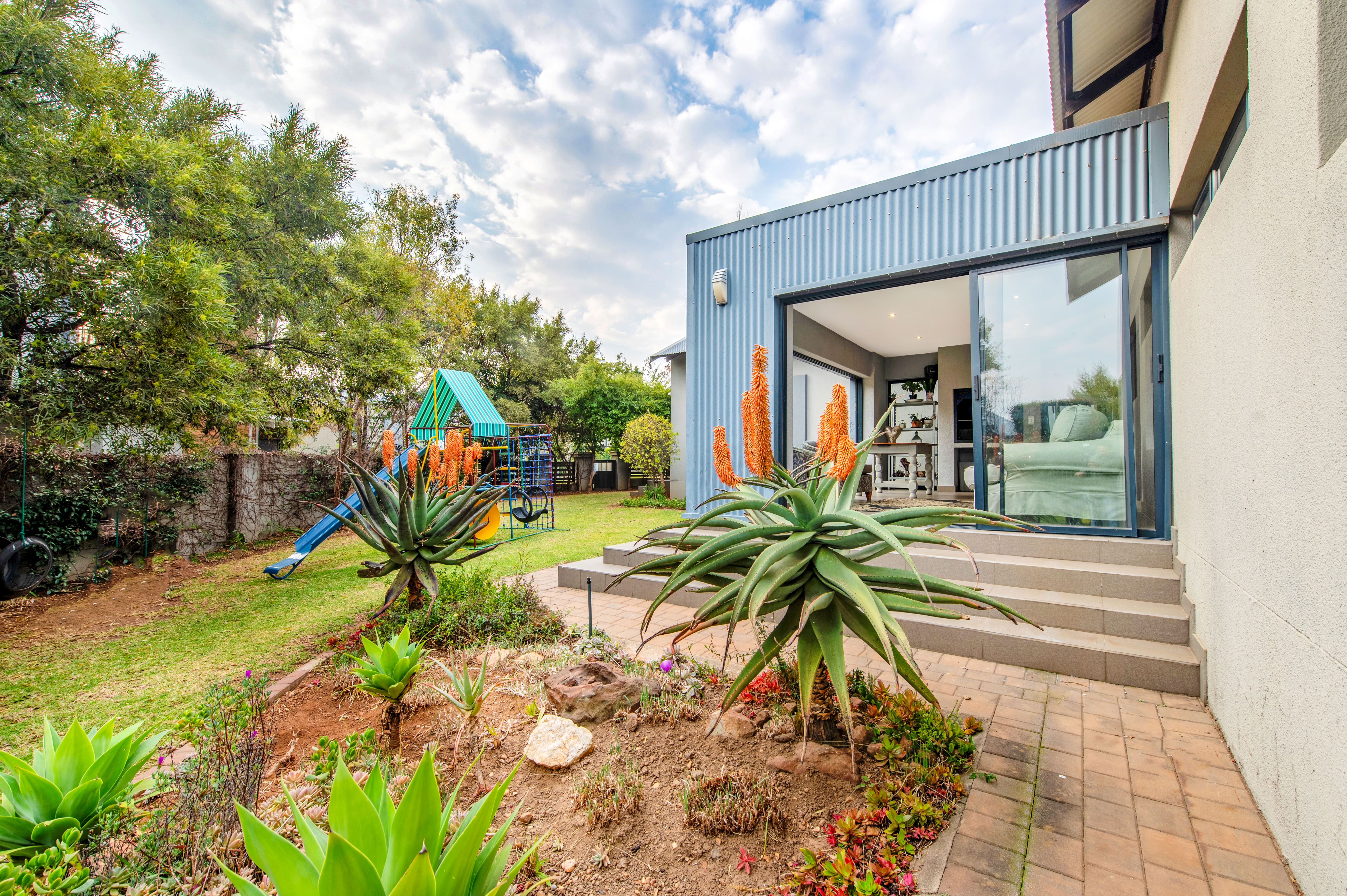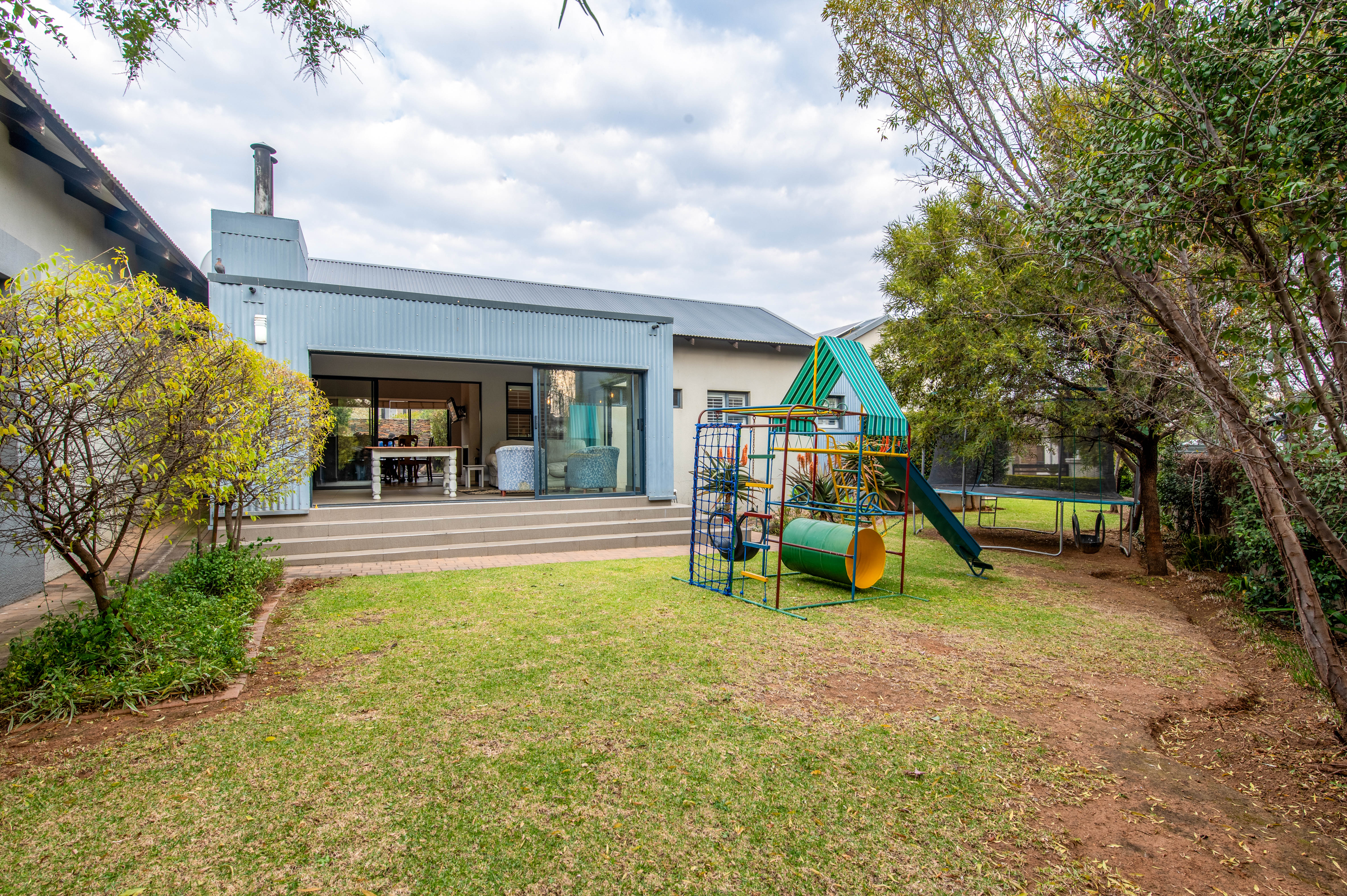 The covered patio looks over the garden with a braai and glass sliding doors