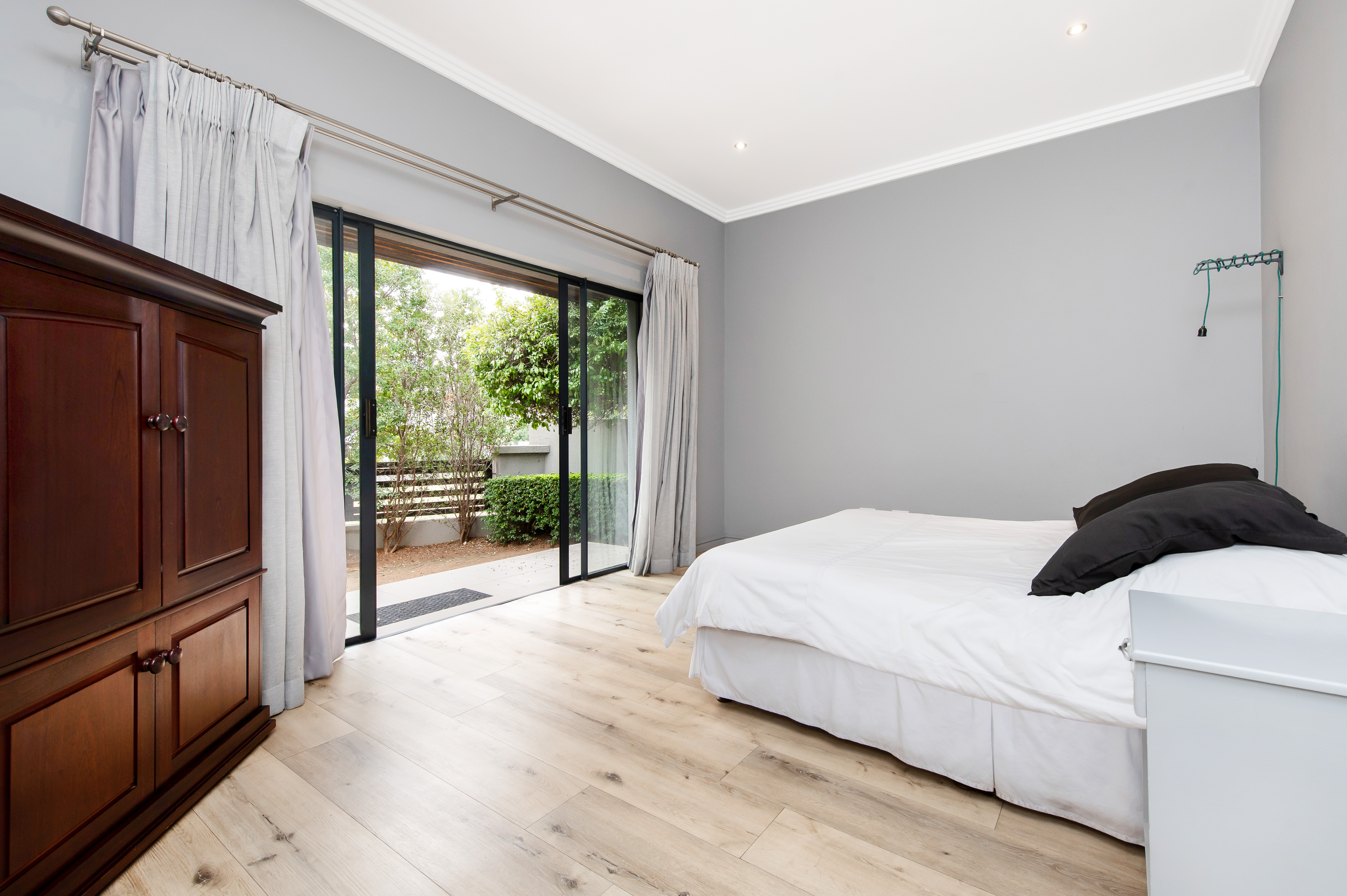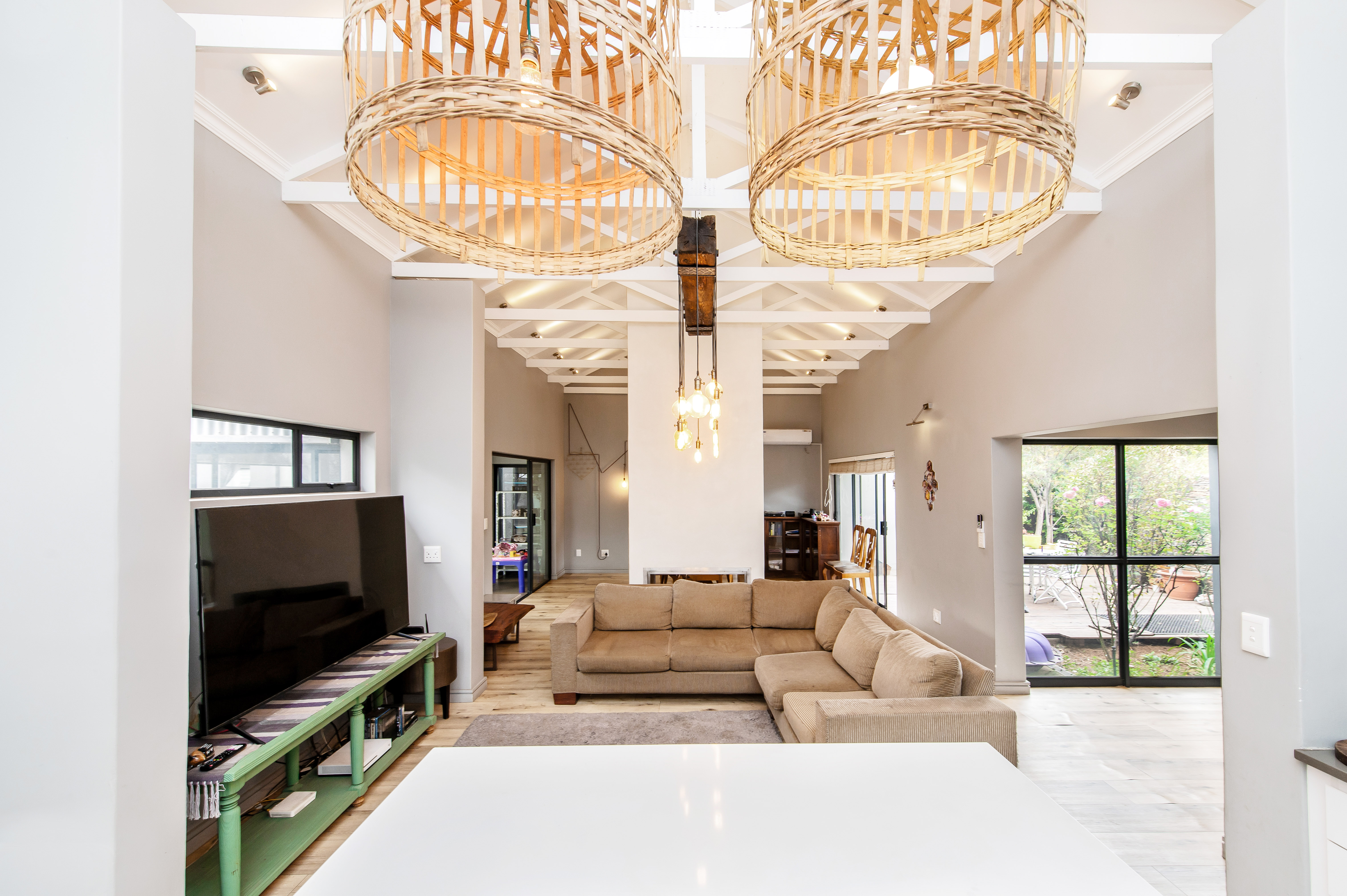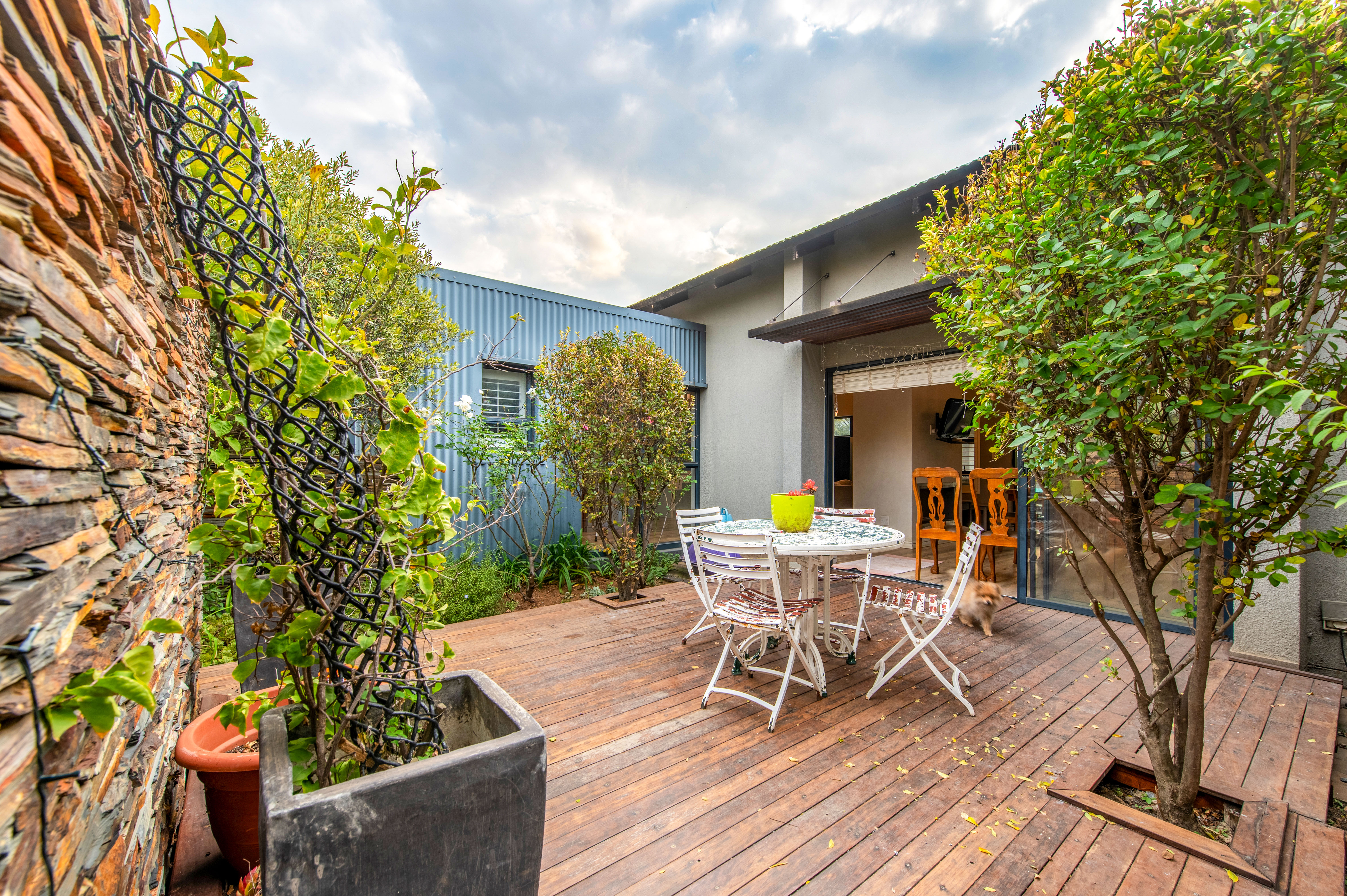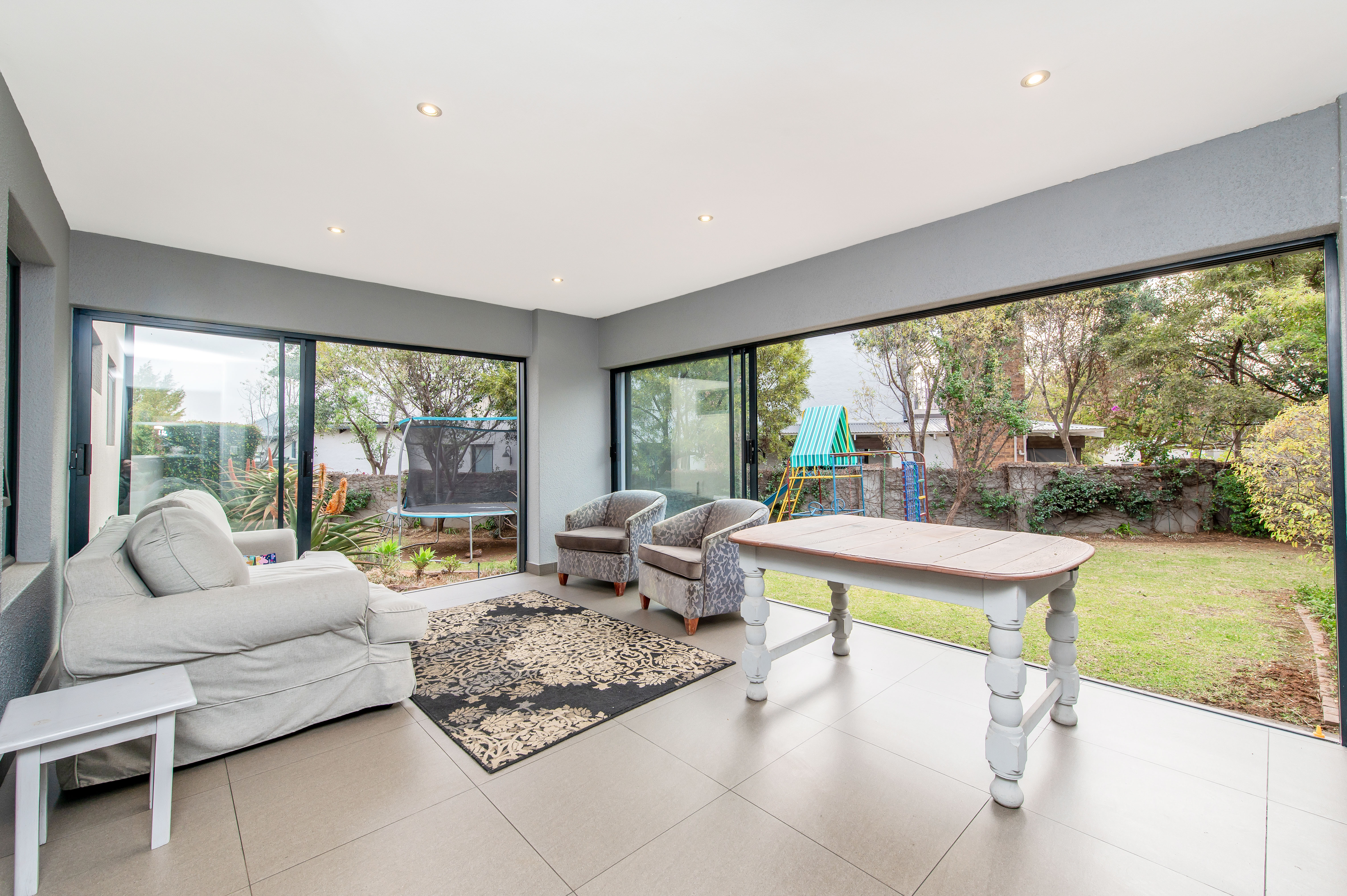 The covered patio looks over the garden with a braai and glass sliding doors