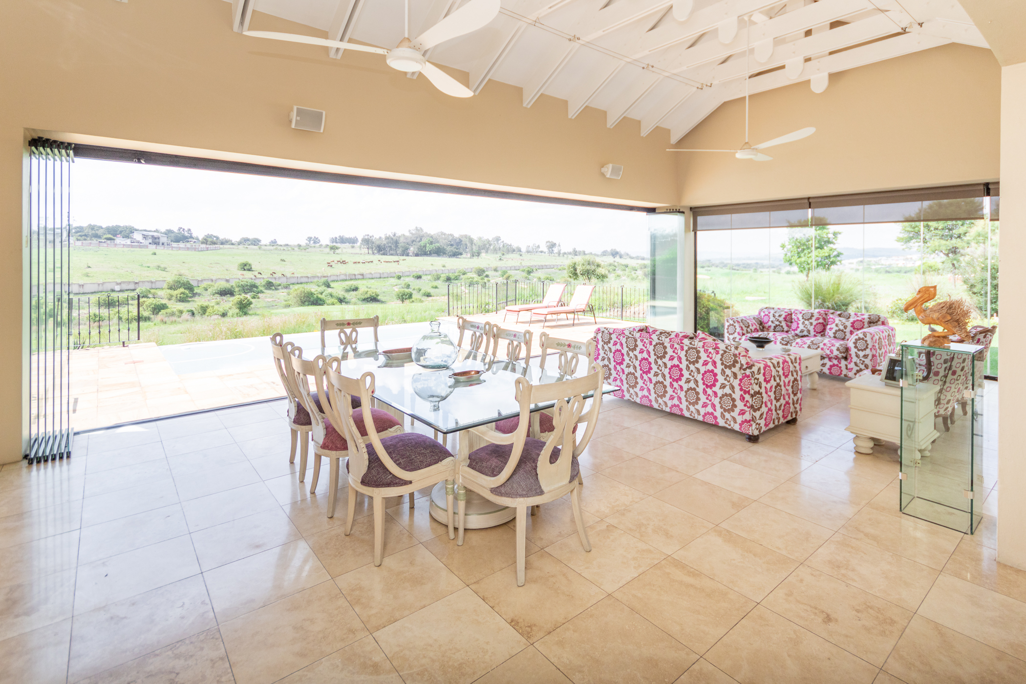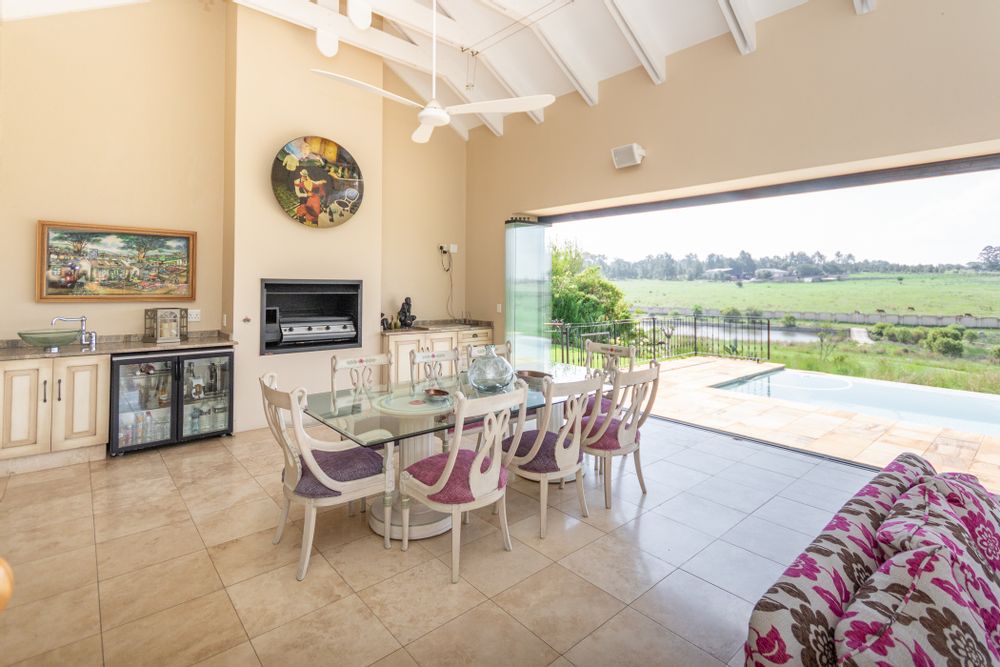 The patio, accentuated by frameless stacking doors, can be enclosed to create an additional entertainment space with a built-in gas fireplace, offering a luminous ambiance overlooking the infinity pool, where captivating views unfold before you, ideal for hosting memorable gatherings.