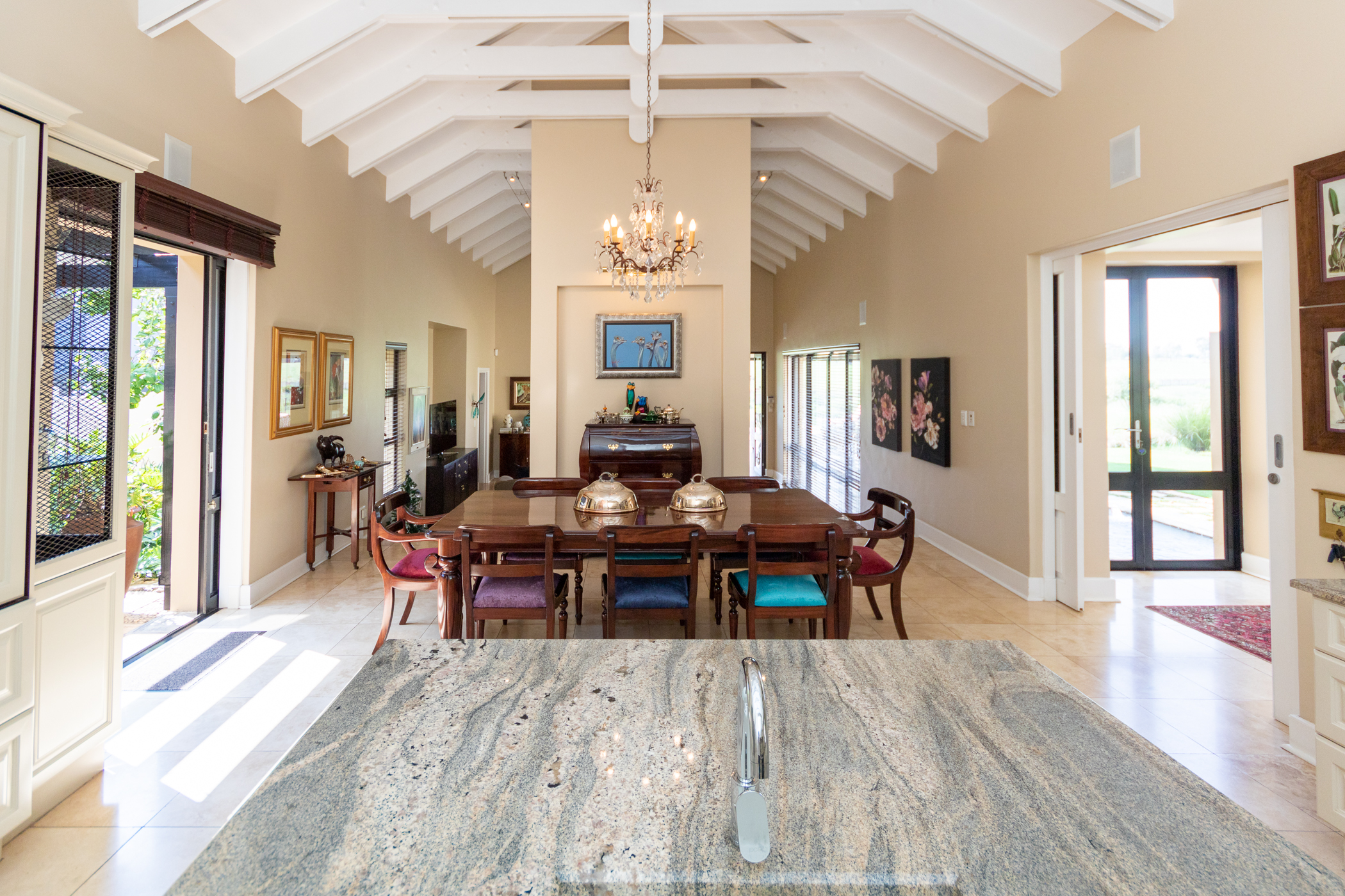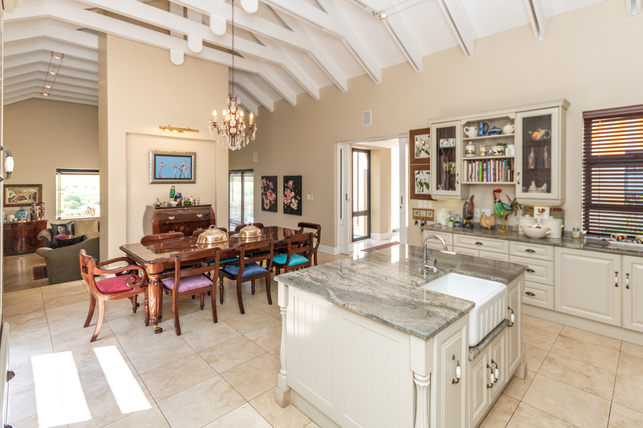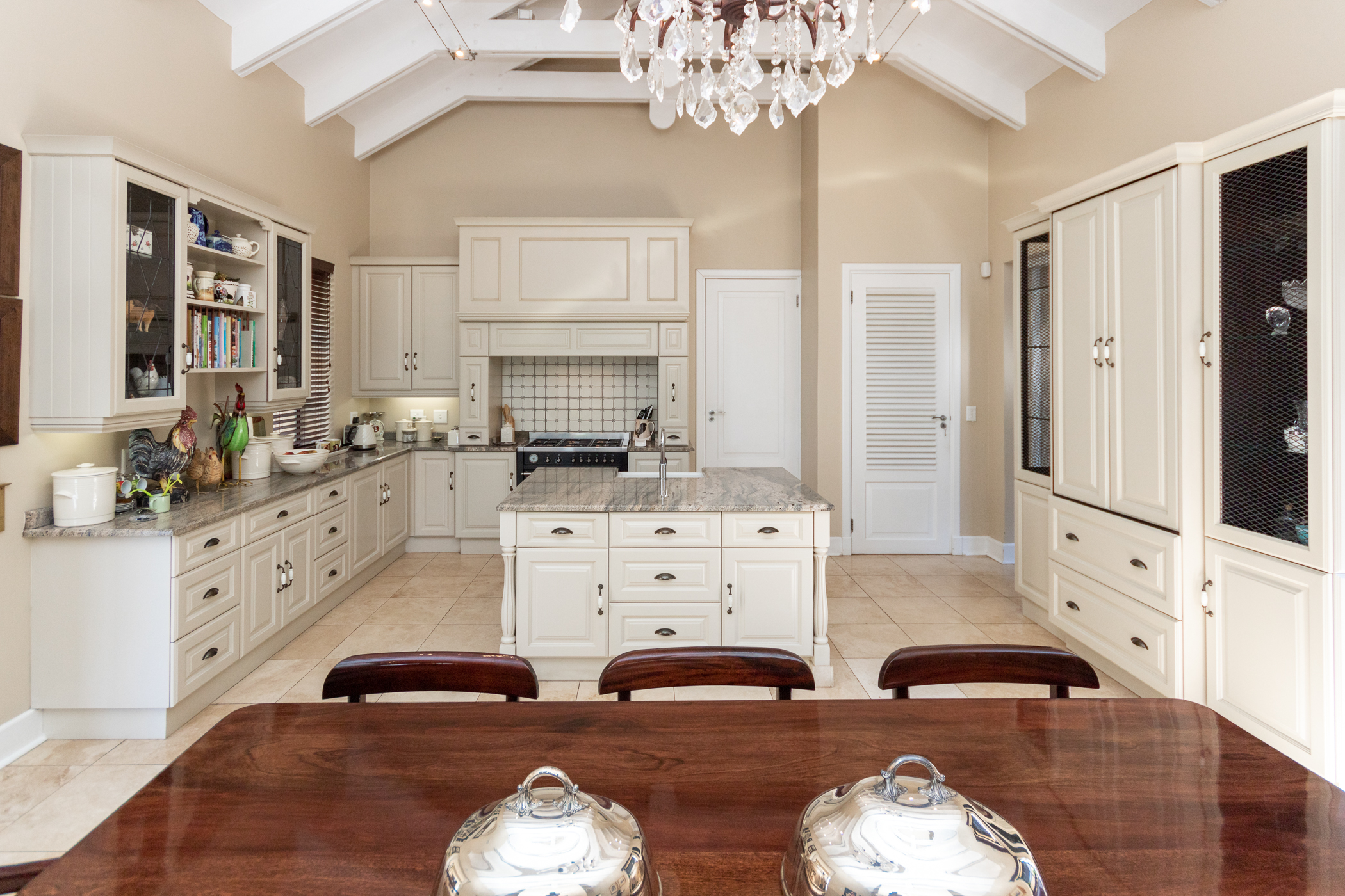 Custom-crafted finishes throughout the residence evoke the charm of the French countryside. The kitchen stands as a culinary sanctuary, boasting French-inspired design elements, including ample built-in cupboards, a spacious island, a pantry, and a scullery equipped to accommodate three appliances. Flowing seamlessly from the kitchen, the dining area features exposed trusses, leading to a sunken lounge adorned with a cozy gas fireplace and a charming wine cellar.