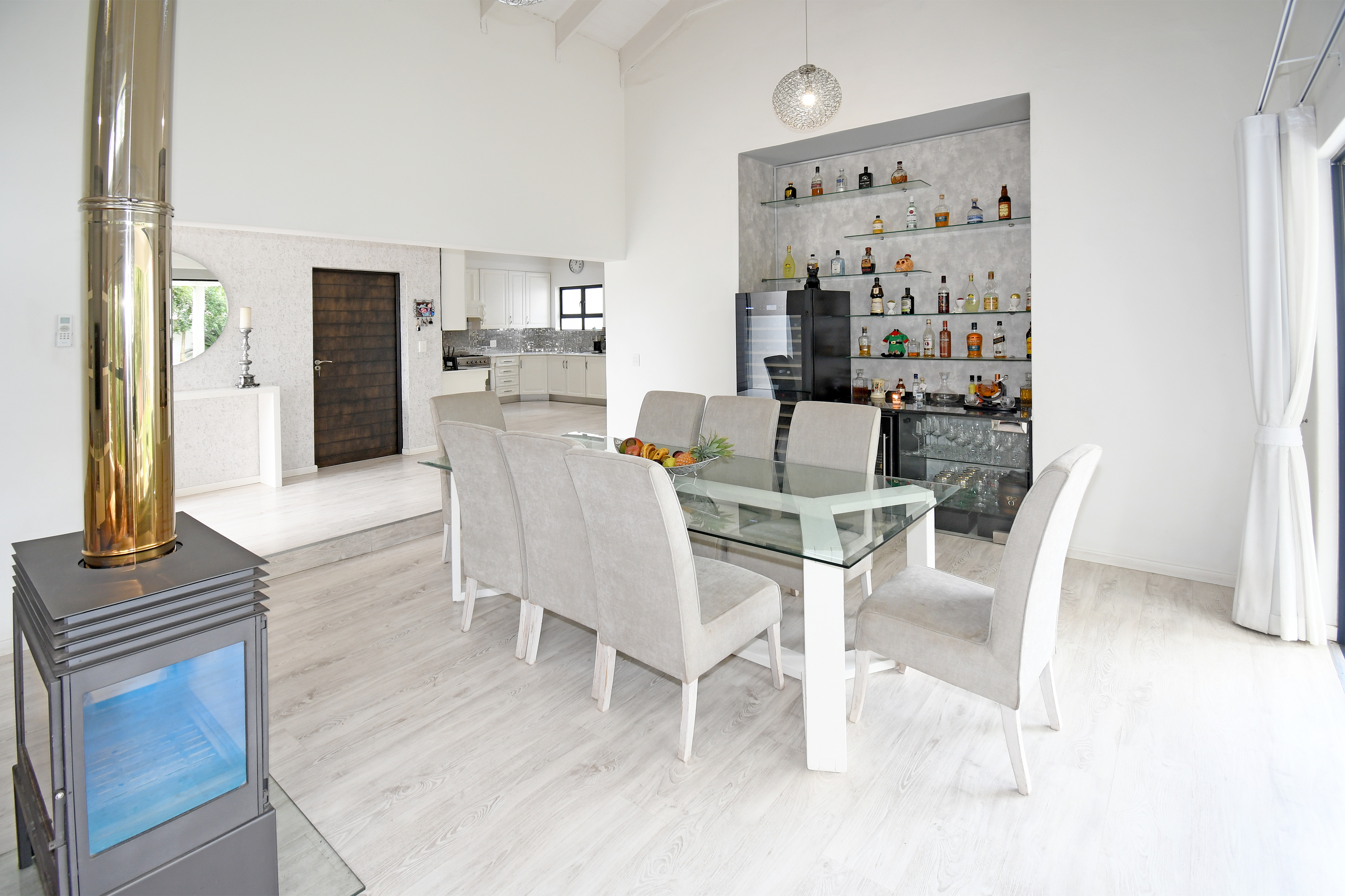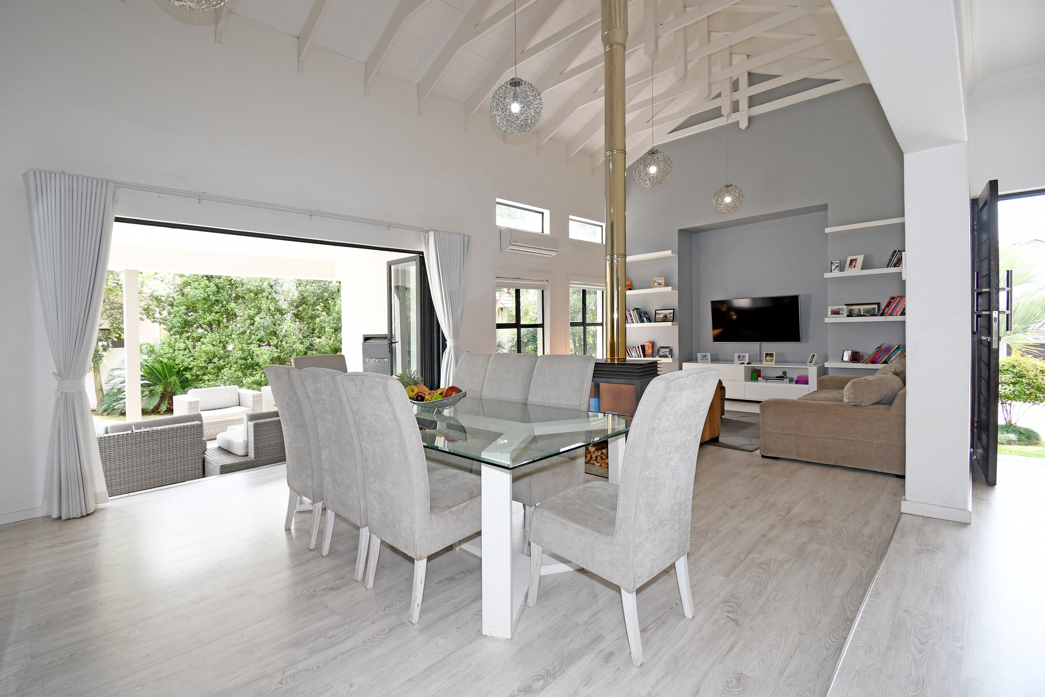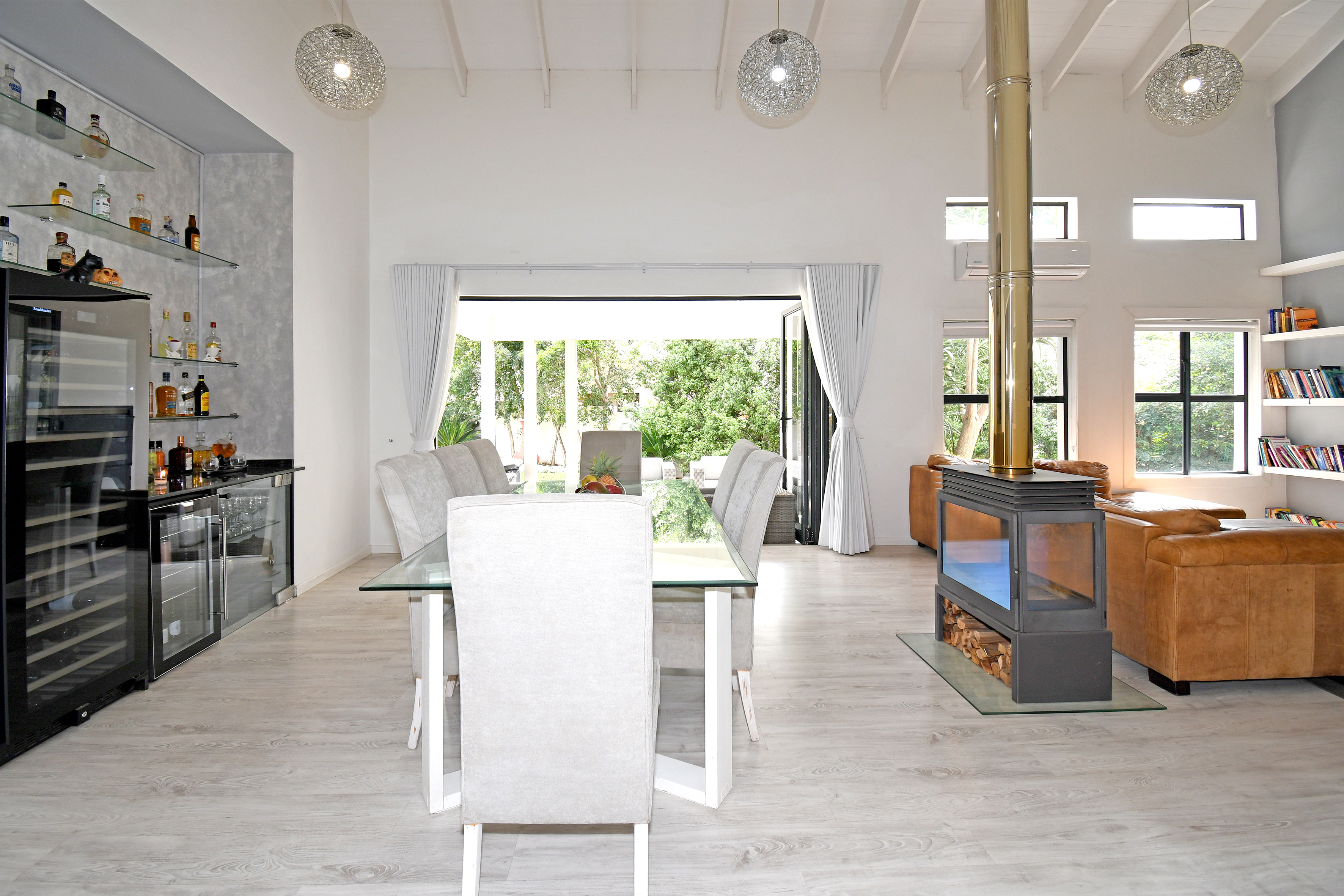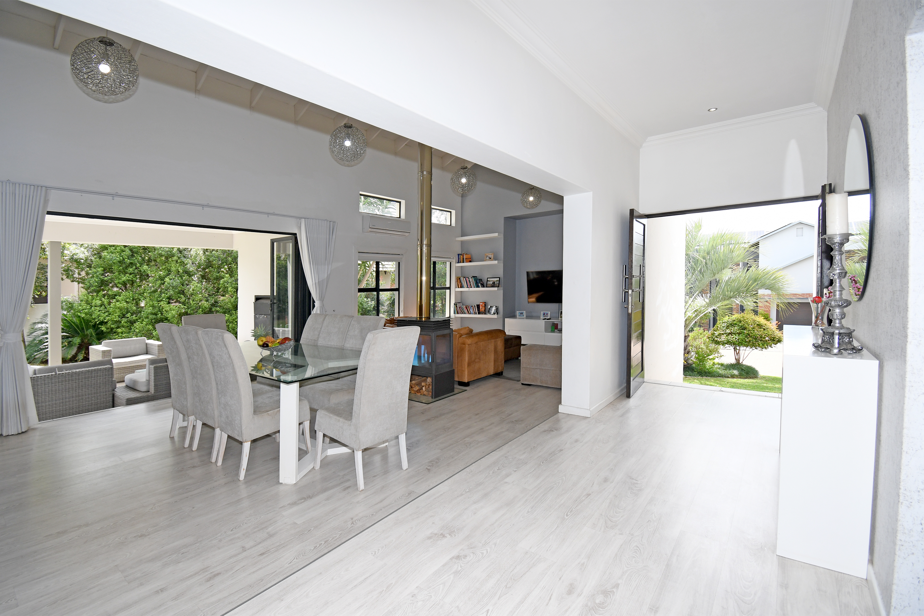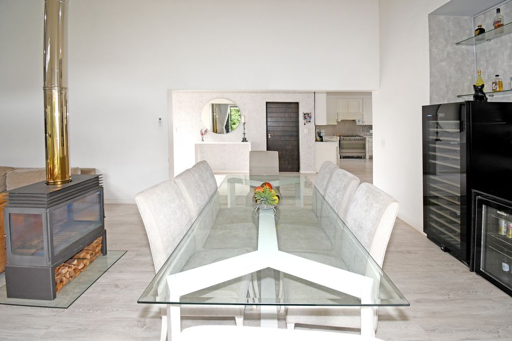 Beyond its cutting-edge energy efficiency, this revamped single-storey masterpiece is designed for those who love space, comfort, and entertaining. Step inside to a grand entrance hall that leads to an open-plan living and dining area, flowing seamlessly onto a covered entertainer’s patio with a built-in braai. From here, you step into a beautifully landscaped garden with a heated pool, perfect for year-round relaxation. When the temperatures drop, the elegant fireplace transforms the living space into a cozy retreat.