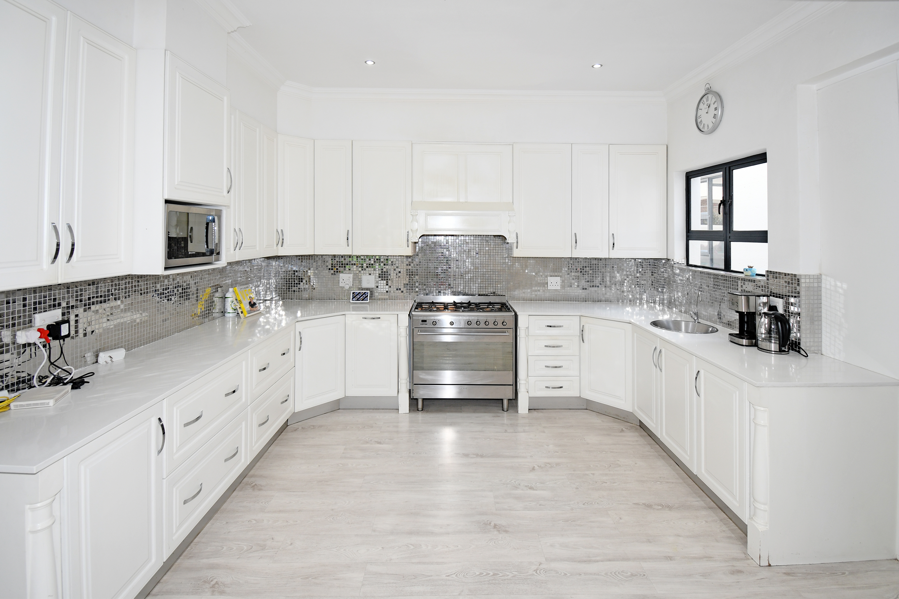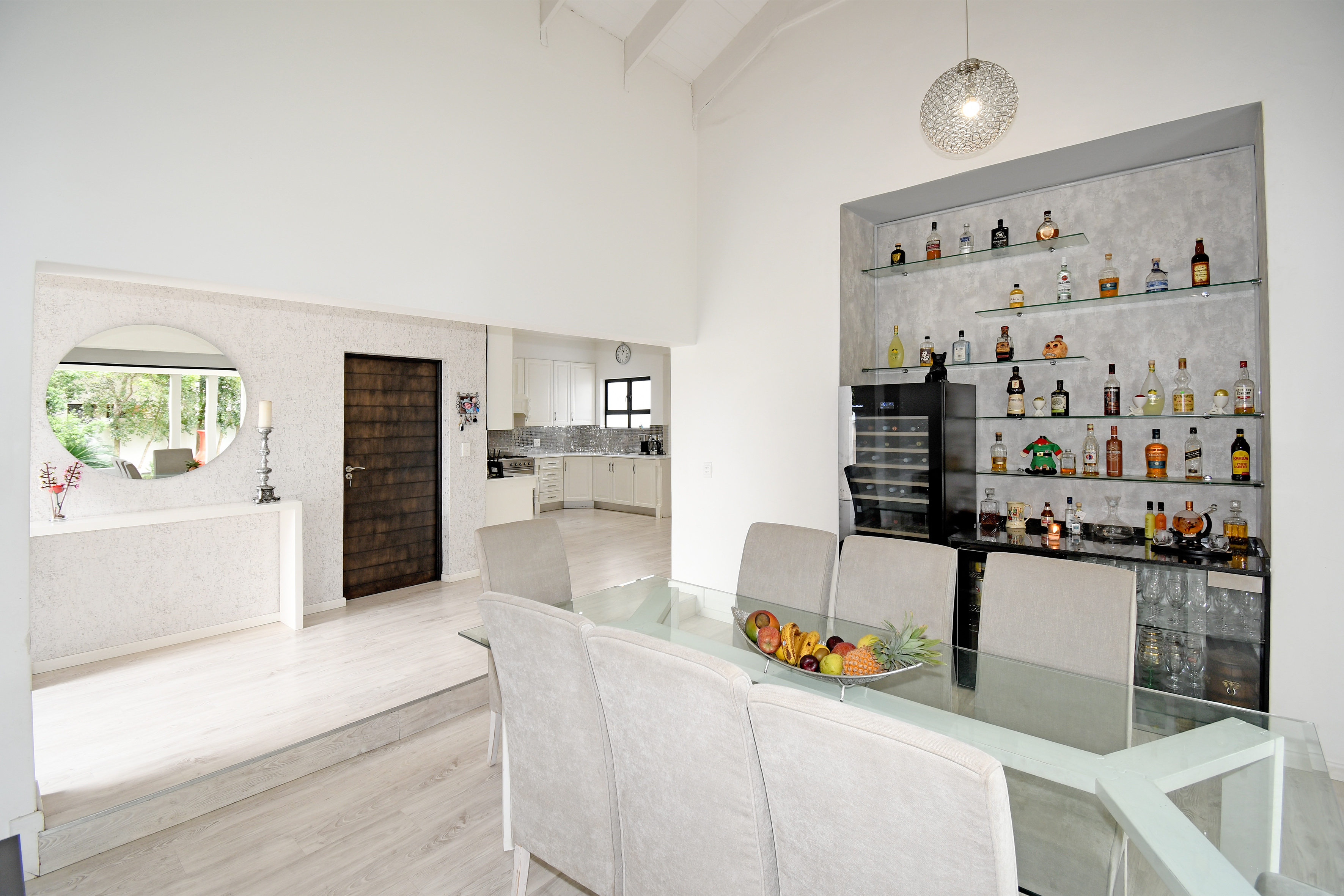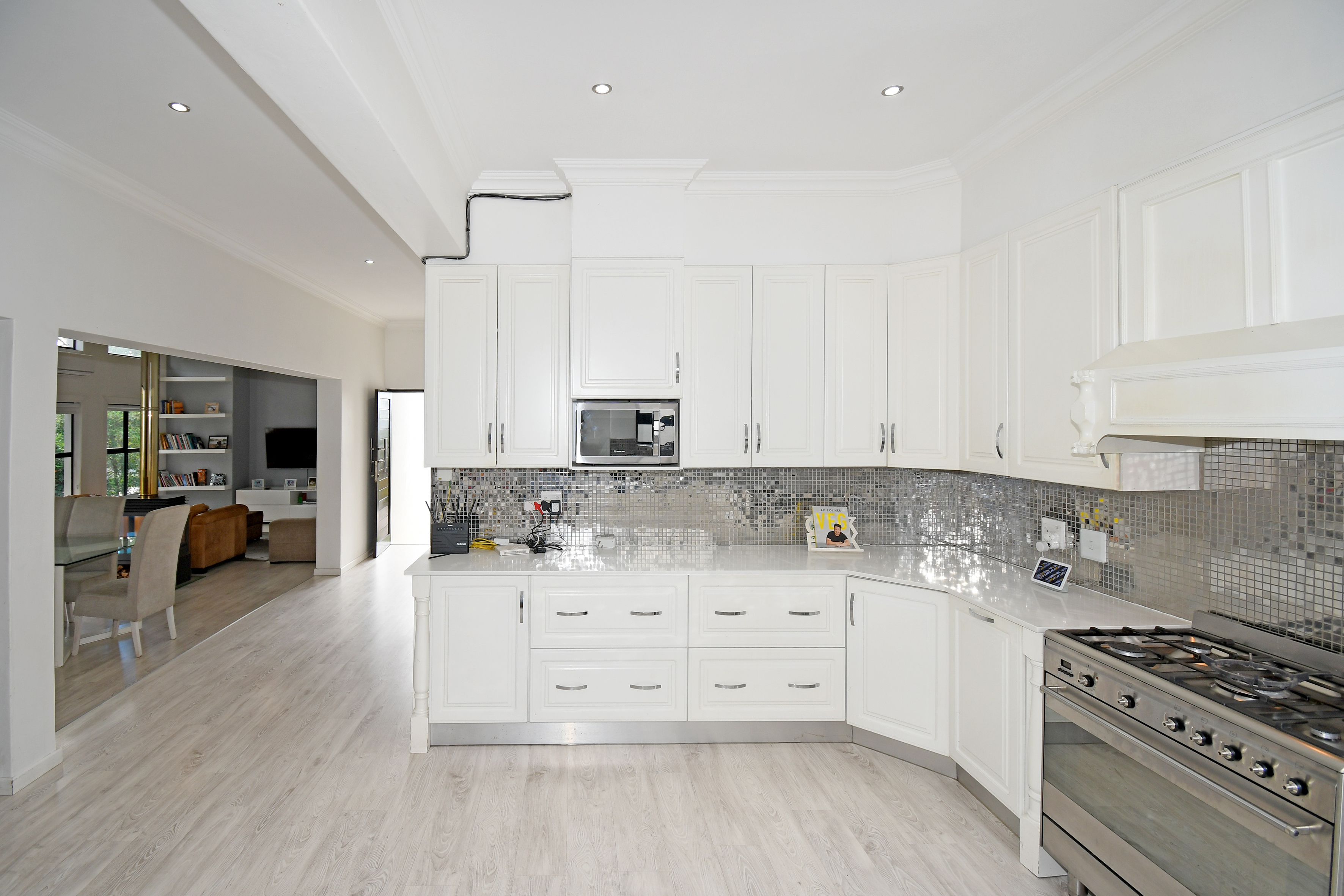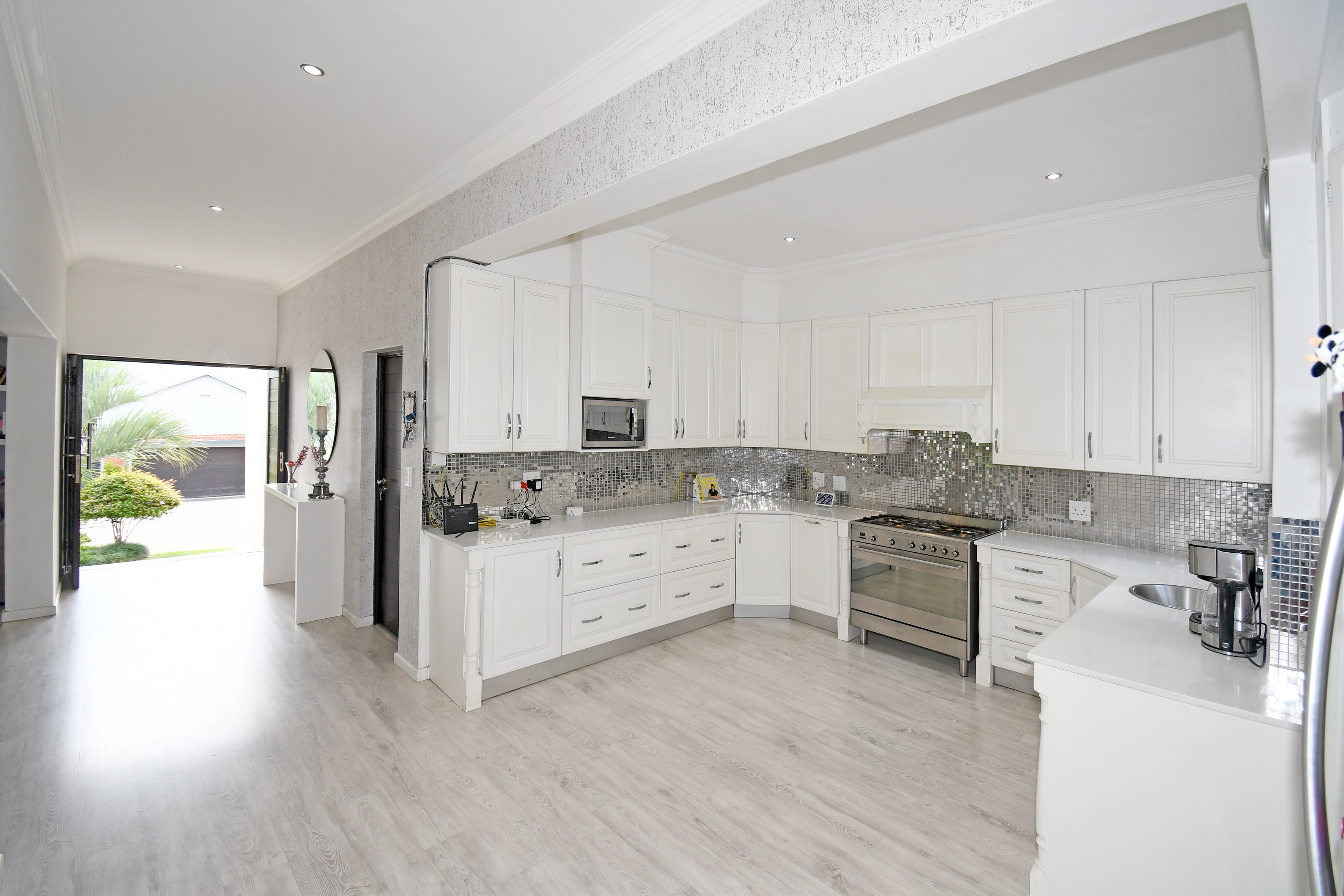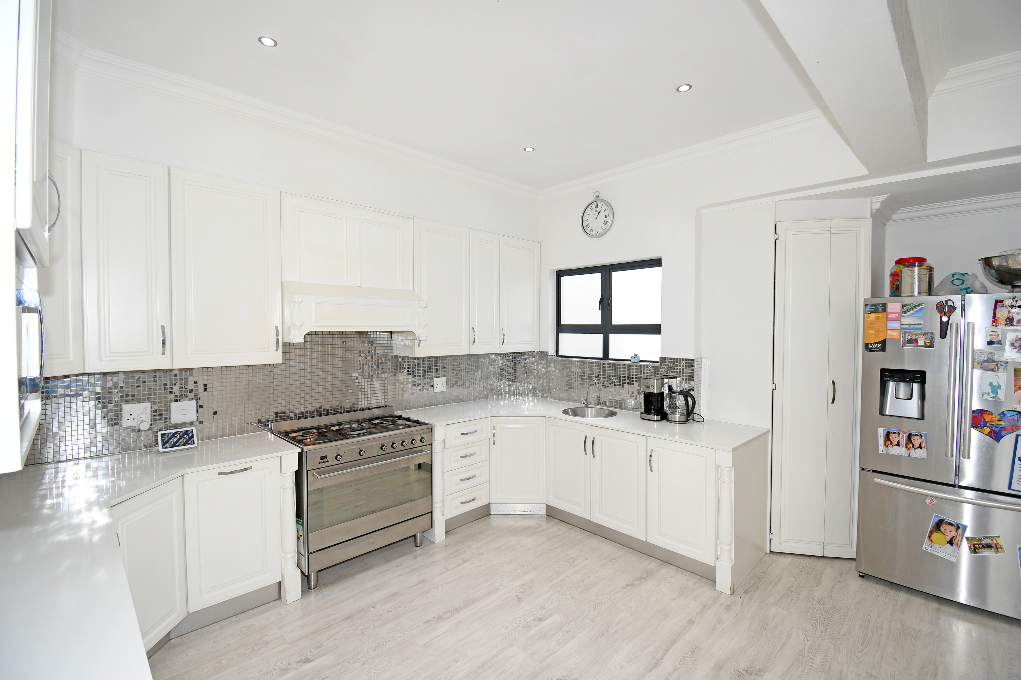 The chef’s kitchen is a dream come true—modern, spacious, and functional, with sleek finishes, ample storage, a walk-in pantry, and a separate scullery.