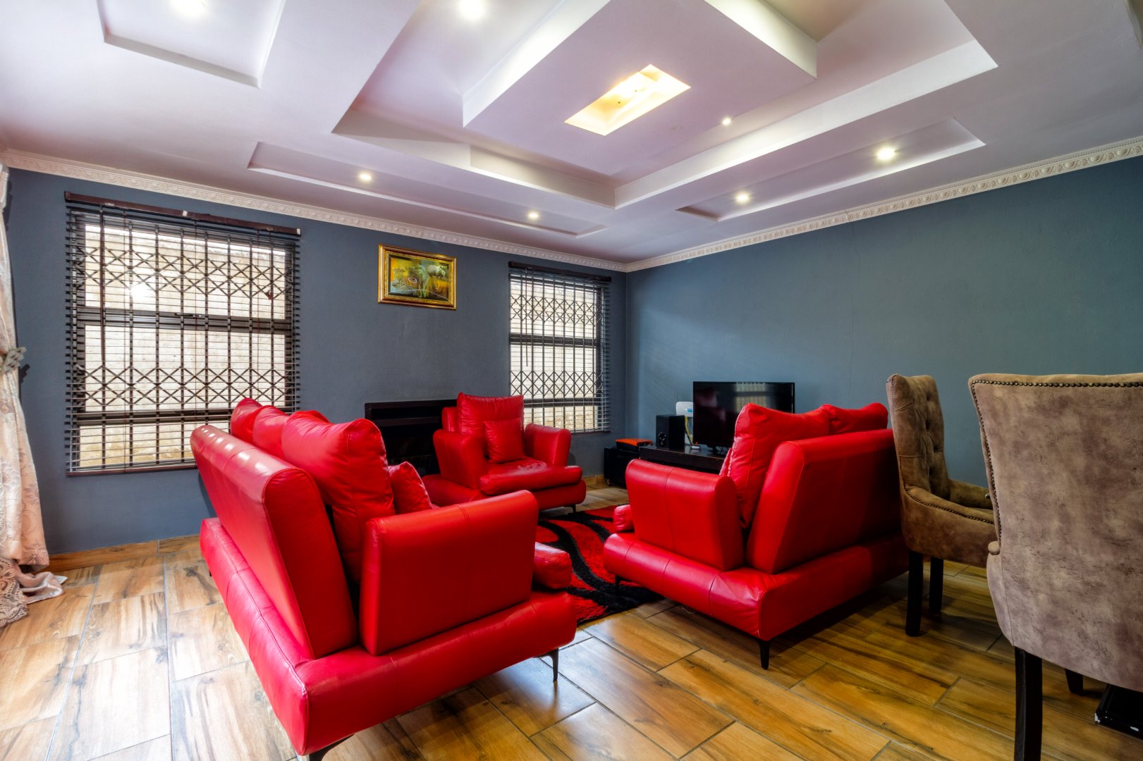 The lavishly large lounge has a fireplace and allows plenty of natural light, enveloping the area in a warm ambience.