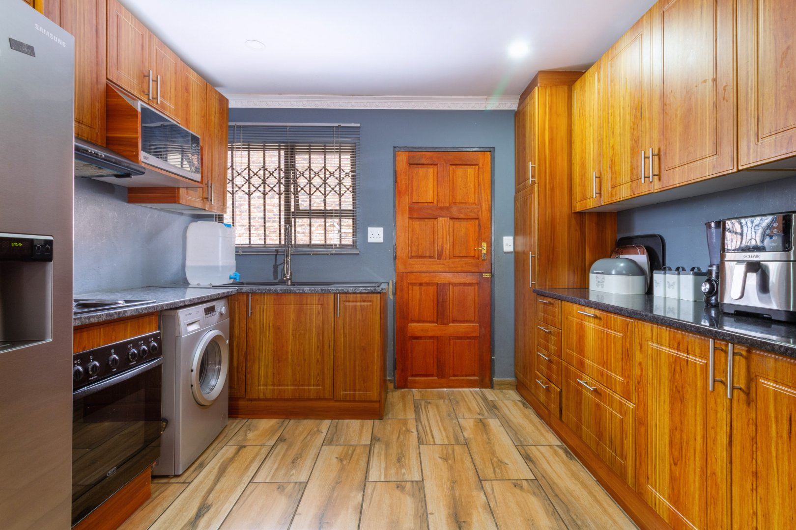 The kitchen comes with all the built-in cabinets your heart could desire, granite tops, space for a double door fridge, soft downlighting and built in wine racks.