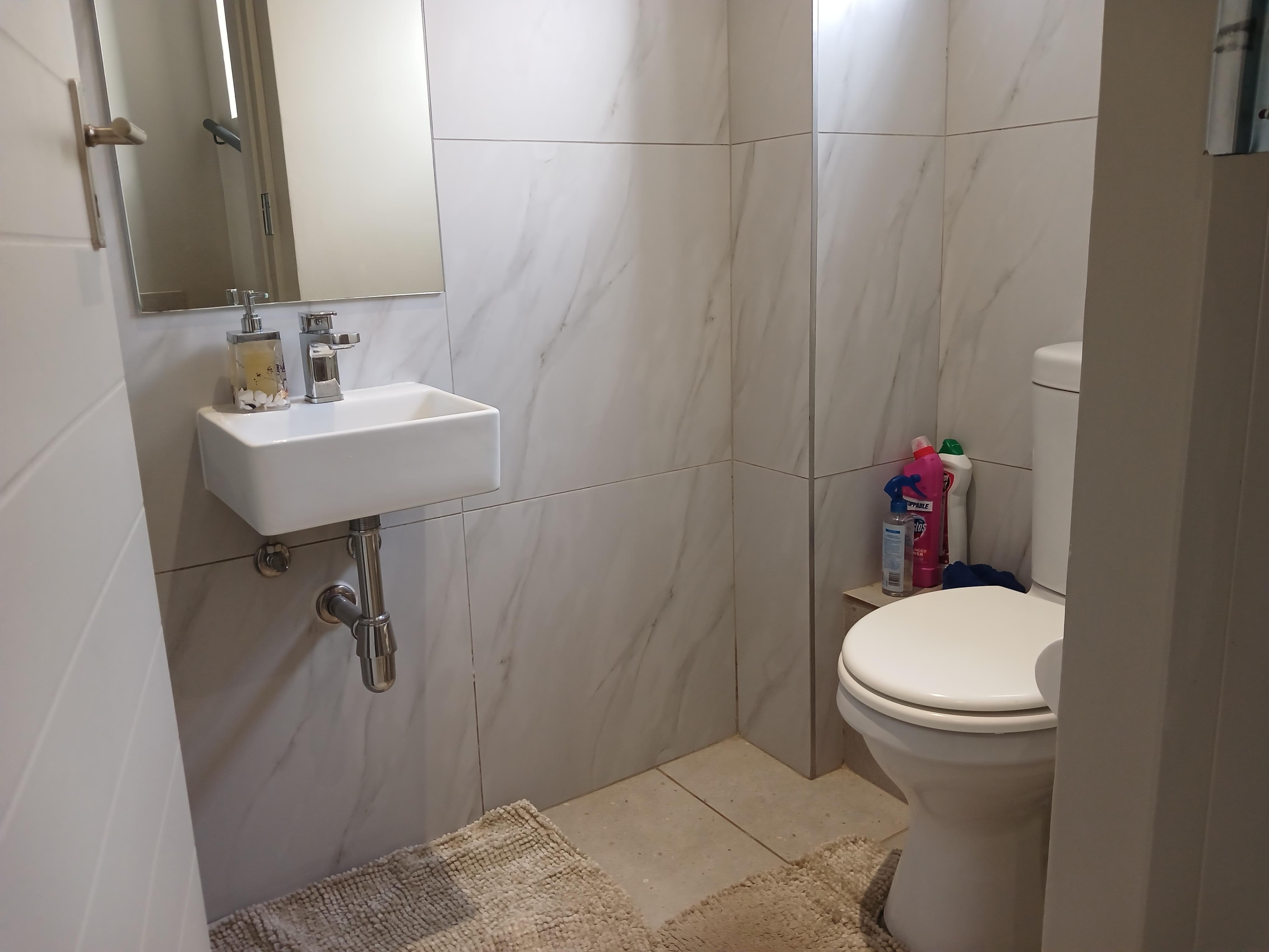 On the ground floor, the open-plan design effortlessly merges the lounge, dining area, and kitchen, which is tastefully finished with stylish cabinetry. A guest toilet adds to the convenience. A sliding door opens to a charming patio fitted with awnings, ideal for outdoor relaxation and entertaining. The property also includes a double carport for your convenience.
