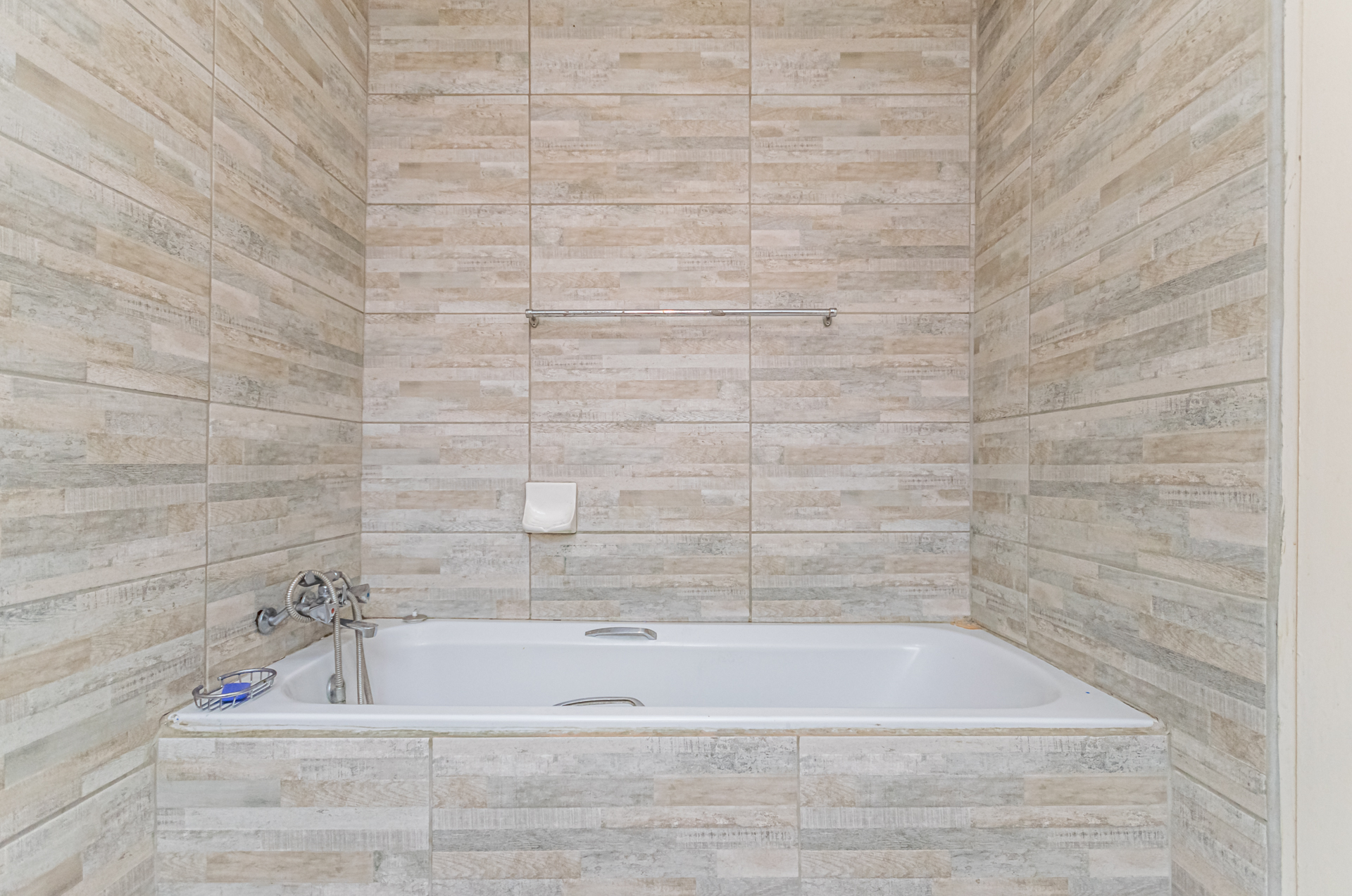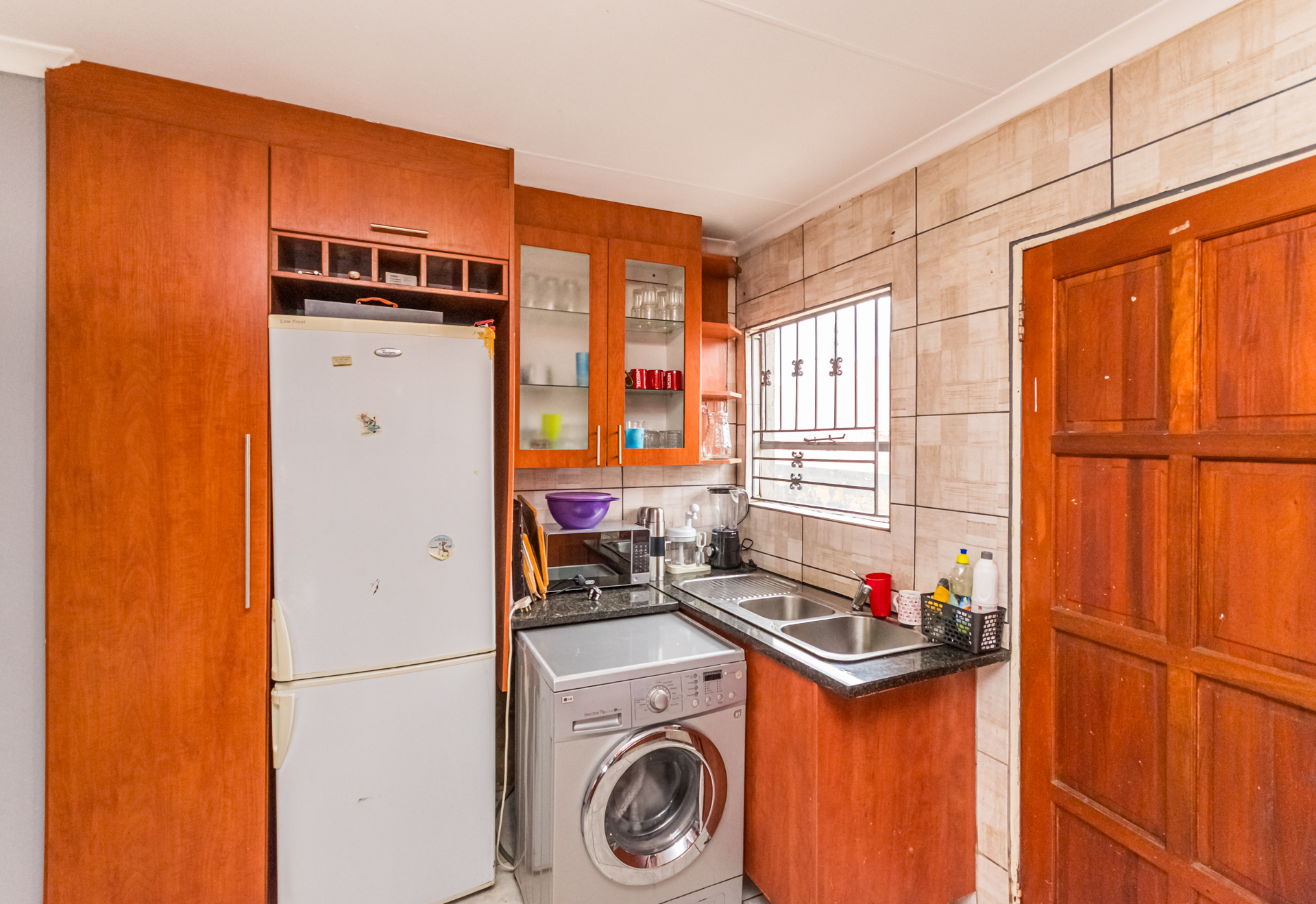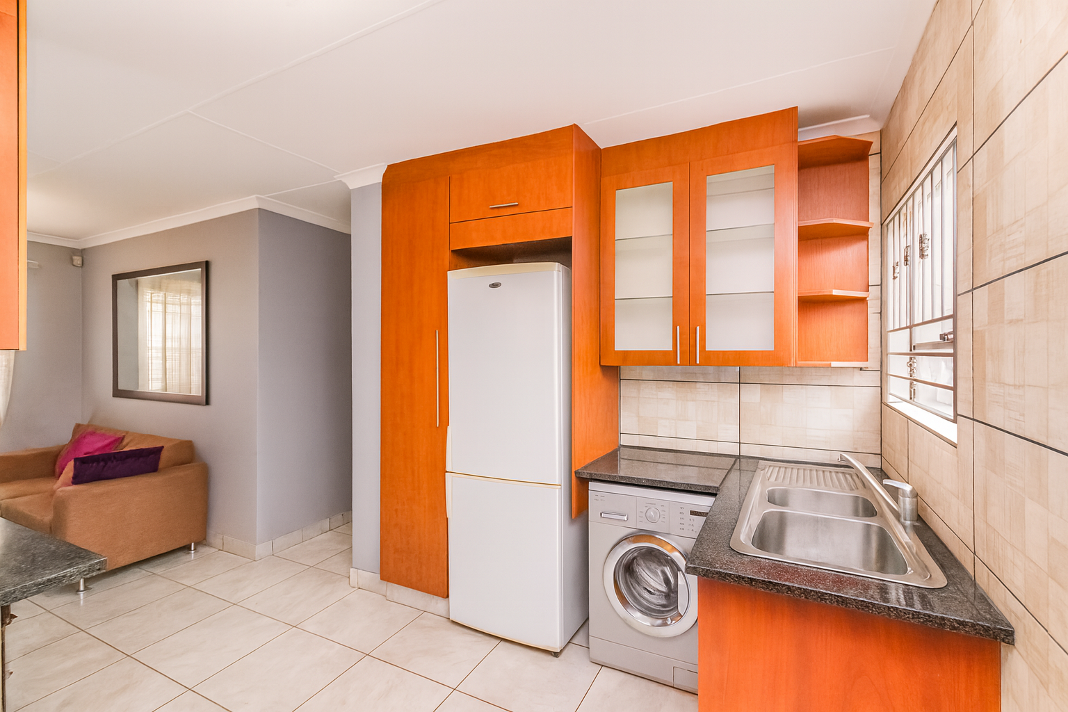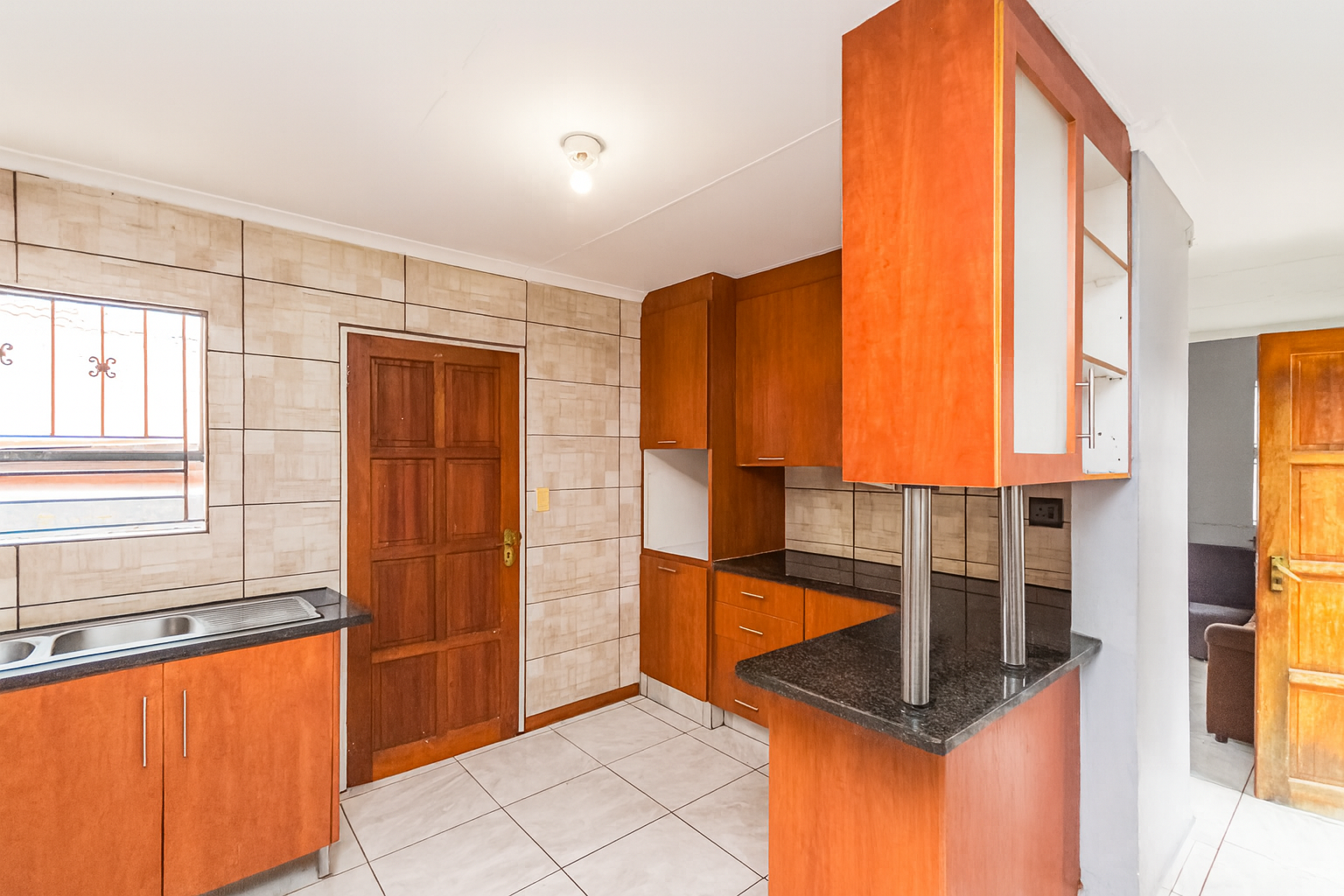 The kitchen has a lot of cupboard space, a four-plate stove, an oven, and an extractor fan. There is wall-to-wall tiling for that neat finishing and a double sink for easy washing of dishes.