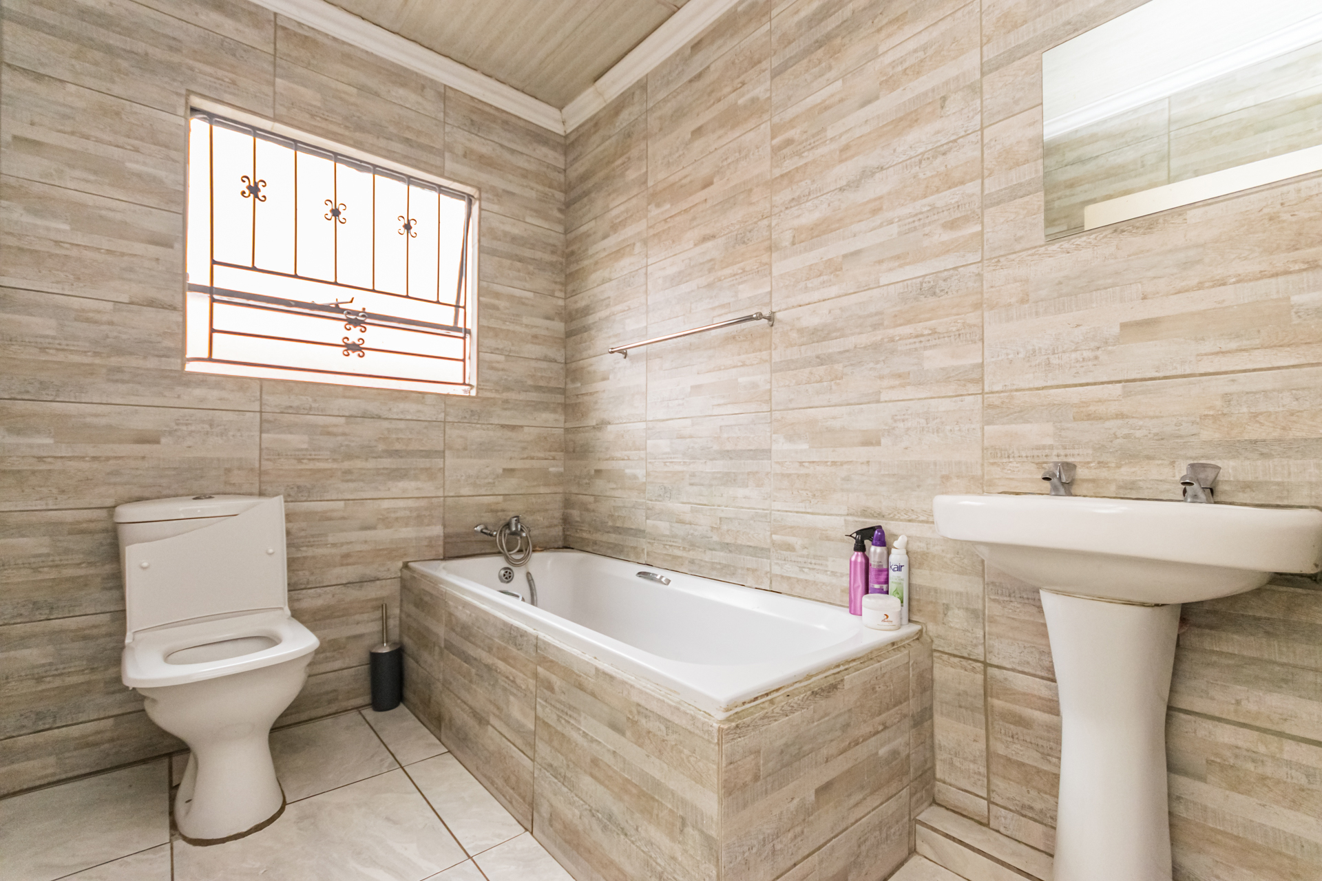 All the bedrooms have fitted wardrobes. The floors are tiled. The full ensuite bathroom, which comes with a bath, shower, toilet, and basin, has wall-to-wall tiling. The guest bathroom also has wall-to-wall tiling offering a bath, toilet, and basin.