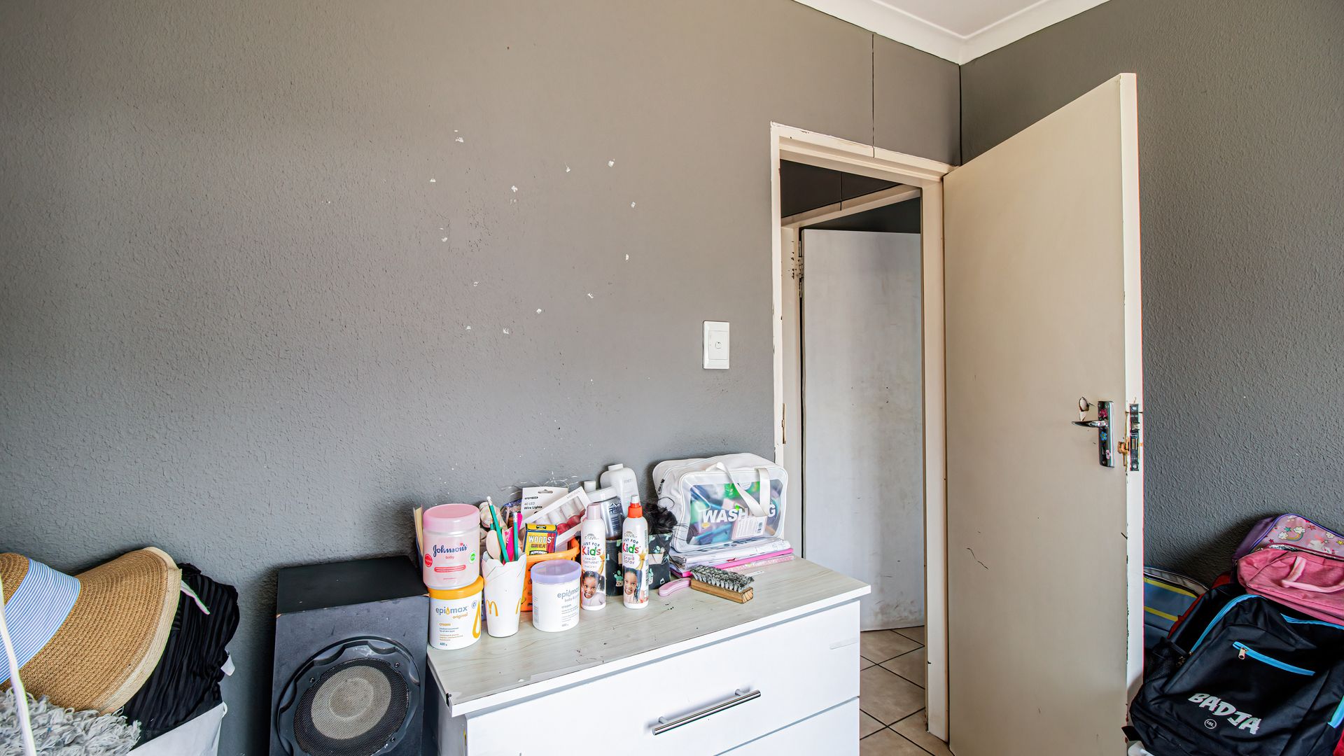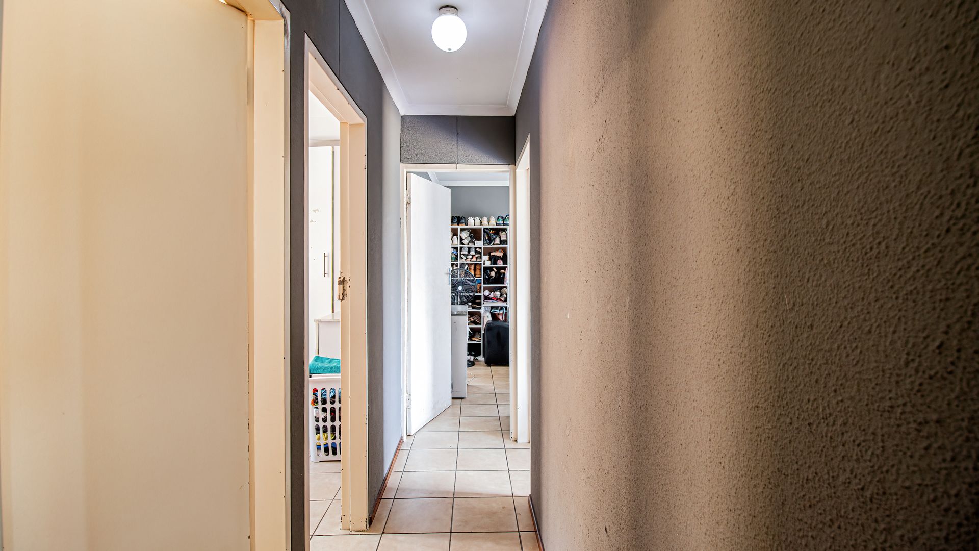 A passage from the lounge leads to three generously sized bedrooms. The main bedroom features an en-suite bathroom, while the other two bedrooms are large enough to comfortably fit queen-sized beds, making them ideal for children, guests, or a home office. The family bathroom, fitted with a bathtub, is conveniently located in the passage.