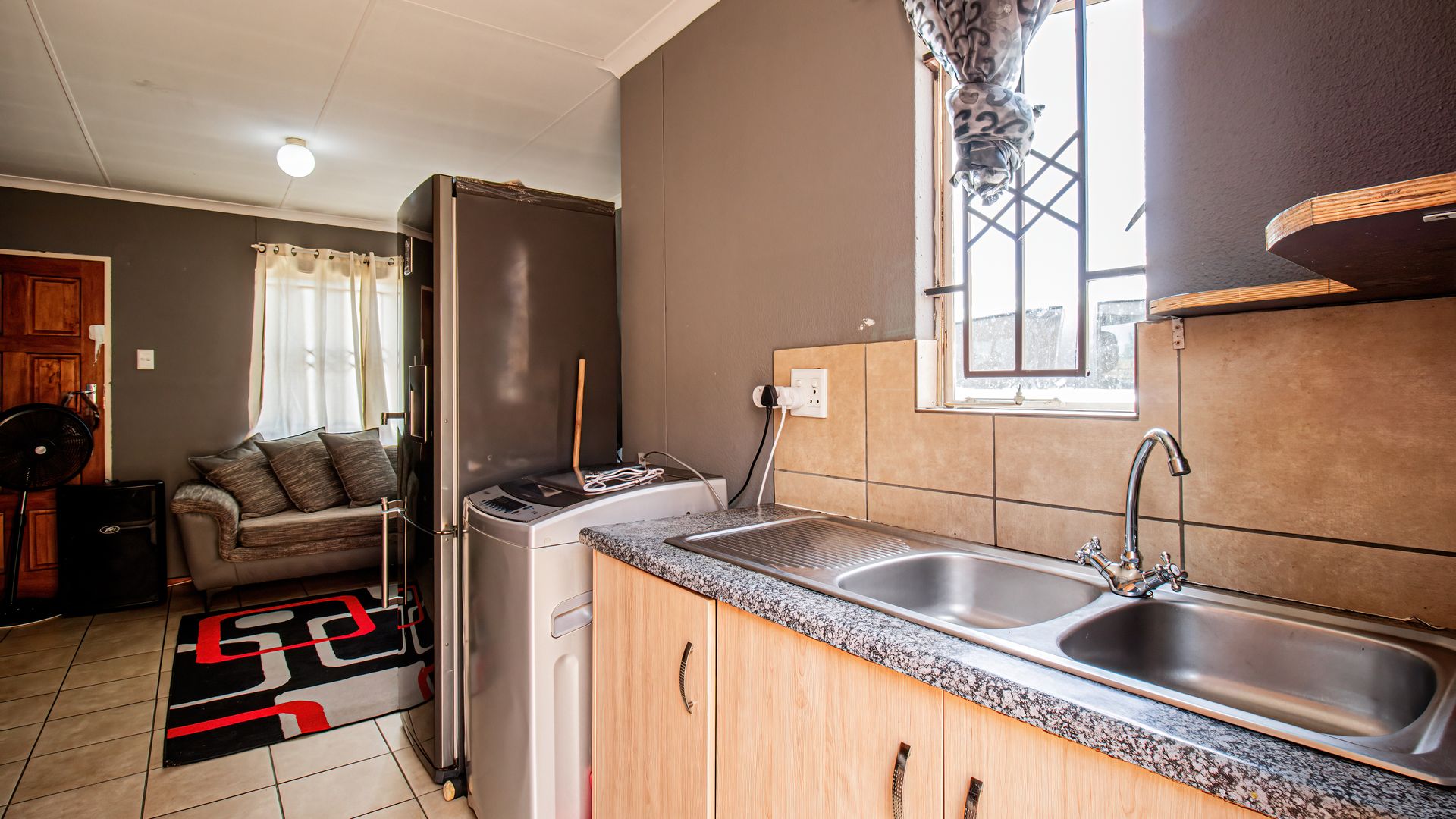 The home boasts a modern kitchen with granite countertops, ample cupboard space, and room for appliances — perfect for busy family life. The kitchen flows into a spacious open-plan lounge, creating a welcoming area for family time, relaxing, and watching TV together.