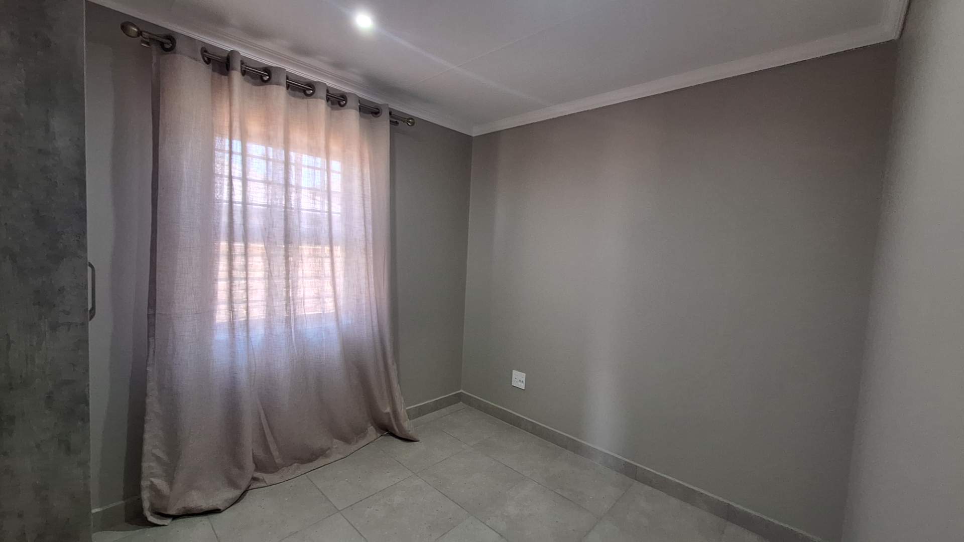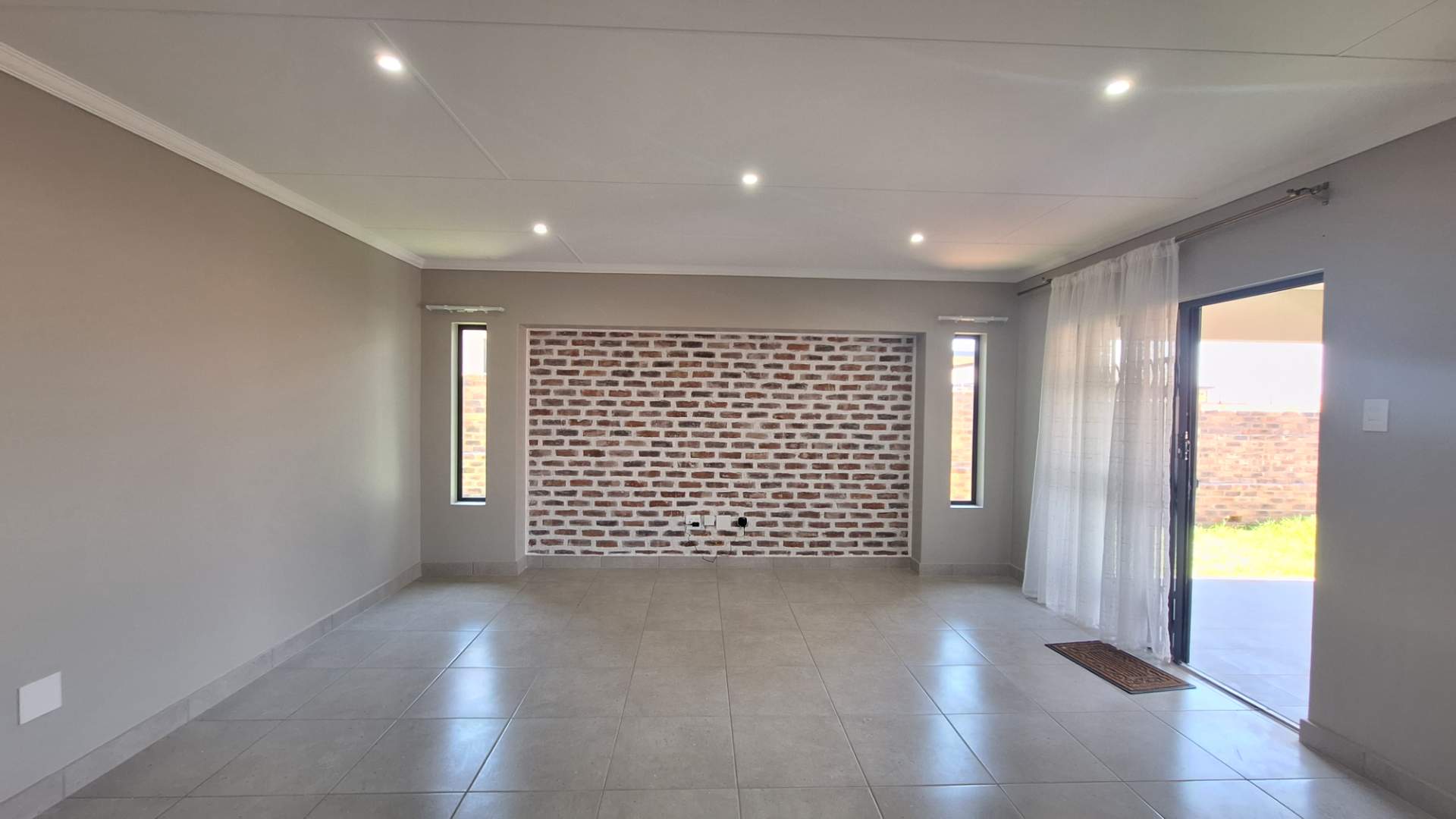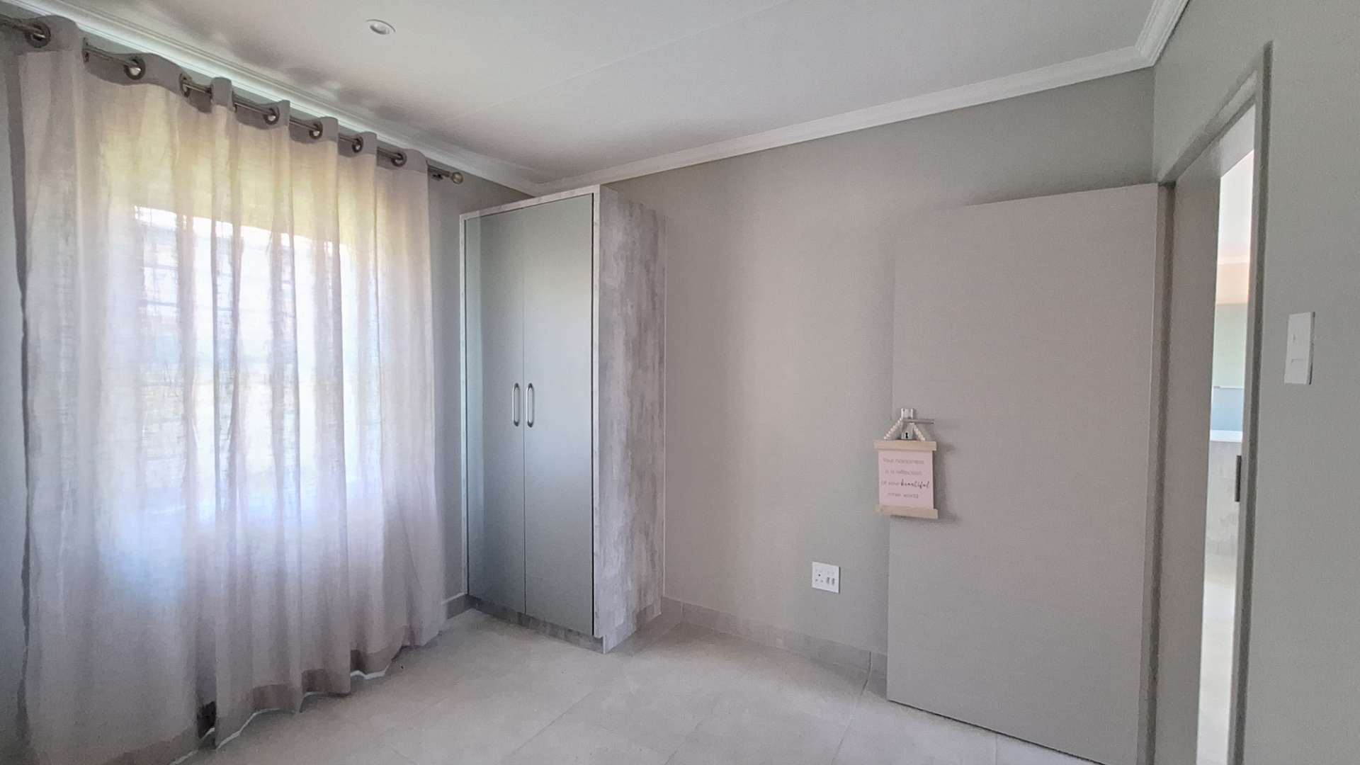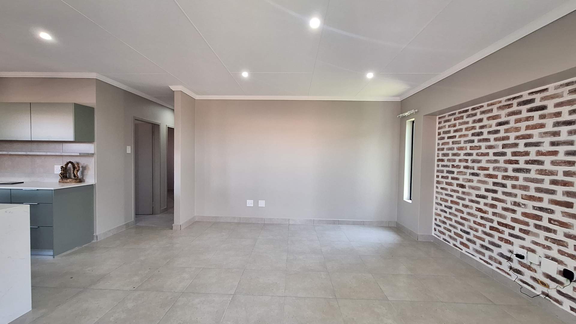 This newly built 3 bedroom, 2 bathroom cluster is located in Lion Pride Estate. The unit is fully tiled throughout and fitted with downlights, with neat, modern finishes. The open-plan living and kitchen area is well sized, with an exposed brick feature wall in the living room. Sliding doors lead from the living area onto the patio, fitted with an expandable trellis security gate.