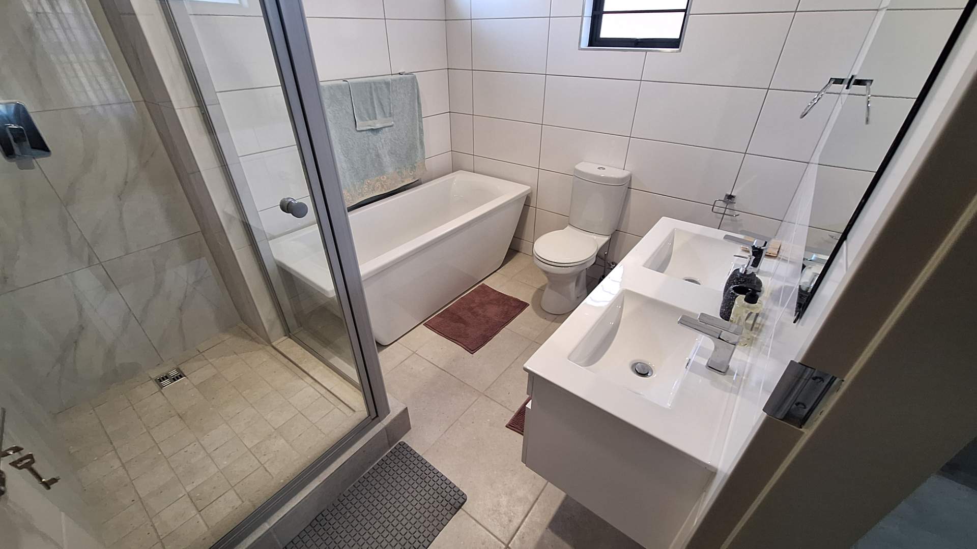 The second bathroom is fitted with a bath and shower nozzle. The second and third bedrooms can accommodate double beds and include built-in cupboards. The main bedroom can comfortably fit a queen-size bed and has a six-door built-in cupboard with dresser. The en-suite bathroom includes both a bath and shower.