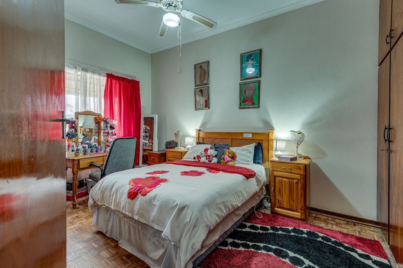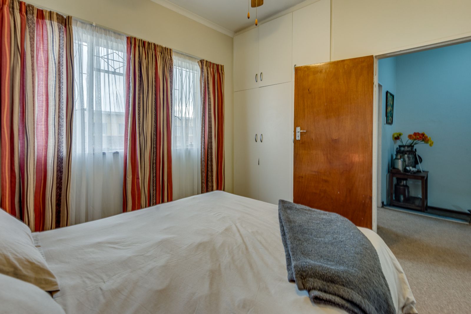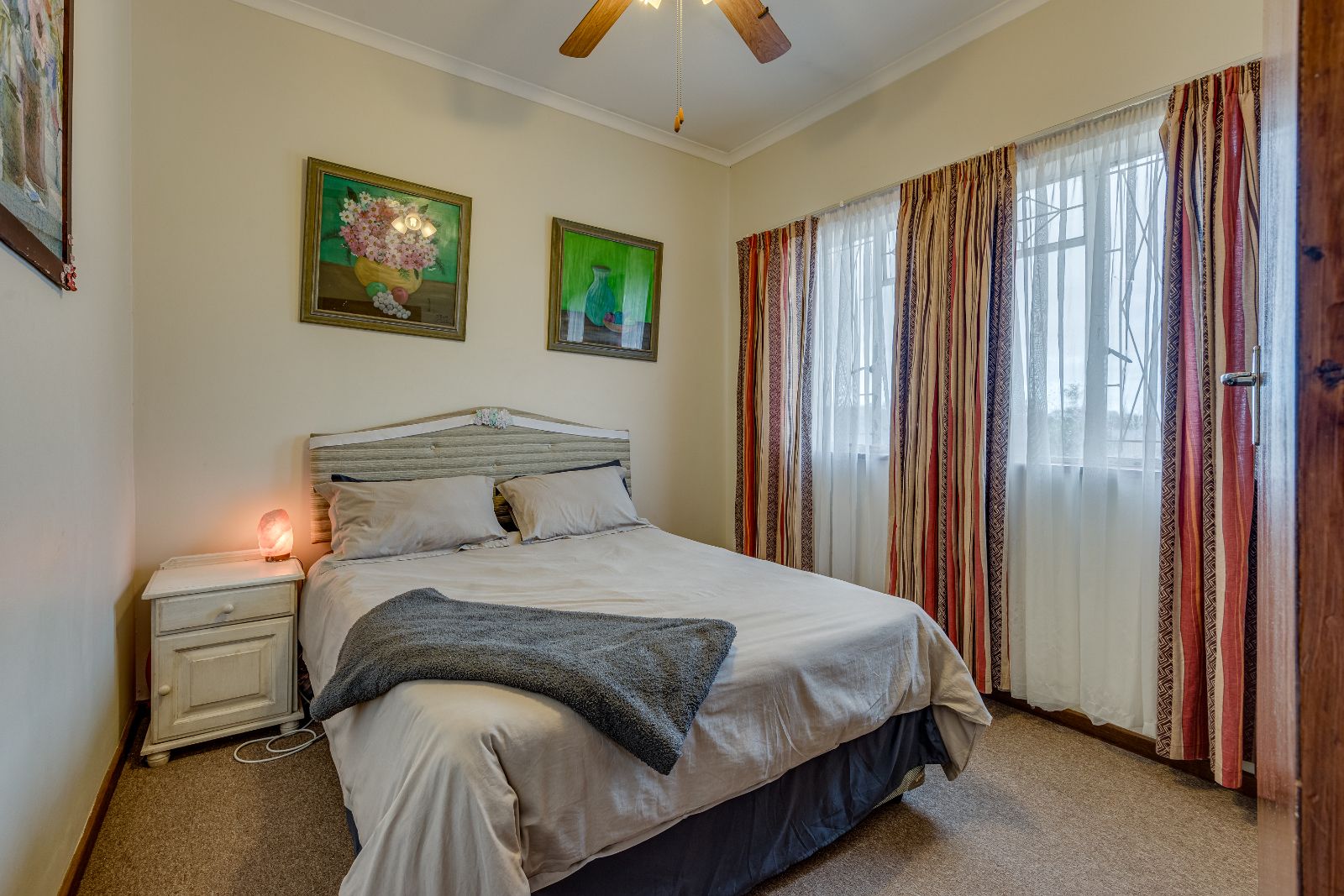 Upstairs you’ll find three bedrooms, all with built-in cupboards and ceiling fans, as well as a family bathroom fitted with a bath with shower over the bath.