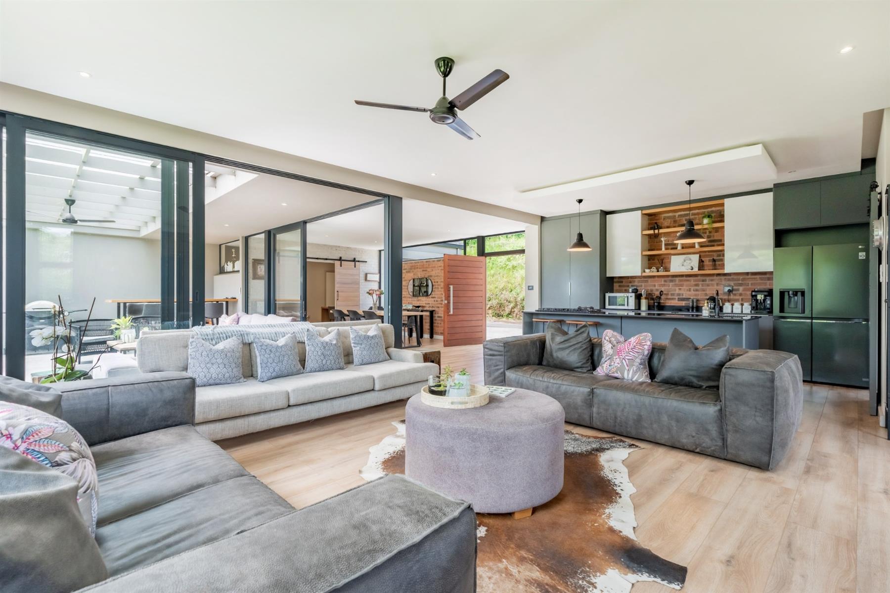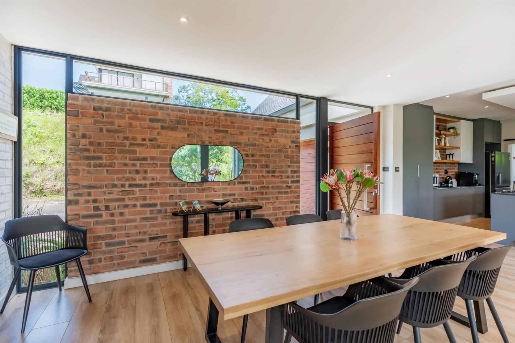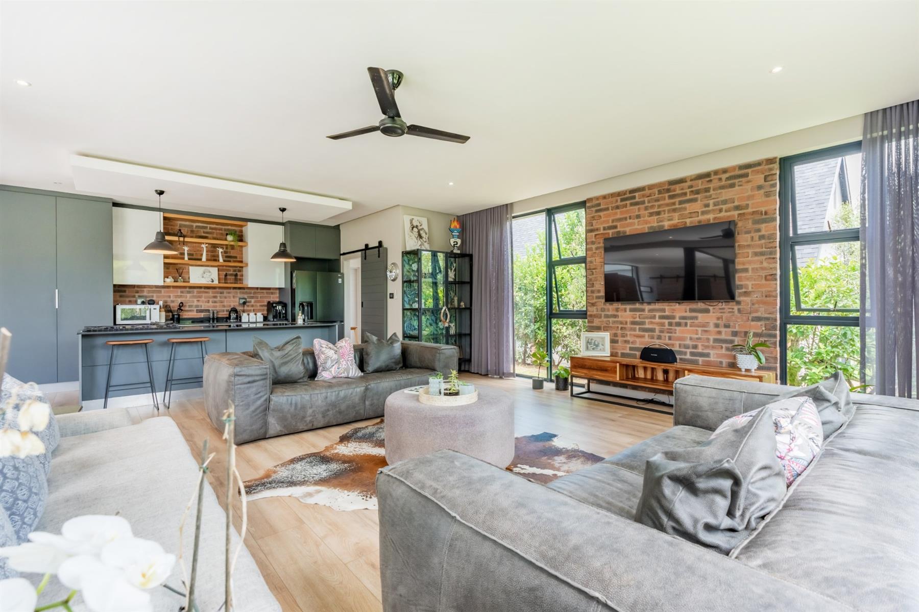 Perfectly positioned just a stone’s throw from the main entrance and within close proximity to the leisure centre, this stylish family home offers both convenience and estate living at its finest. From the moment you enter, you are welcomed by an abundance of natural light flowing through expansive glass features, beautifully highlighting the home’s modern design. The charcoal grey kitchen is both sleek and functional, complemented by exposed brick feature walls that add character and warmth throughout the living spaces.