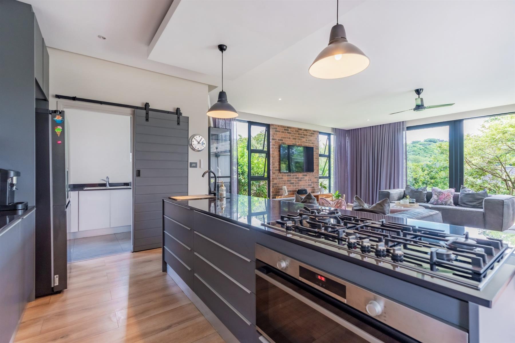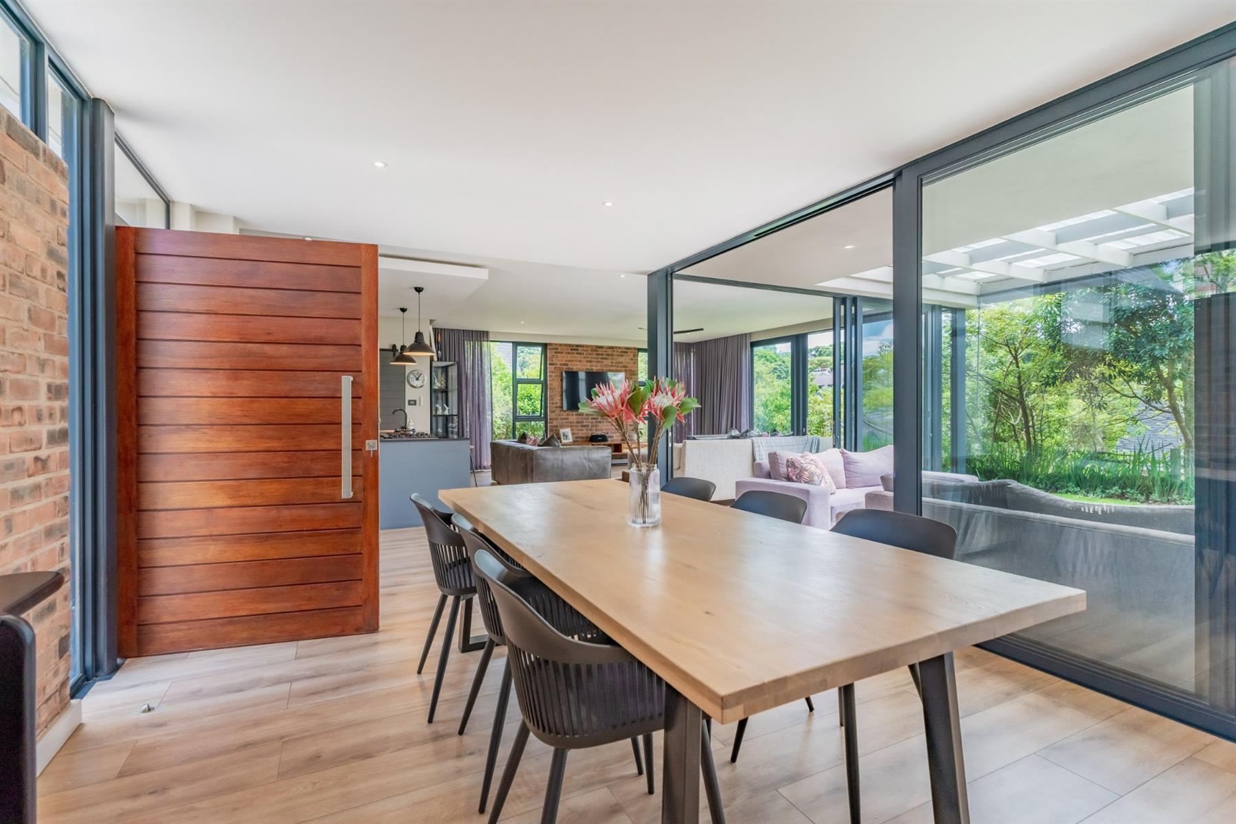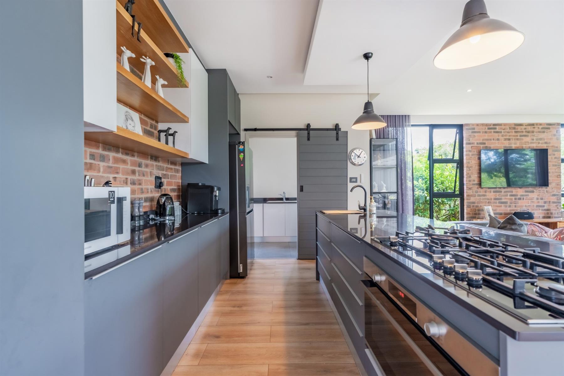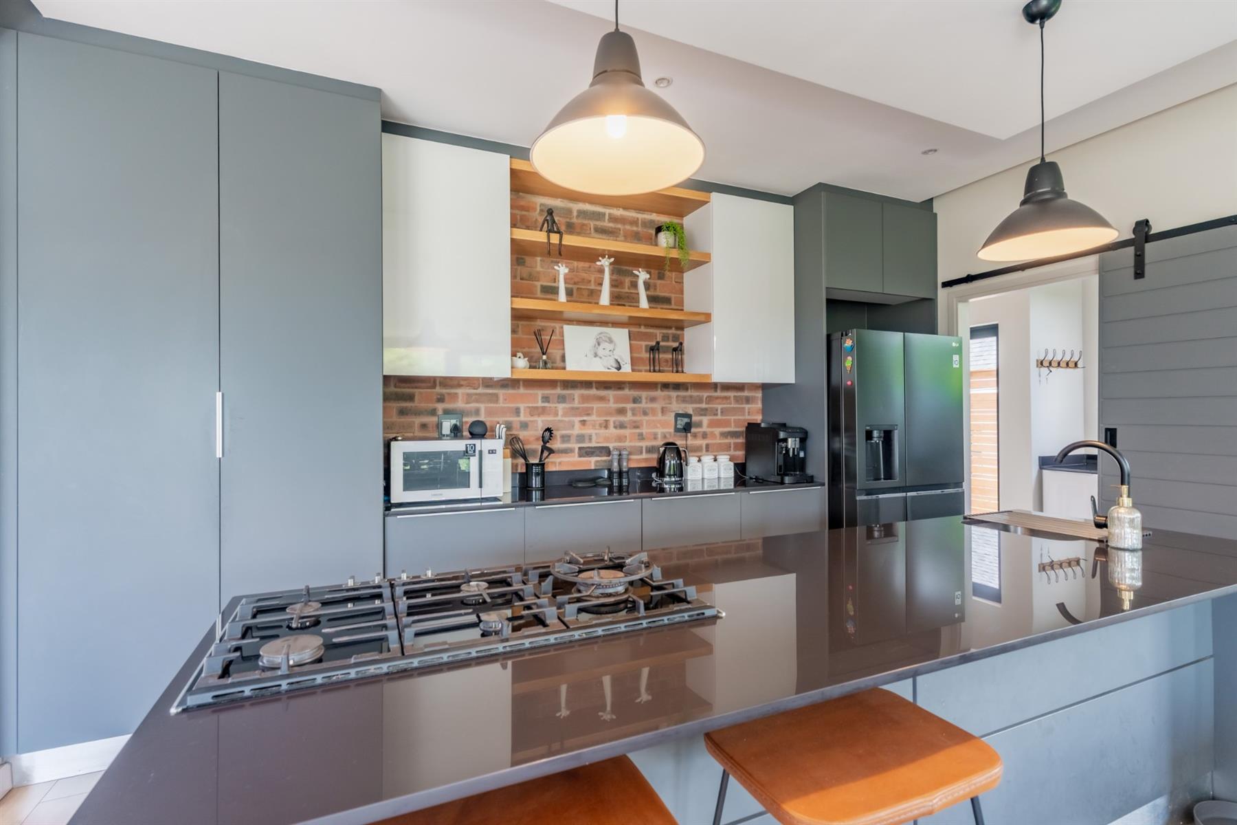 Perfectly positioned just a stone’s throw from the main entrance and within close proximity to the leisure centre, this stylish family home offers both convenience and estate living at its finest. From the moment you enter, you are welcomed by an abundance of natural light flowing through expansive glass features, beautifully highlighting the home’s modern design. The charcoal grey kitchen is both sleek and functional, complemented by exposed brick feature walls that add character and warmth throughout the living spaces.