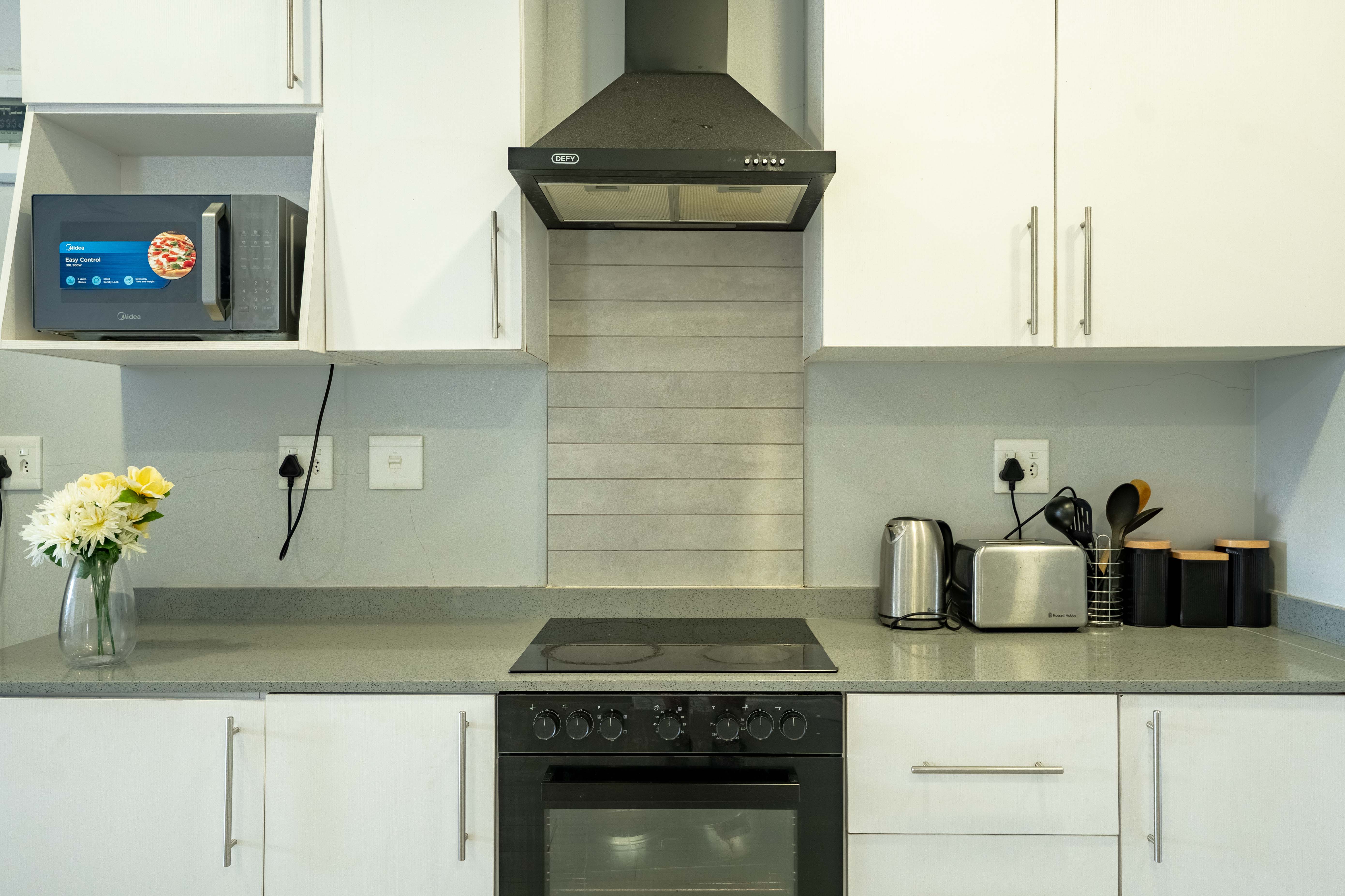 This elegant third-floor apartment offers a thoughtfully designed open-plan layout, complemented by sophisticated laminate flooring throughout. Accommodation includes two spacious bedrooms, each equipped with built-in cupboards. The main bedroom features a private en-suite bathroom with a shower, while the second bathroom is fitted with a convenient shower-over-bath configuration. The modern kitchen is appointed with granite countertops, an undercounter oven, and a sleek glass hob.