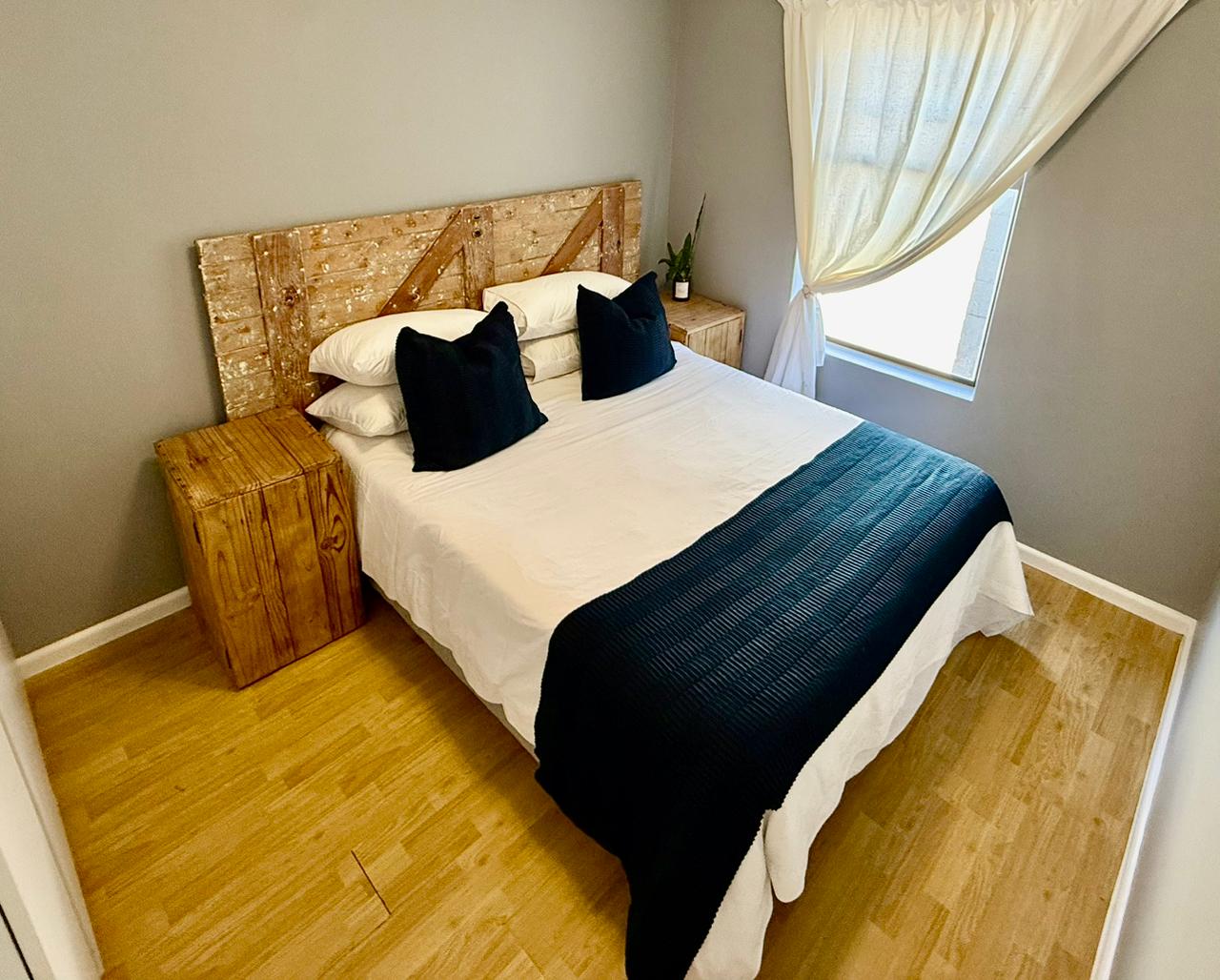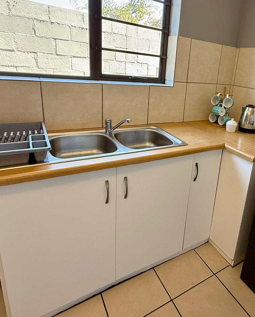 The apartment features an open-plan living area and kitchen. Please note that the kitchen does not include a stove. The living space opens out to a shared garden, which is shared with the upstairs flat (also available to rent), and includes a braai area—ideal for relaxed outdoor entertaining.