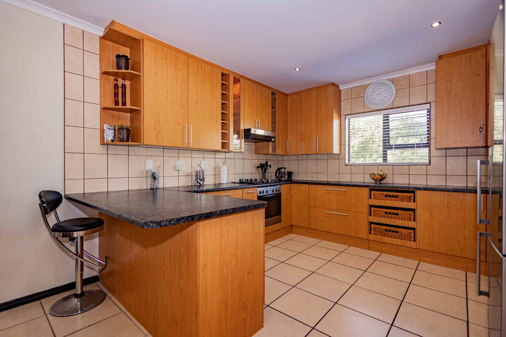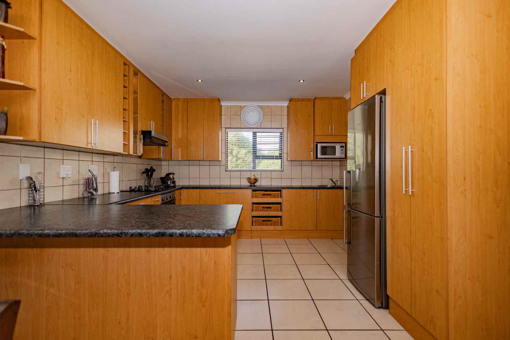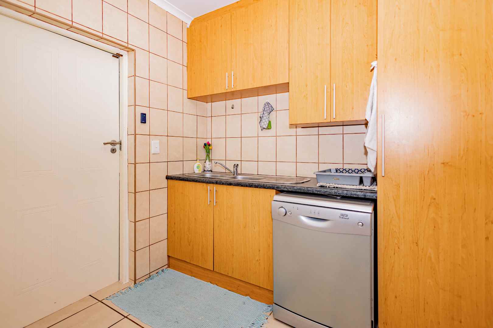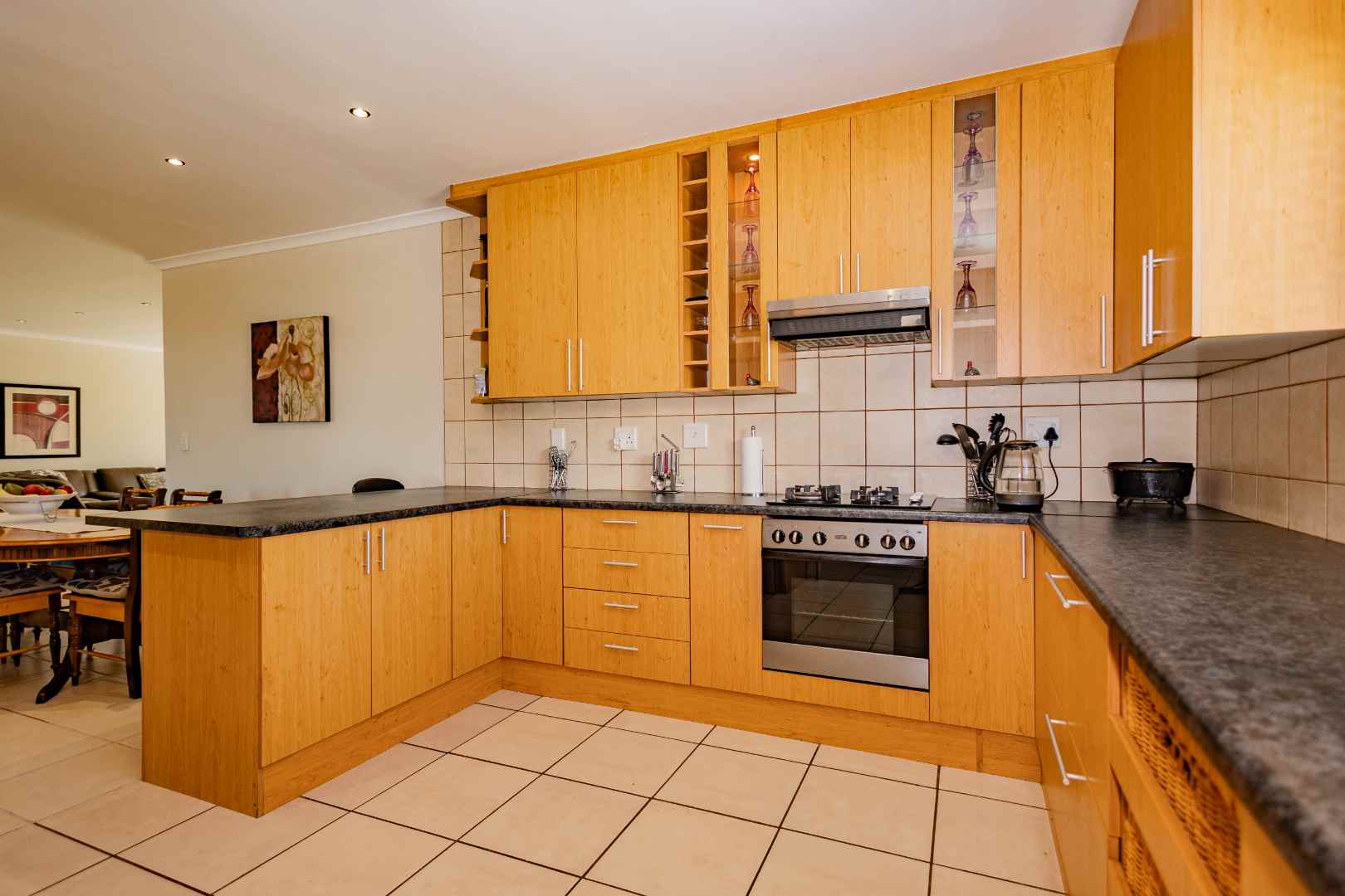 The open plan kitchen provides plenty of cupboards and a scullery with two water points.