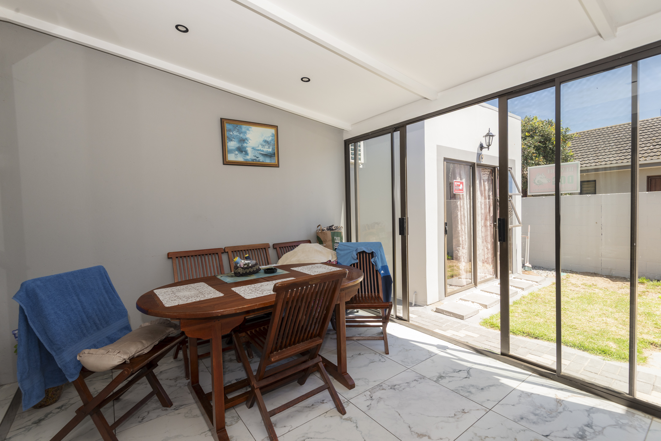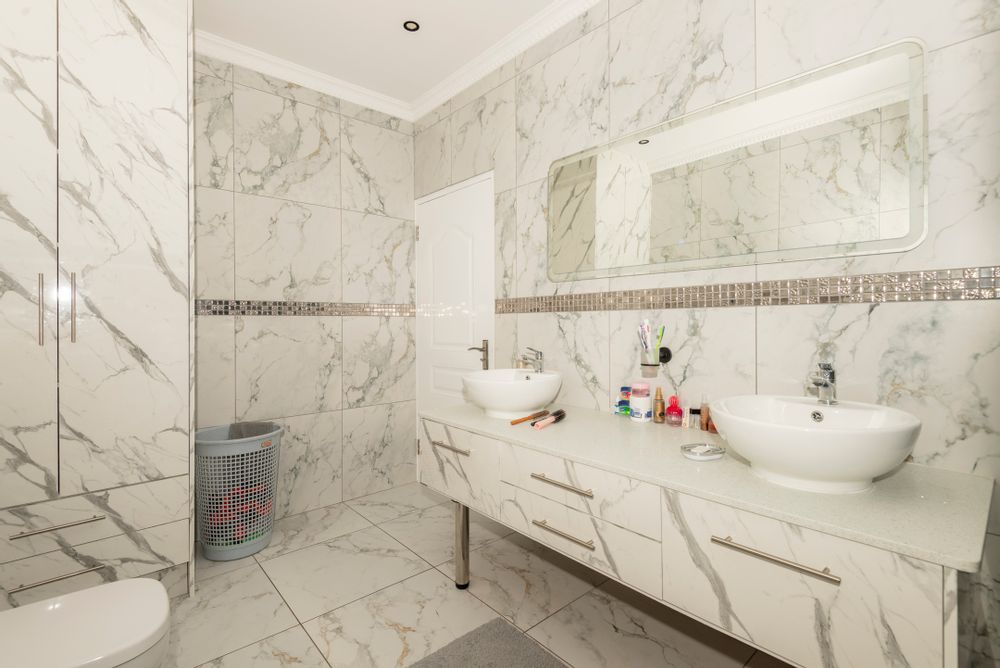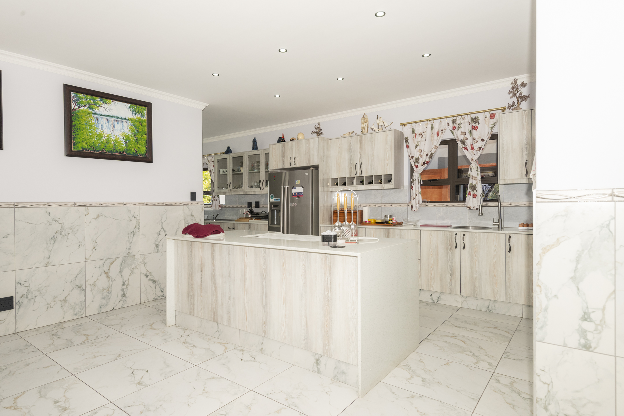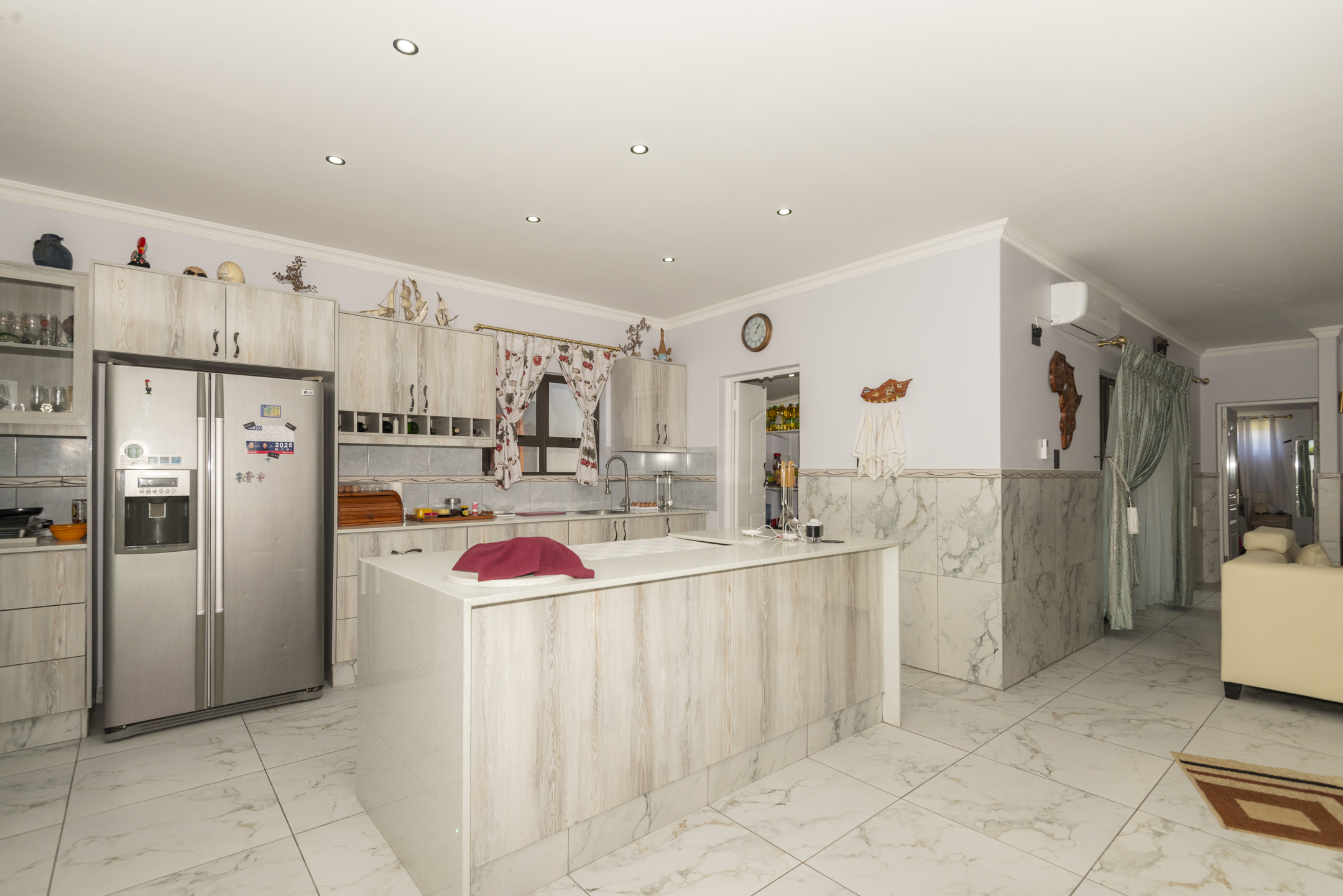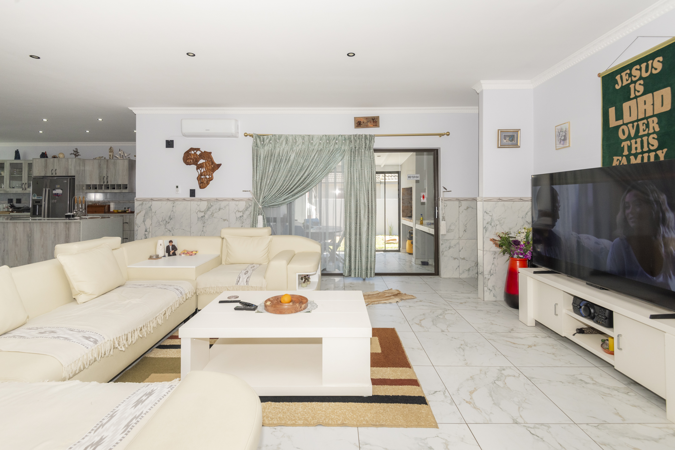 Lovingly maintained by its original owner, the home presents as brand new — showcasing stylish marble floors, a beautifully appointed kitchen with engineered stone countertops, and a striking waterfall centre island. The open-plan layout creates a natural flow from the living and dining spaces to the enclosed braai room and outdoor firepit boma — perfect for entertaining all year round.