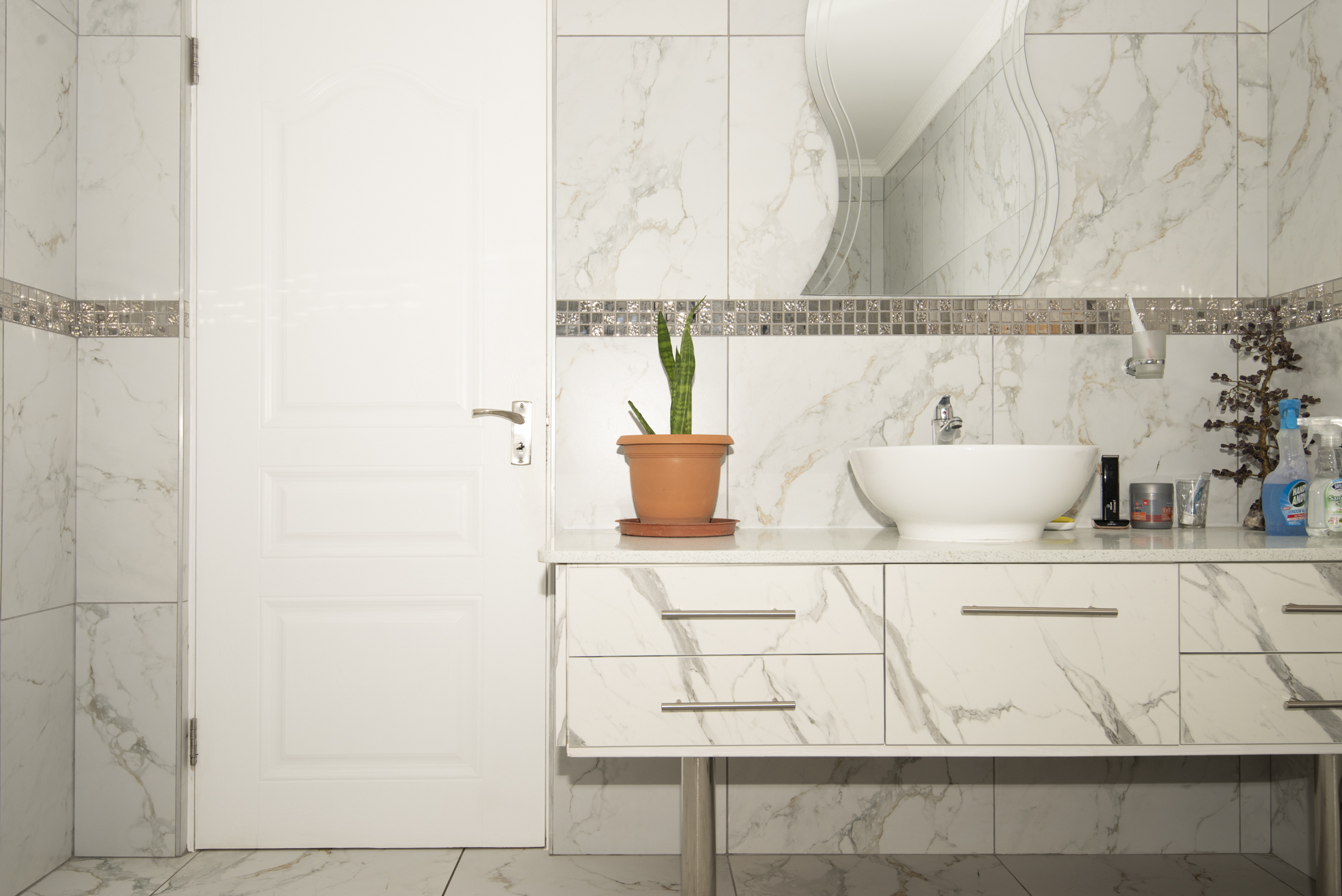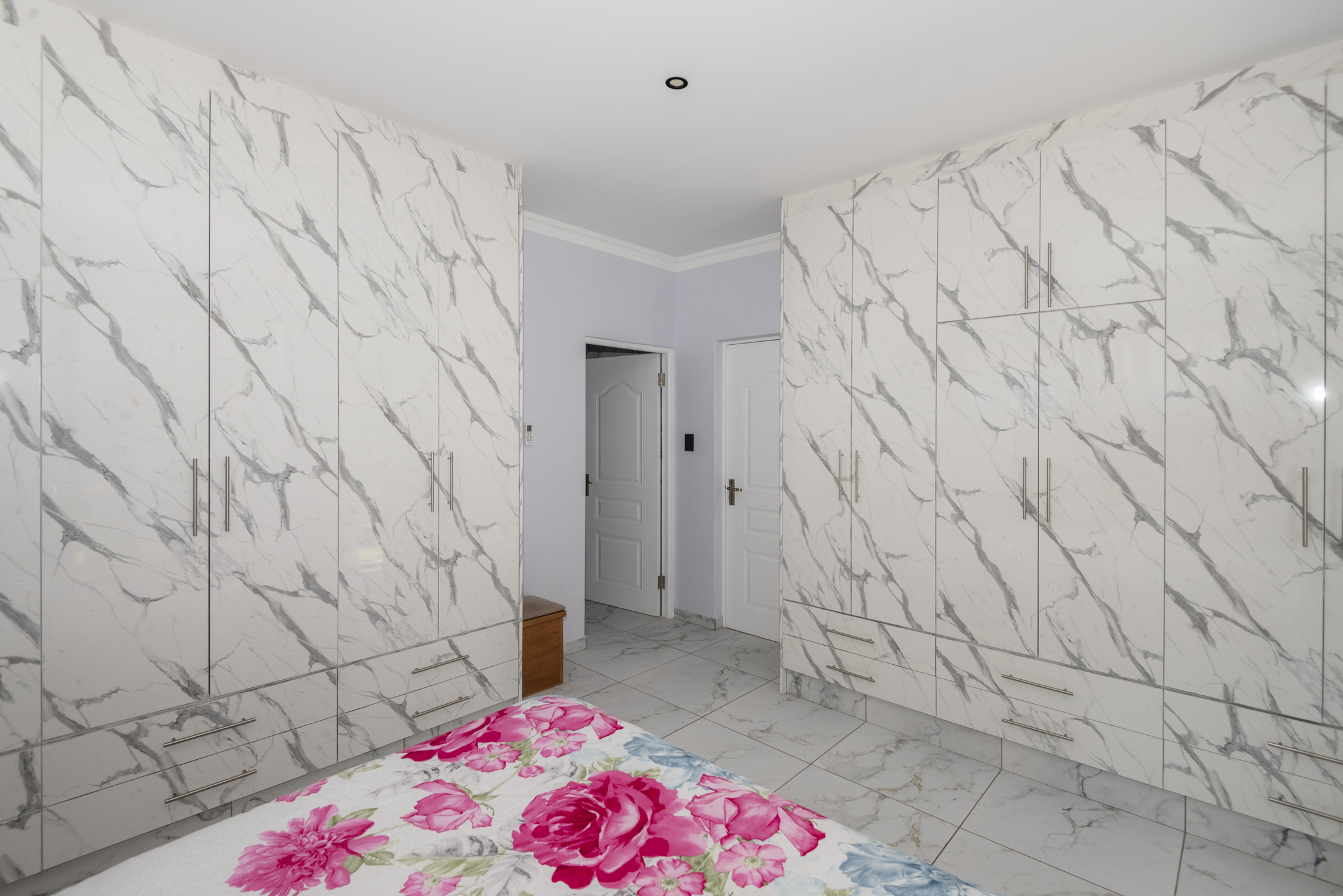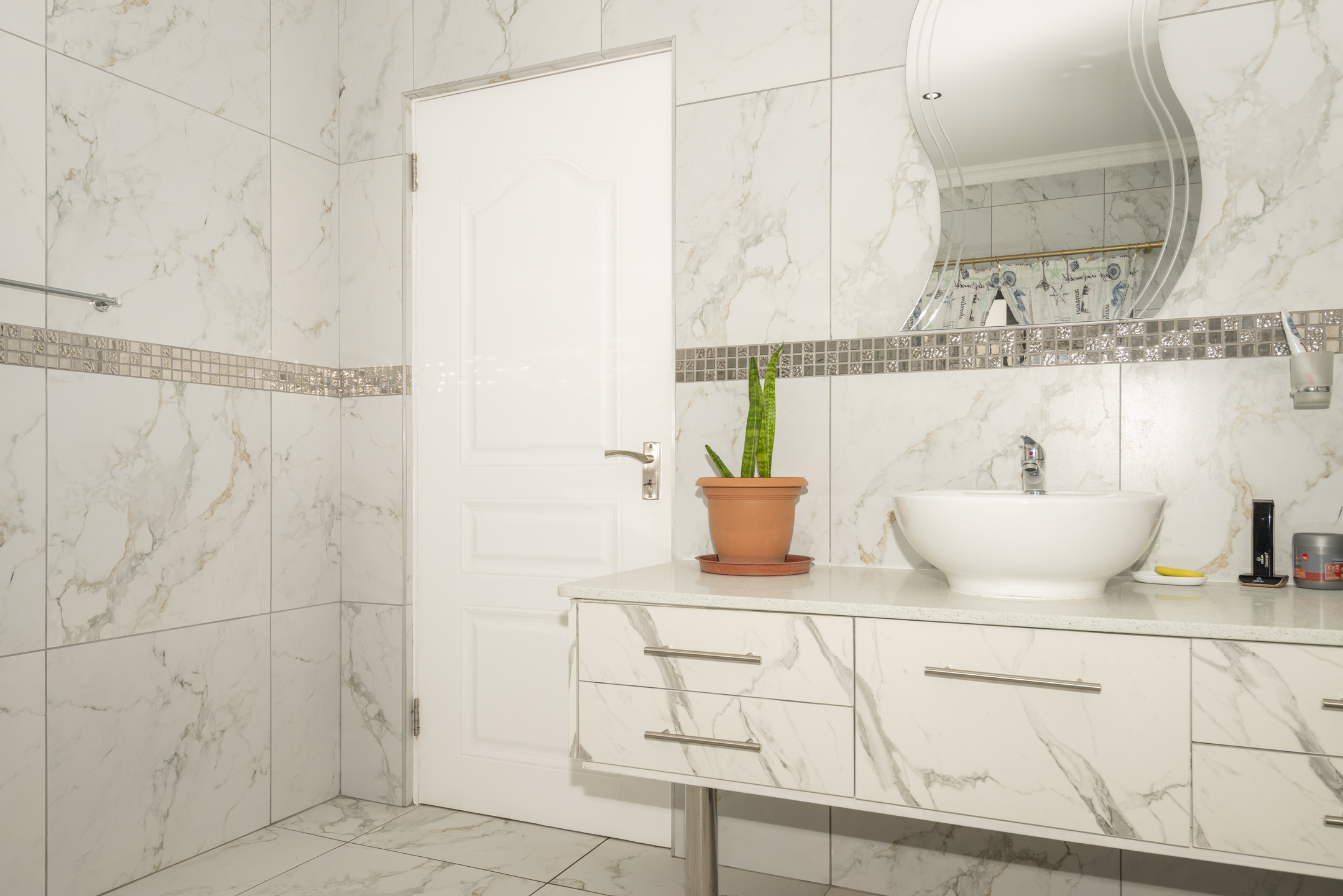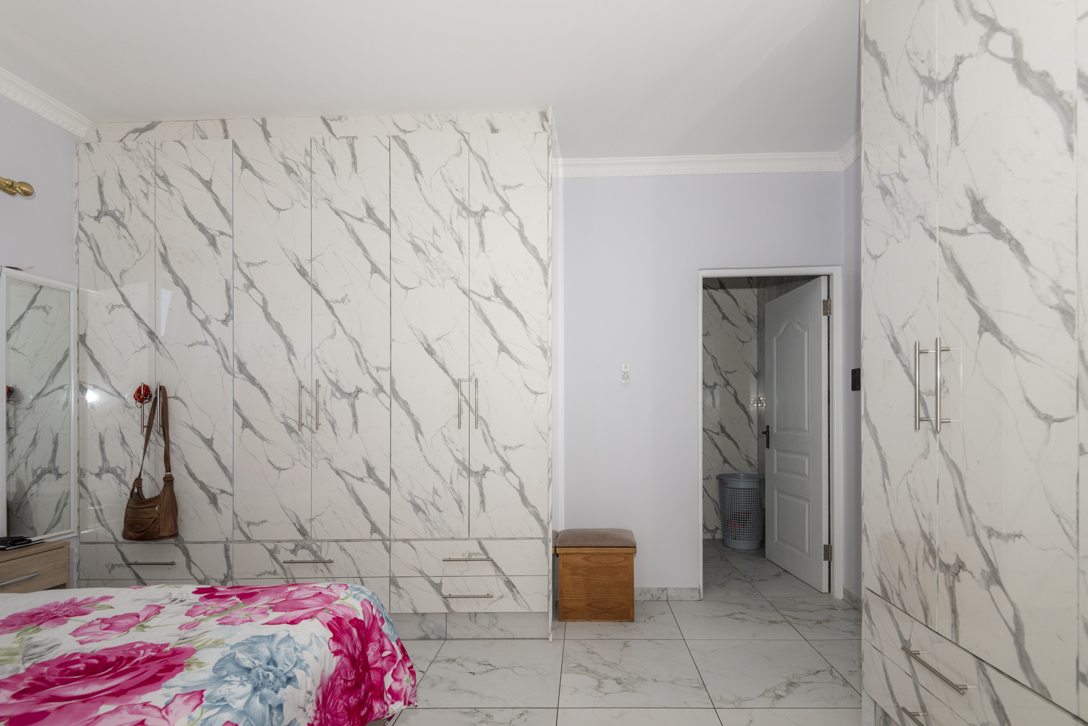 Lovingly maintained by its original owner, the home presents as brand new — showcasing stylish marble floors, a beautifully appointed kitchen with engineered stone countertops, and a striking waterfall centre island. The open-plan layout creates a natural flow from the living and dining spaces to the enclosed braai room and outdoor firepit boma — perfect for entertaining all year round.