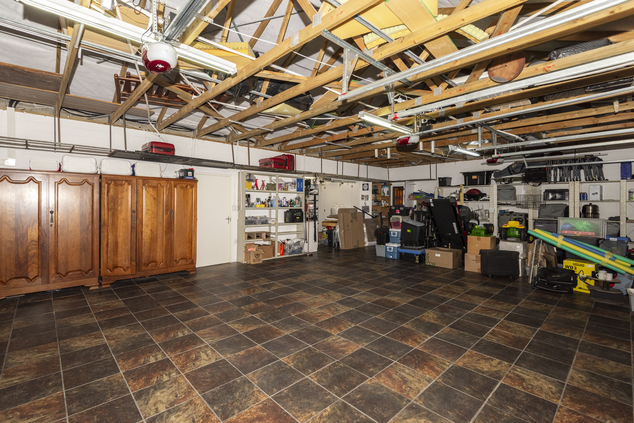 - Enormous Garaging: Three tiled garages with loads of shelving, storage capacity, and built-in cupboards, plus separate outside access.