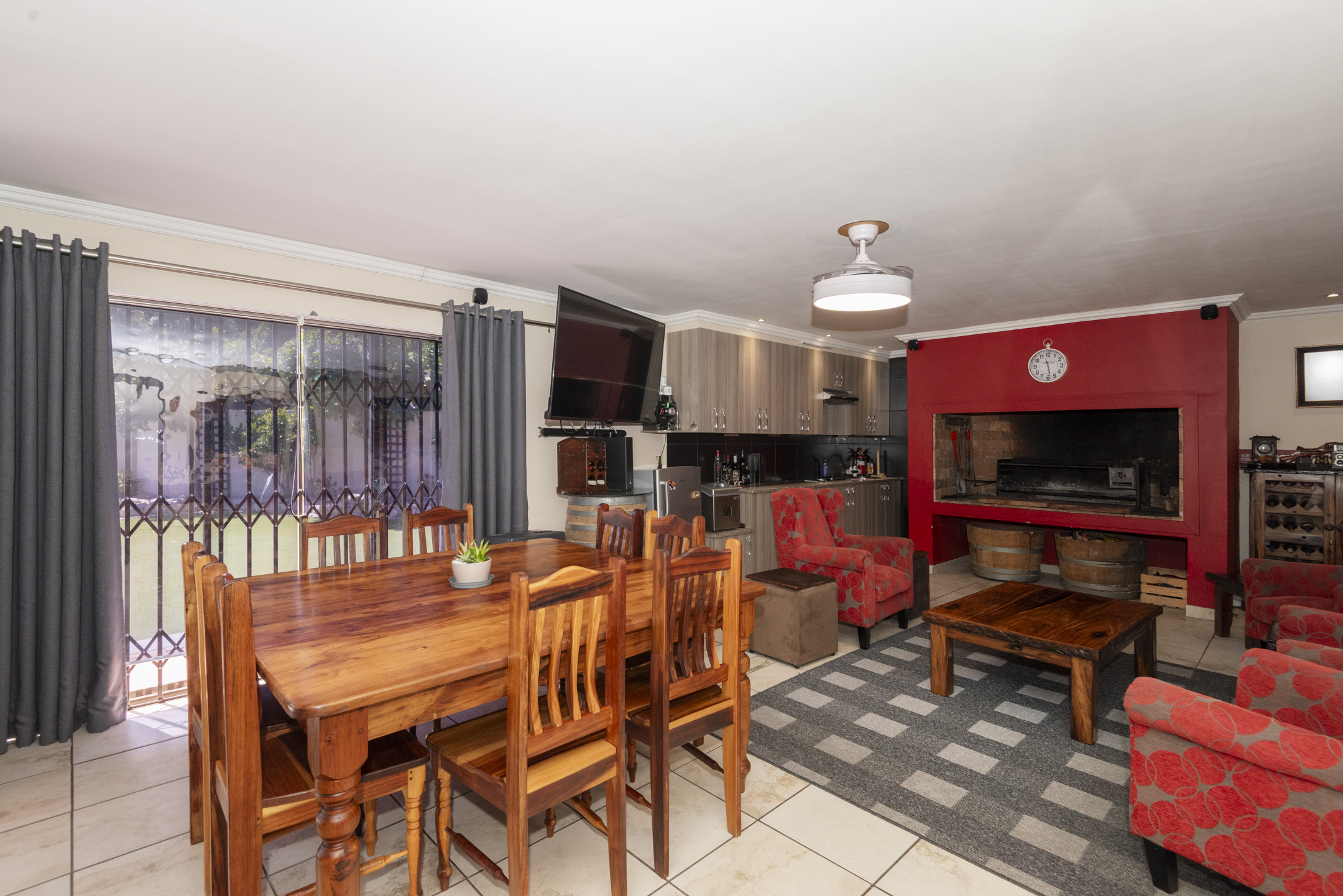 - The second entertainment wing is truly exceptional, comprising a cozy lounge with a fireplace and an XXL Braai Room—an entertainer's dream. This space boasts a second gas hob, a custom-built bar, and a banqueting station. Both entertainment areas open via stacker doors to a generous, covered patio fitted with an adjustable louvre roof system, ensuring perfect year-round enjoyment while overlooking the pool and tranquil garden.