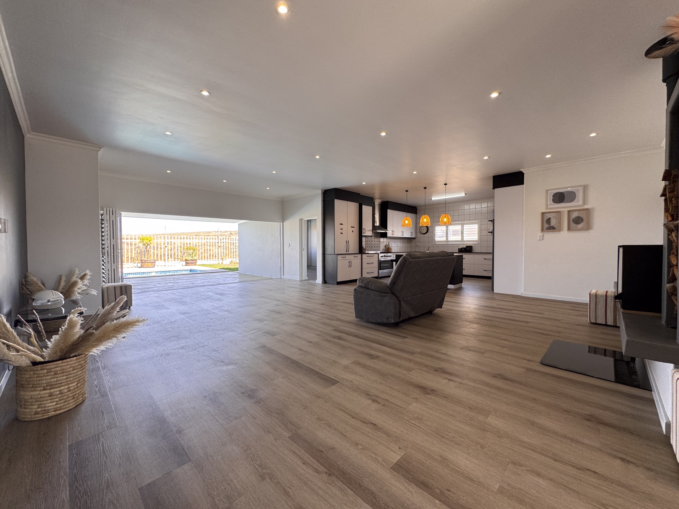 From the lounge the stacking doors open up completely onto a wood deck (under roof) and then the sparkling blue heated splash pool sits just off the deck.