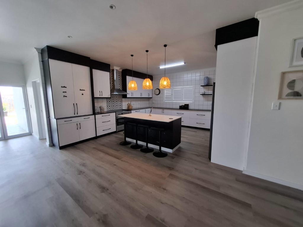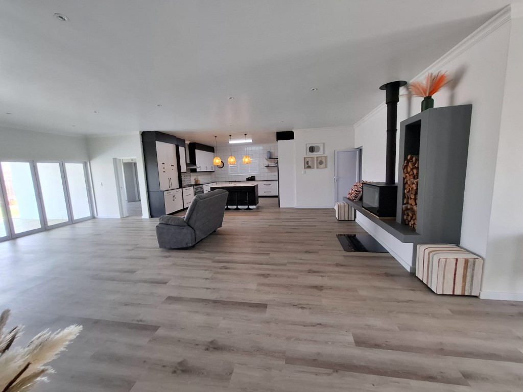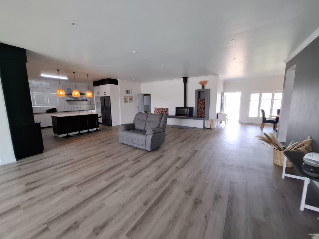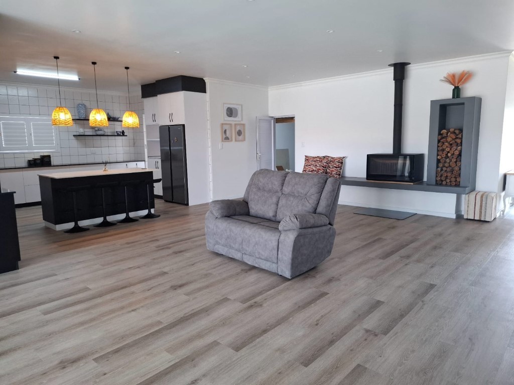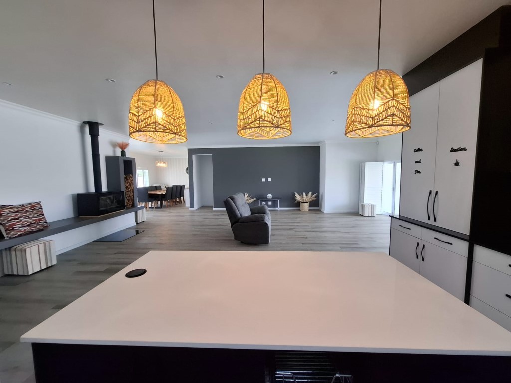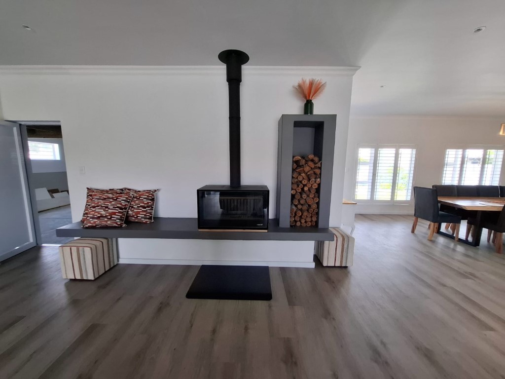 This elegant home features open-plan living at its best, with a spacious lounge flowing seamlessly into a designer kitchen complete with a central island, Caesarstone and engineered granite countertops, quality finishes, and a separate scullery. A wood-burning stove adds warmth and charm for cosy winter evenings.