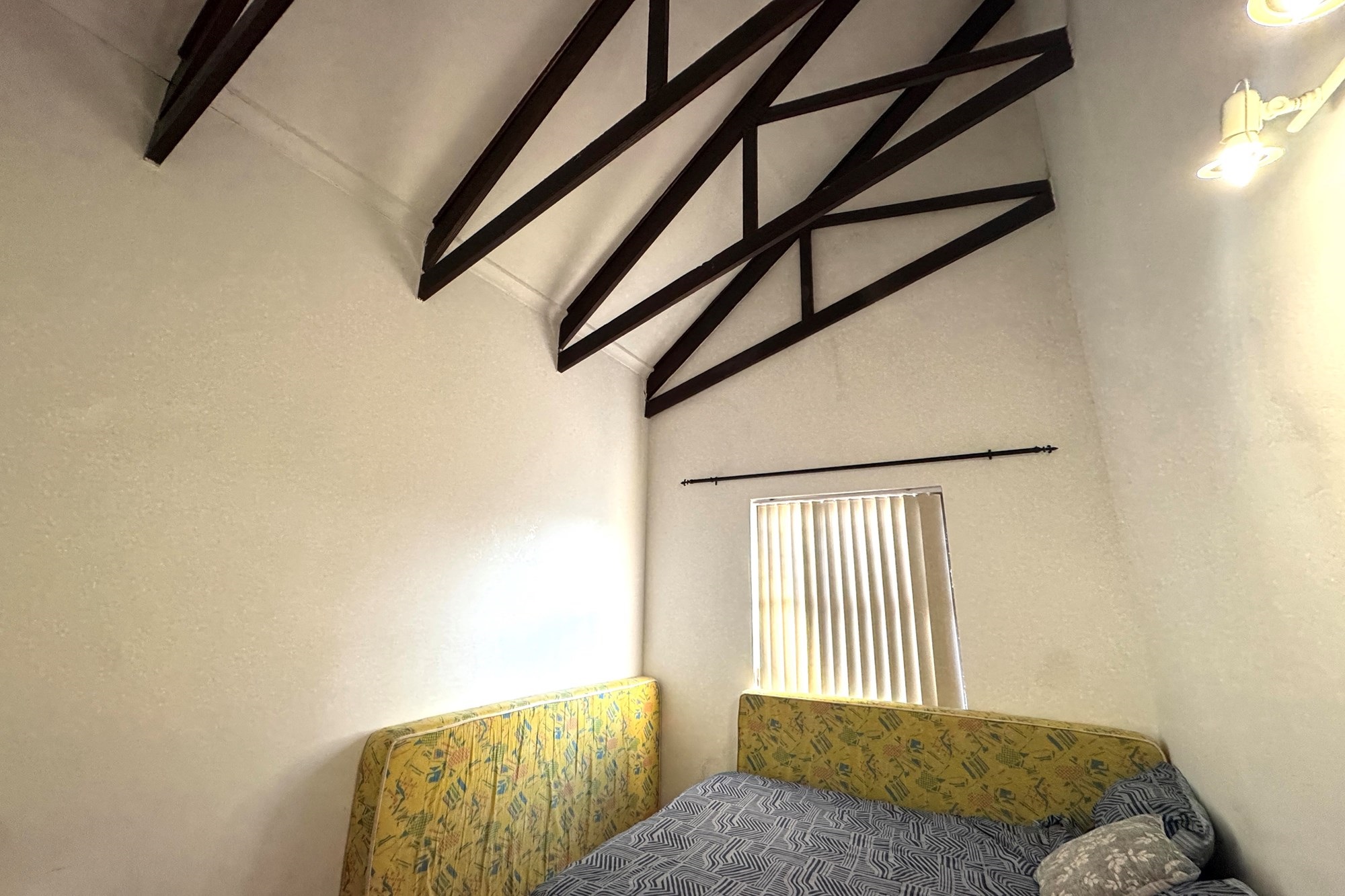 Ground Floor: Three sunny bedrooms, each with built-in cupboards and open trusses.