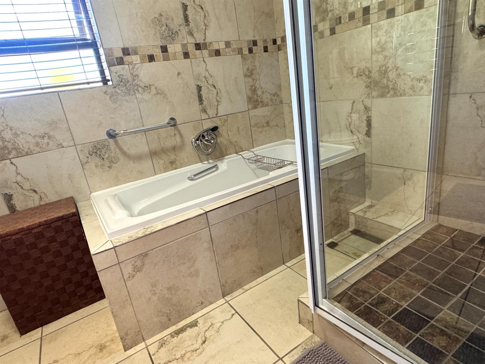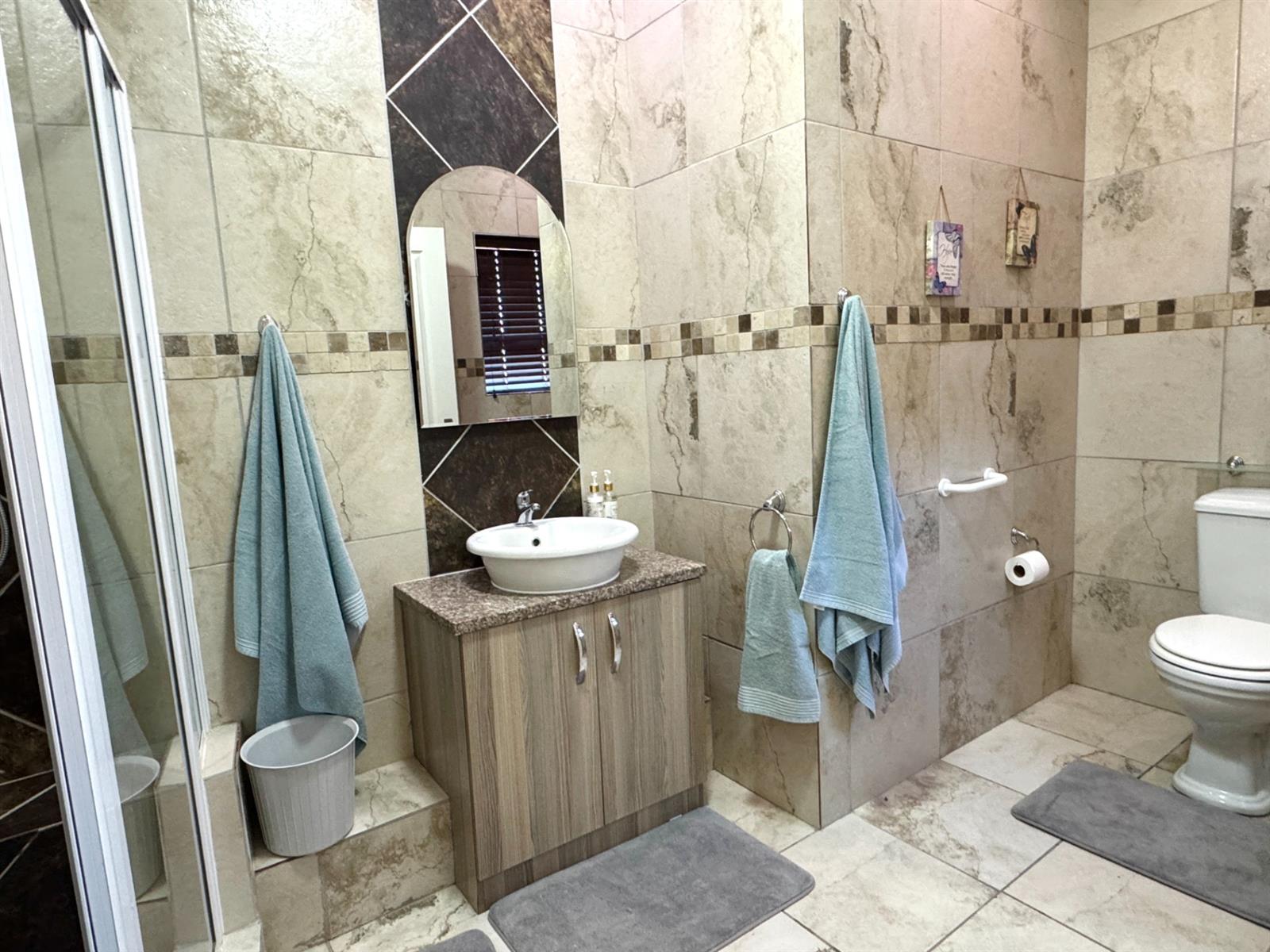 The bedroom wing, privately secured with a security door, includes three sunny and well-sized bedrooms. Two bedrooms share a modern full family bathroom, while the master suite offers generous proportions and its own en-suite bathroom. A fourth bedroom—also large—includes a walk-in shower, making it ideal for an elderly resident or guests.