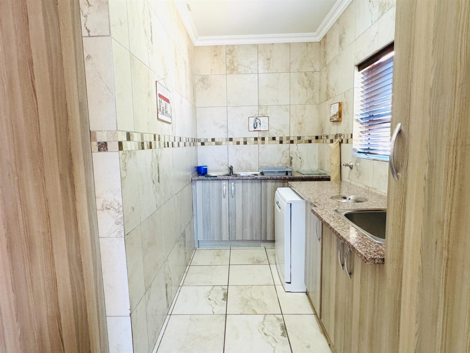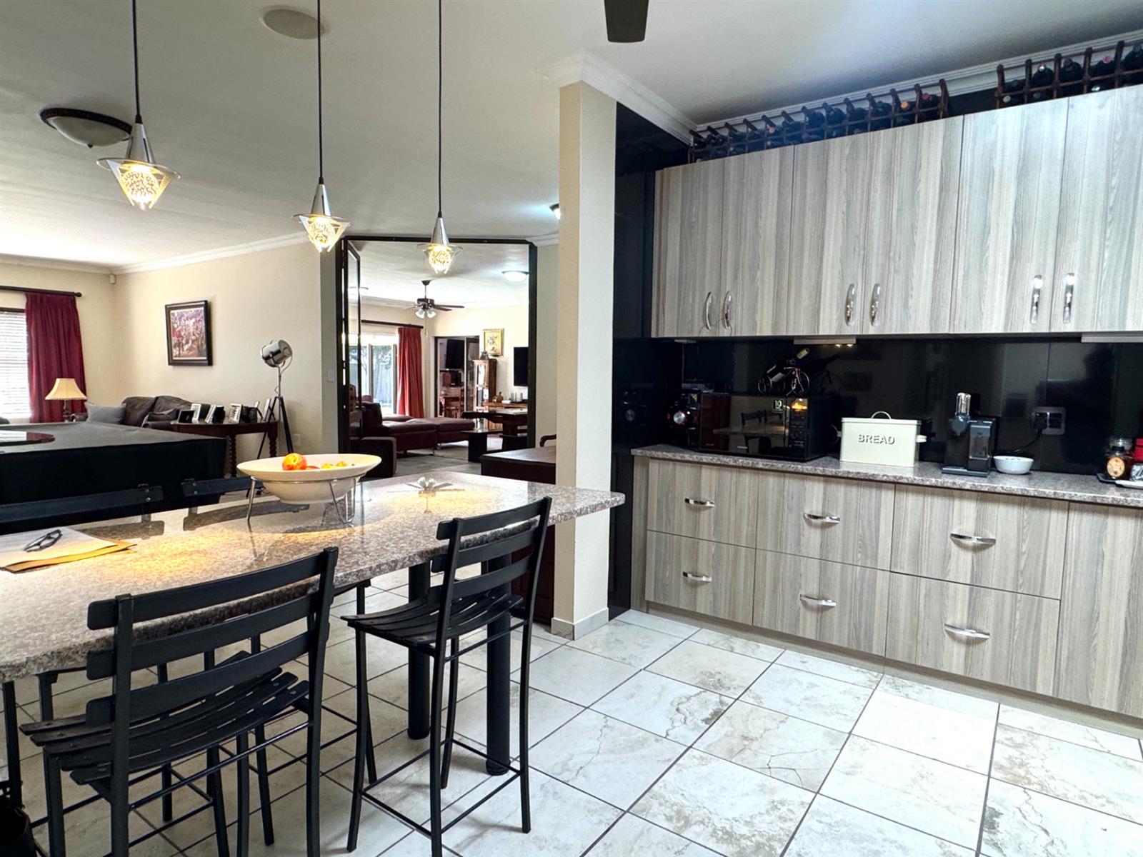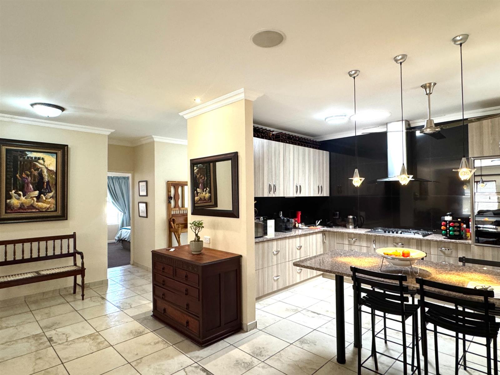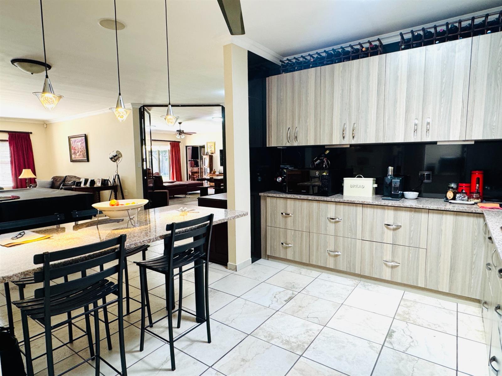 You are welcomed by a spacious entrance hall that sets the tone for the home’s warm and airy atmosphere. The main lounge is expansive and connects beautifully with a modern, functional kitchen. The kitchen boasts clean contemporary finishes, ample working space, and a separate scullery and laundry—ideal for a busy family.