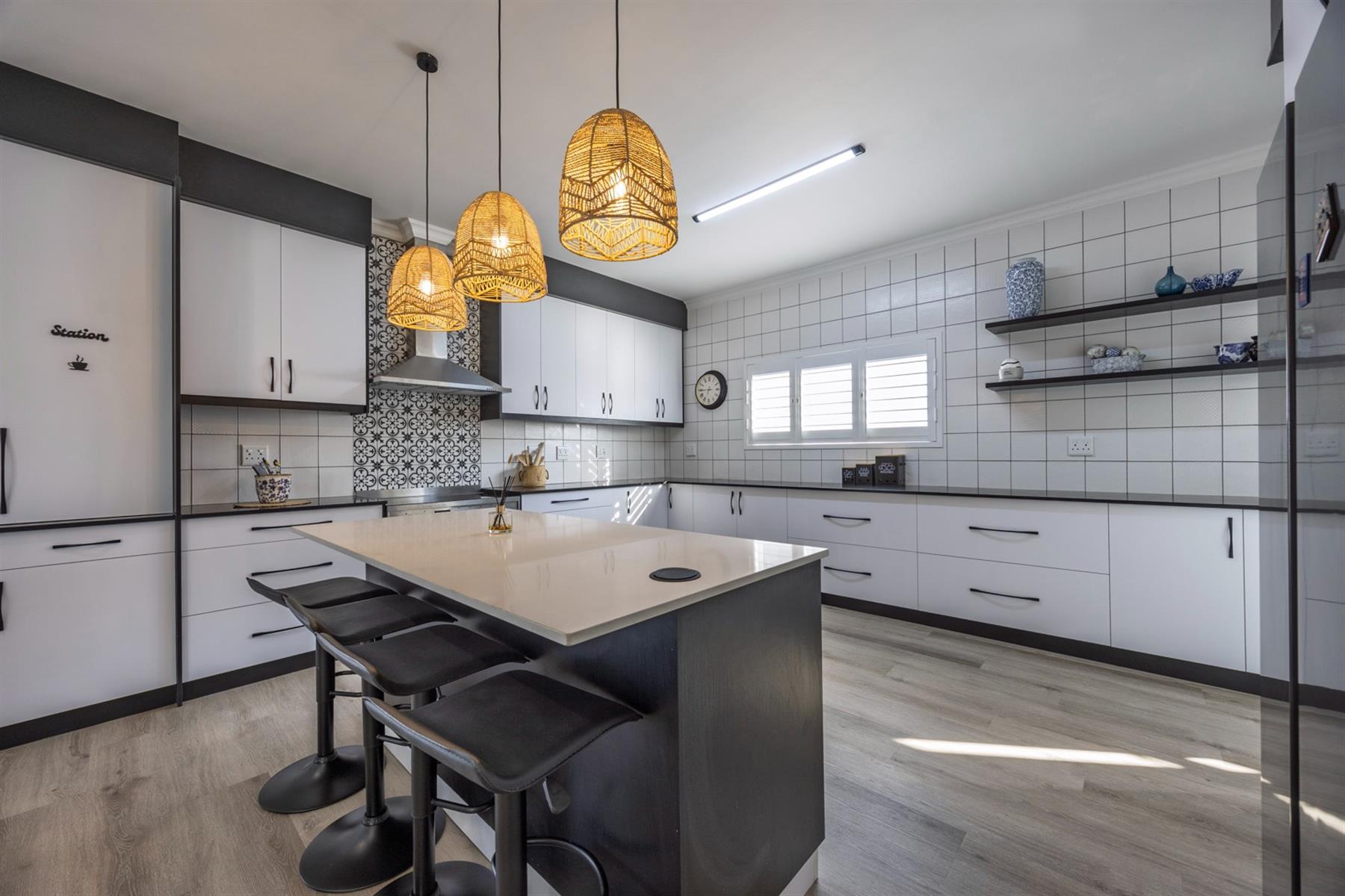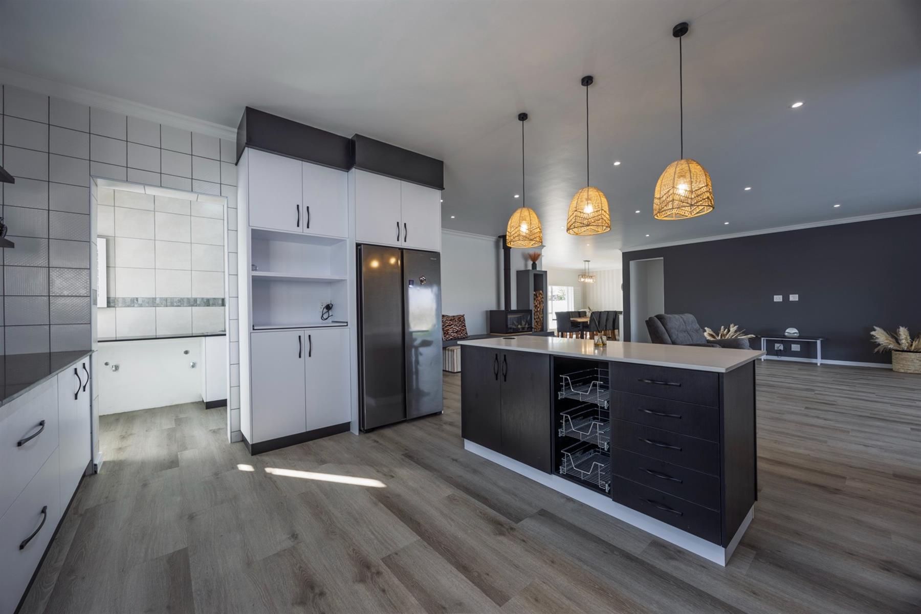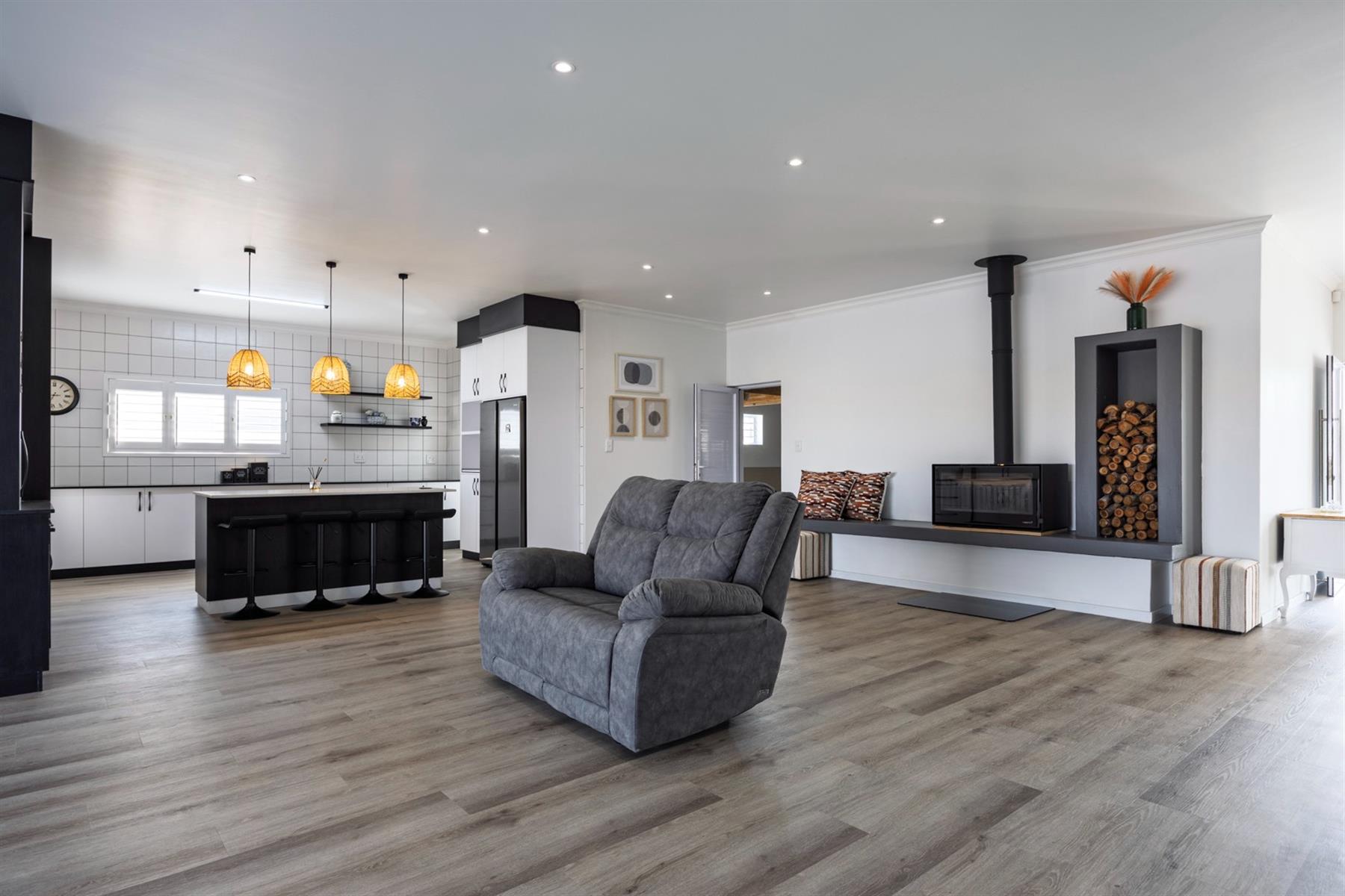 The home opens into a light-filled, open-plan living and dining space anchored by a sleek contemporary fireplace. A bespoke modern kitchen with Caesarstone and engineered granite tops, soft-close cabinetry, and a separate scullery keeps the space both elegant and practical.