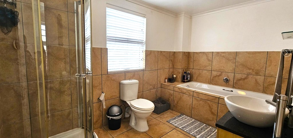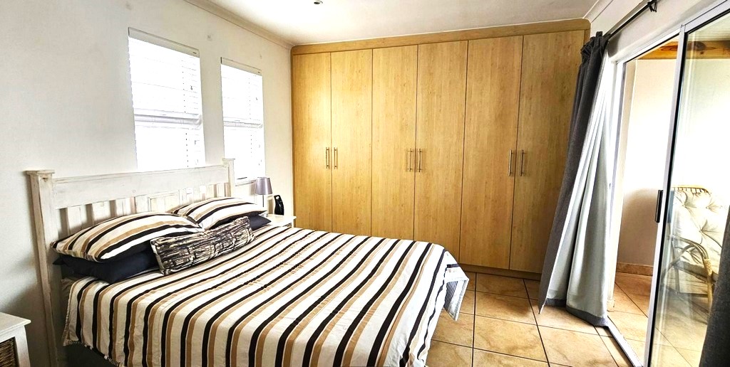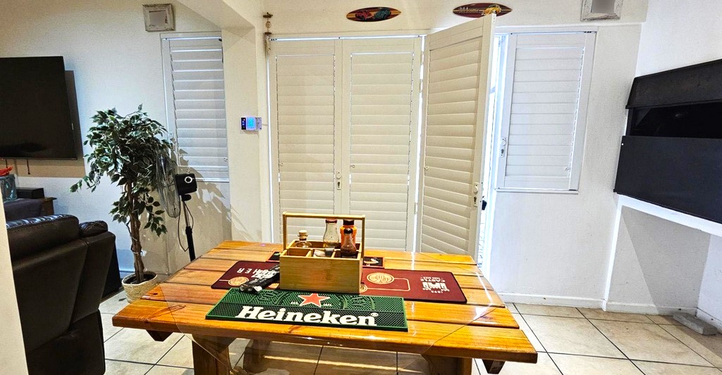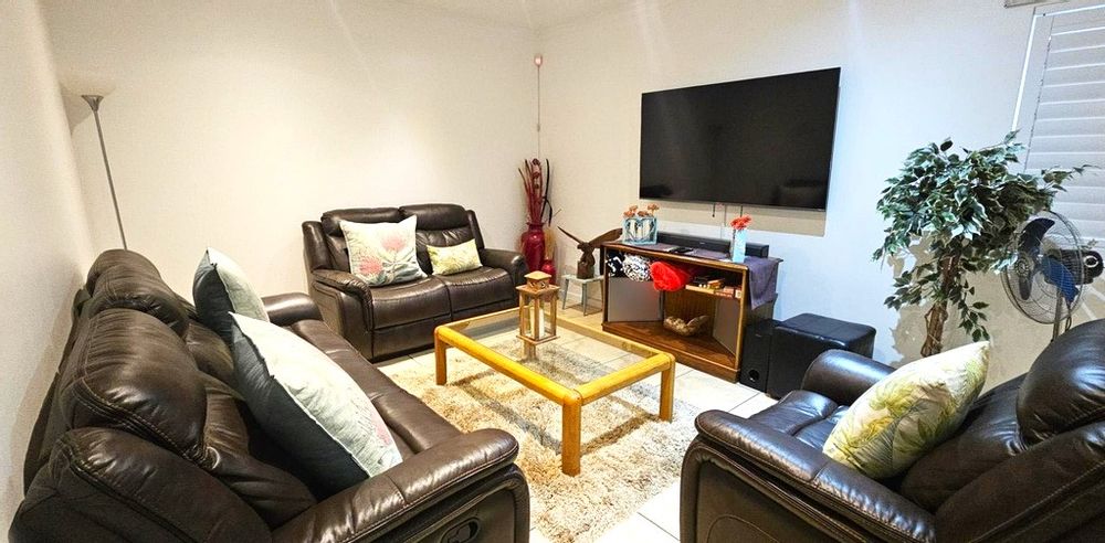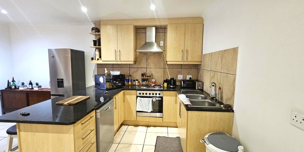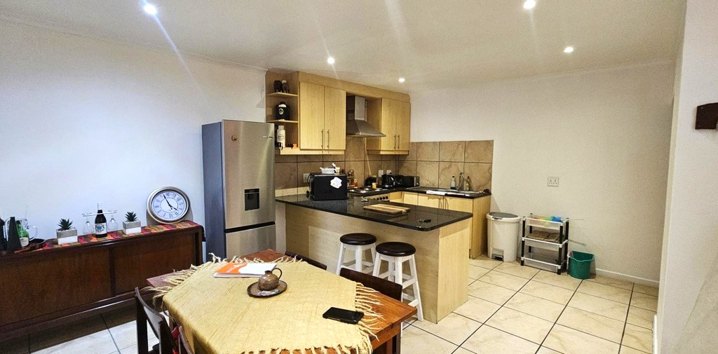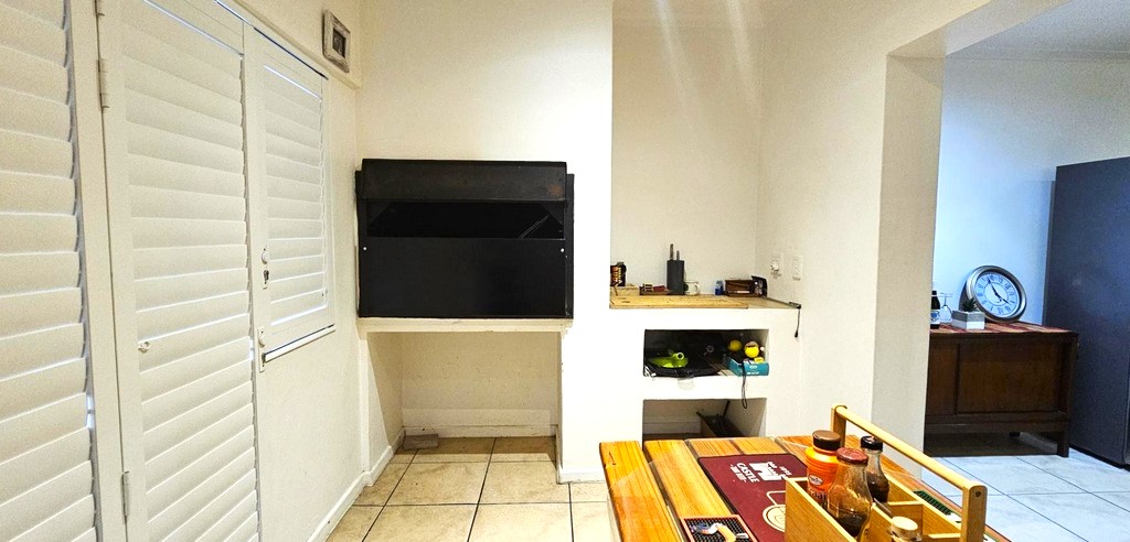 The open-plan kitchen is fitted with granite countertops, oven, hob, and a breakfast nook, flowing seamlessly into the spacious lounge and dining area with a built-in braai, perfect for entertaining flowing seamlessly into the other two rooms