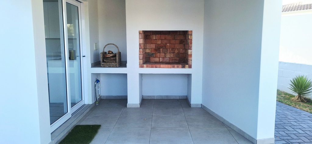 Sliding doors open to a sheltered outdoor braai area, creating the perfect wind-protected space for relaxed entertaining, effortlessly connecting the braai to the kitchen counter for easy serving.