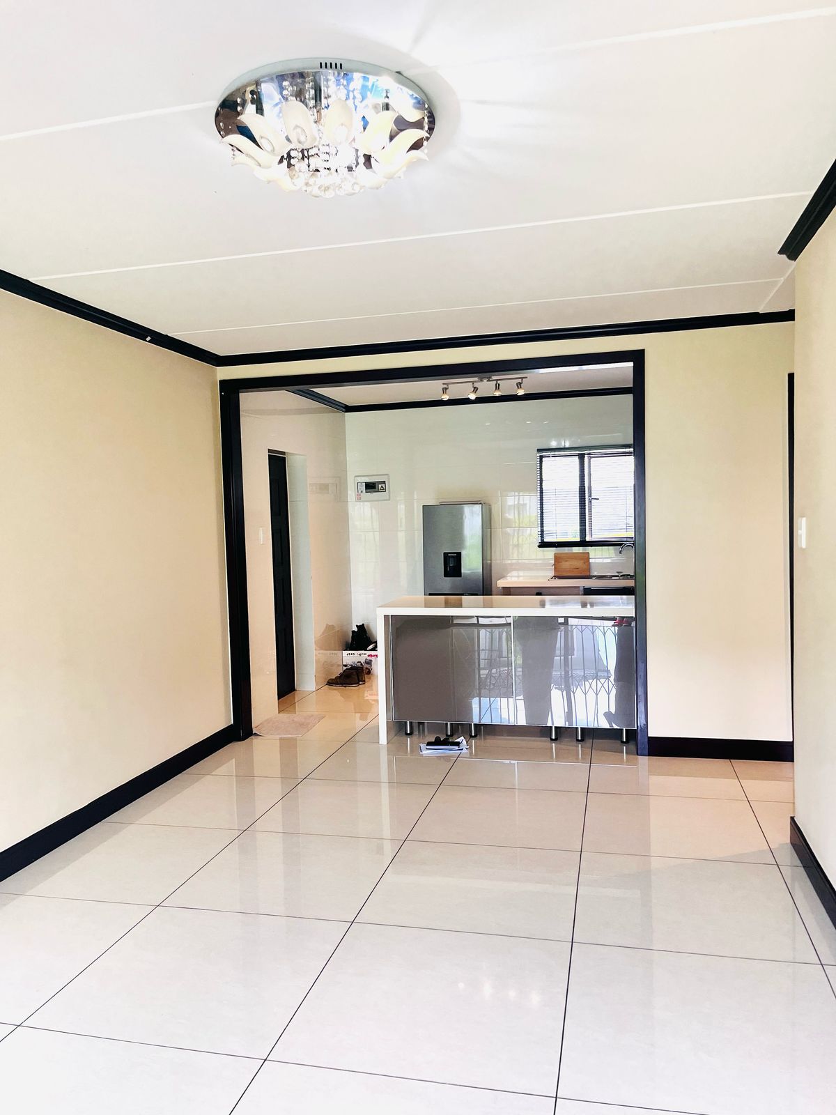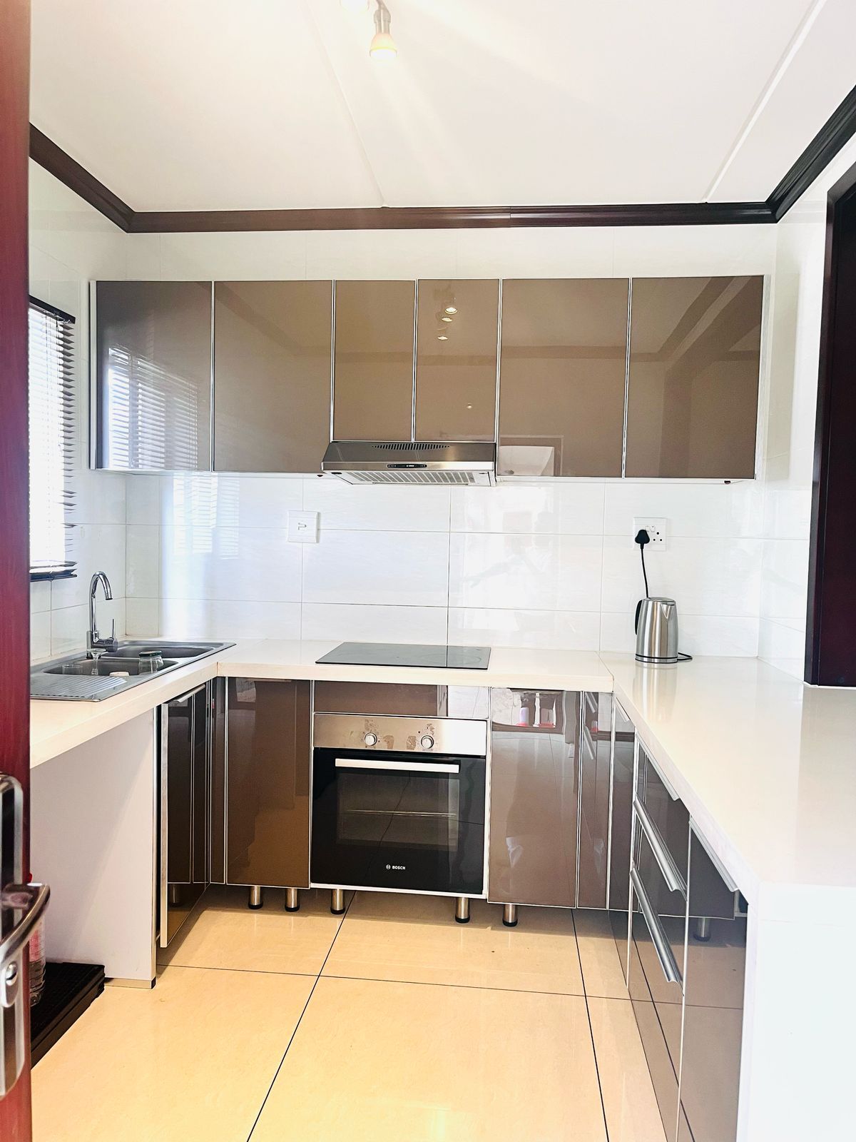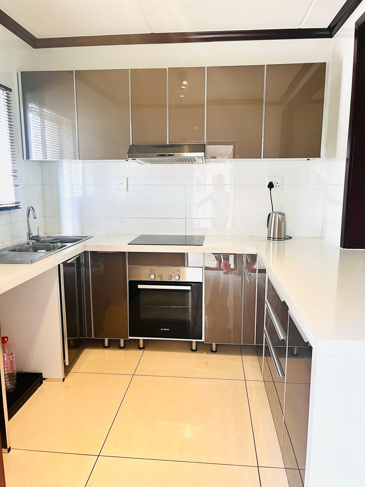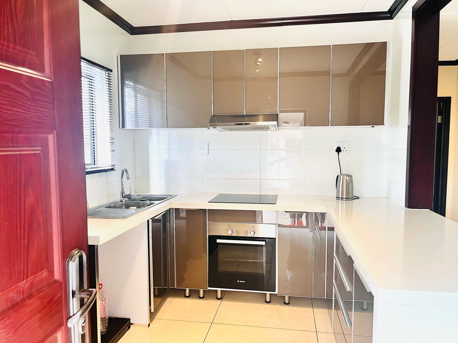 The open-plan layout seamlessly integrates the kitchen and lounge, creating a bright and airy space perfect for both entertaining and relaxing. Large windows flood the living area with natural light, creating a welcoming ambiance. The living room offers ample space for lounging, while the kitchen is a chef’s dream, featuring sleek cabinetry, high-quality countertops. Whether you’re preparing a quick meal or hosting friends and family, this kitchen is both functional and stylish.